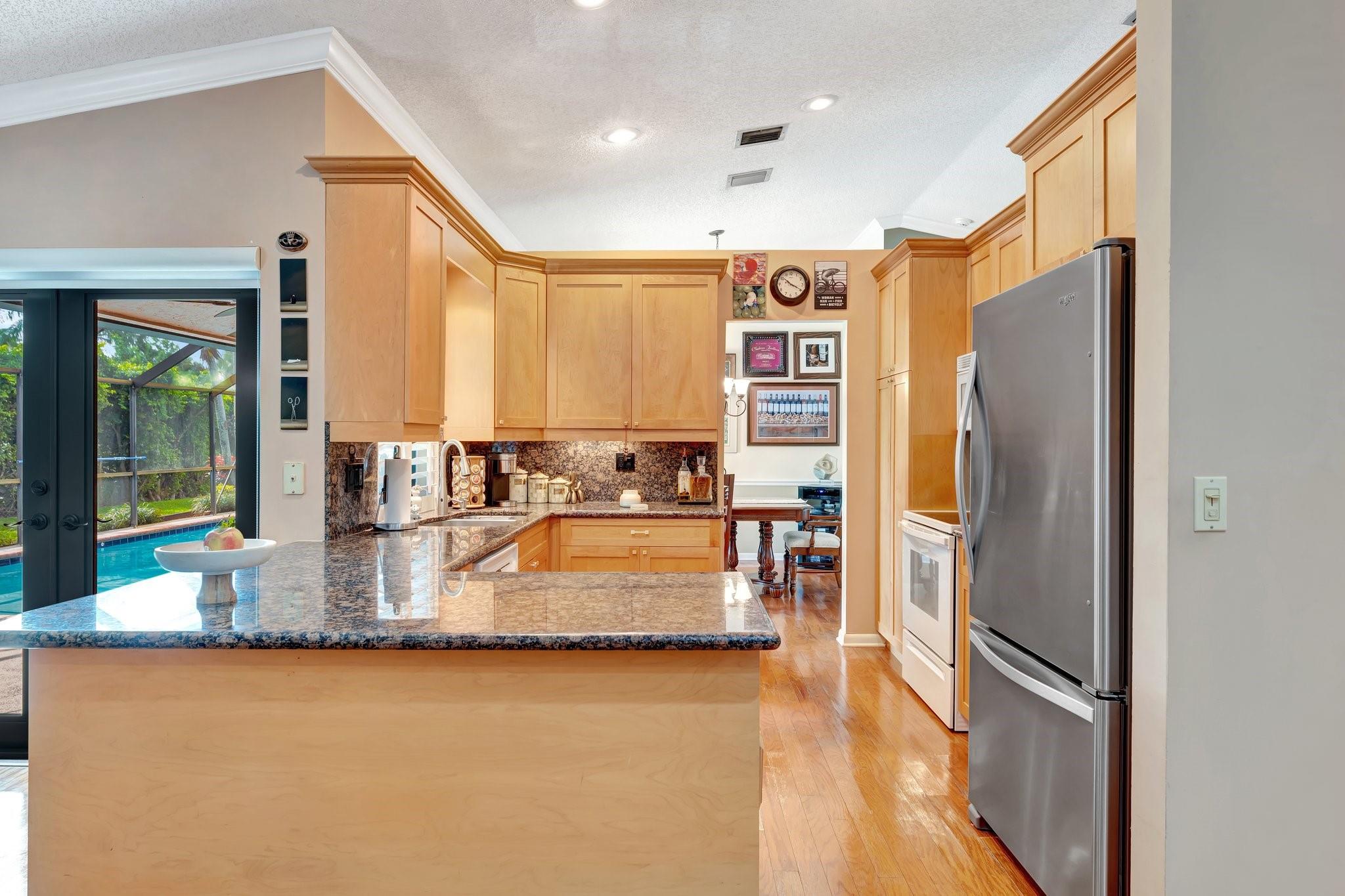 BEAUTIFUL 4/2 POOL HOME IS NESTLED ON A QUIET OVERSIZED CUL-DE-SAC AND OFFERS THE PERFECT BLEND OF STYLE & FUNCTIONALITY. FULLY IMPACT WINDOWS & DOORS FOR STORM PROTECTION. UPDATED KITCHEN COMPLETE W/SOLID WOOD CABINETS, UNDER CABINET LIGHTING, GRANITE COUNTERTOPS, NEW SS REFRIGERATOR, PULL-OUT CABINETRY & LAZY SUSAN. THE OPEN LIVING AREAS ARE ENHANCED W/HARD WOOD FLOORING, CROWN MOLDINGS & PLANTATION SHUTTERS. PRIMARY CABANA BATH FEATURES A MODERN VANITY W/EXTRA STORAGE, MAKEUP MIRROR, LARGE WALK-IN SHOWER W/A BUILT-IN CORNER BENCH & ELEGANT MARBLE ACCENT. GUEST BATH REMODELED W/STYLISH ITALIAN VANITY, WOOD LIKE TILED FLOORING & SEAMLESS GLASS SHOWER DOOR. THE SCREENED-IN PATIO SURROUNDS A CUSTOM POOL OVERLOOKING OVERSIZED PIE SHAPED LOT. ALL WITHIN WALKING DISTANCE OF THE SCHOOLS.