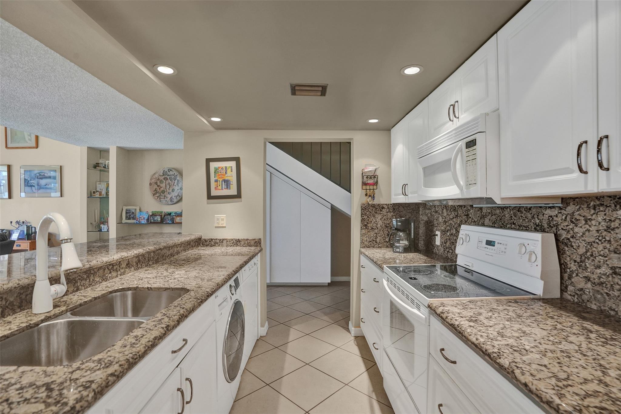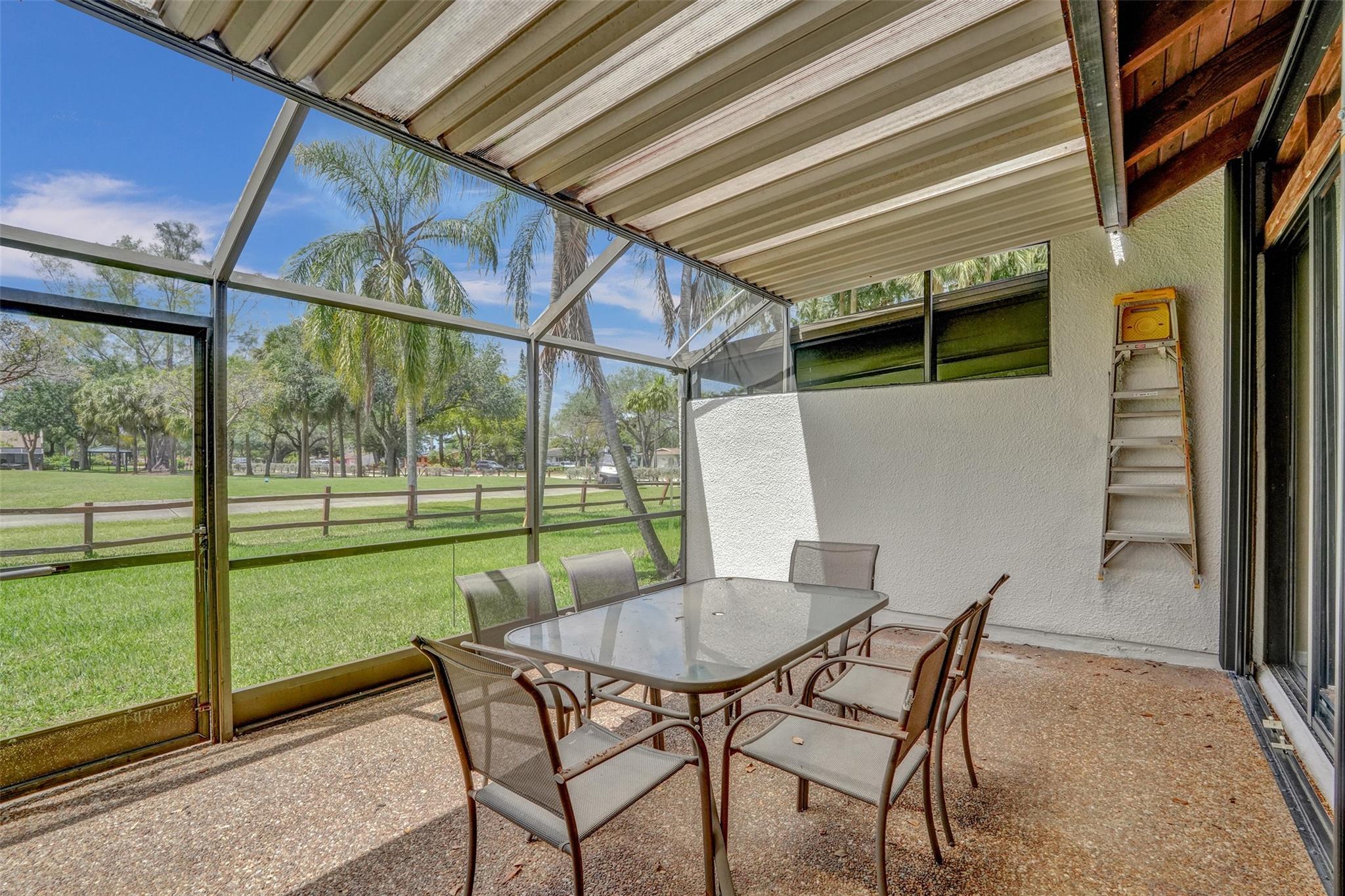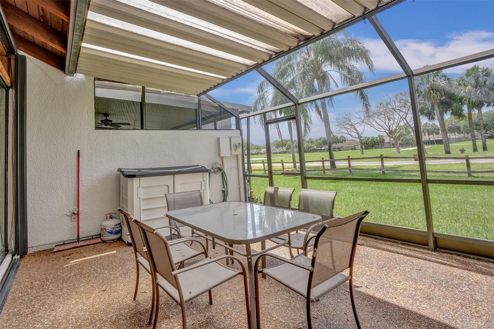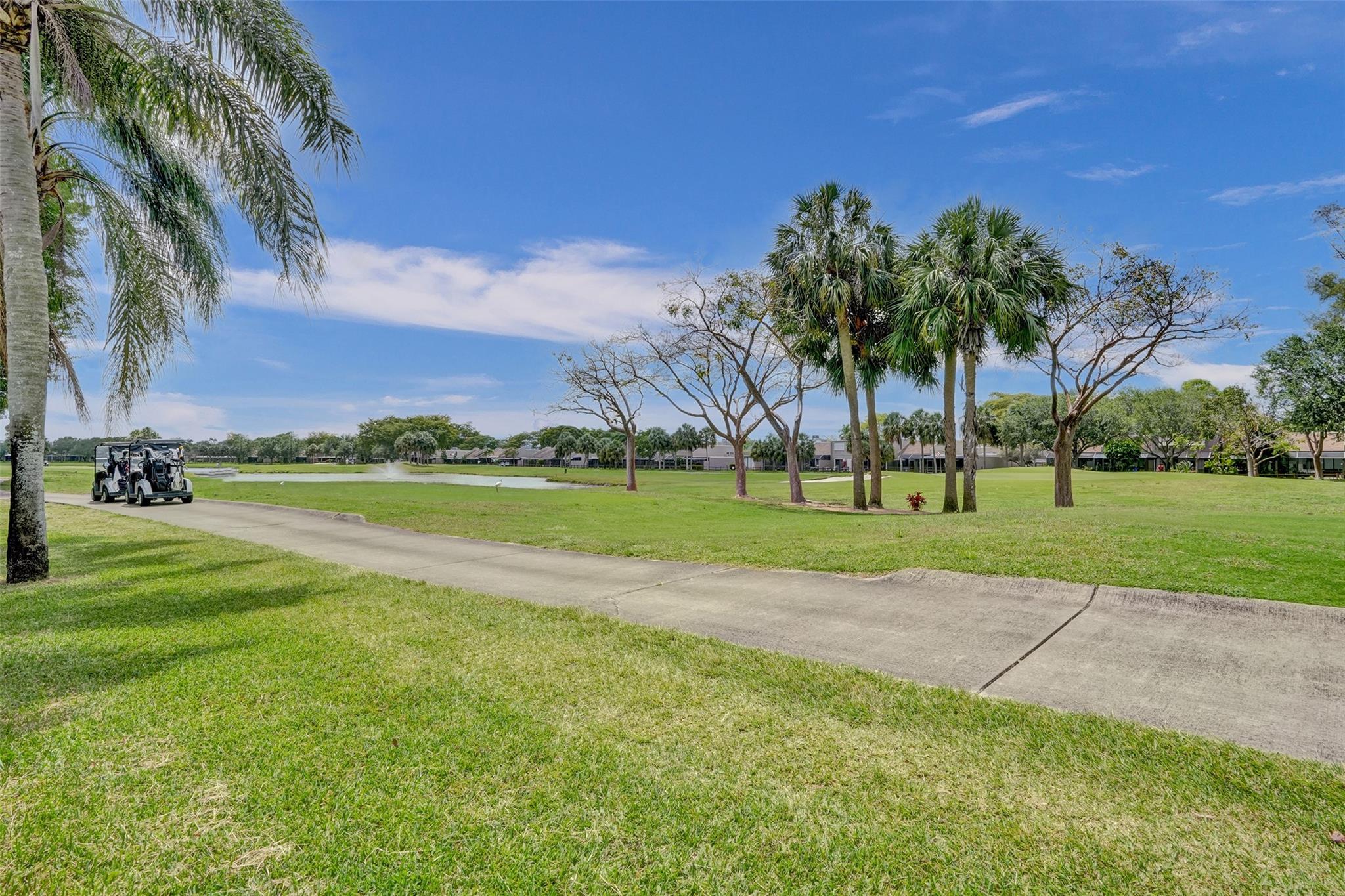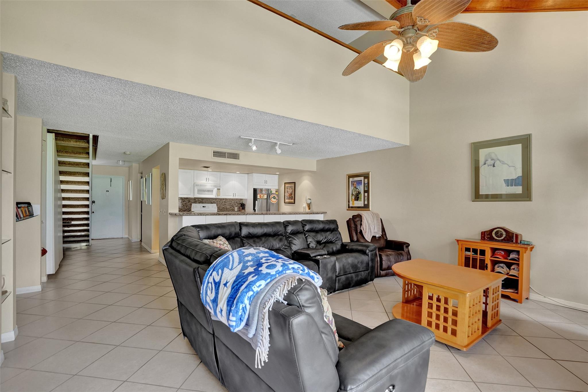 Incredible Golf Course views! This is a great opportunity to live on the golf course. This split level home has soaring high ceilings that make this unit feel grand and open. Large living area open to screened porch where you can sit and enjoy the lifestyle S Fla offers. Updated kitchens with stone counters and white timeless cabinets. The kitchen opens nicely into the living and dining area, No closed off kitchens here. Both Bathrooms have been tastefully remodeled with high end finishes. Storm shutters for all windows and doors. Great storage space. 2 assigned parking. Great community with pool. tennis, pickle ball. Low maint fee of $125/month. This home has it all !