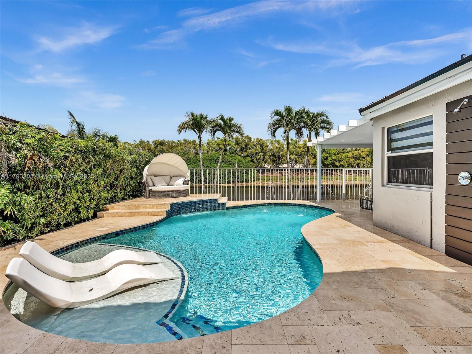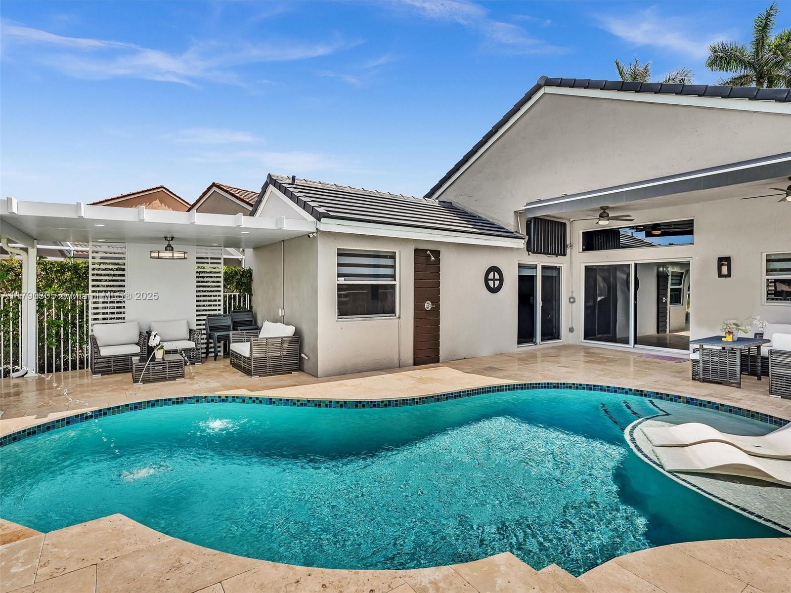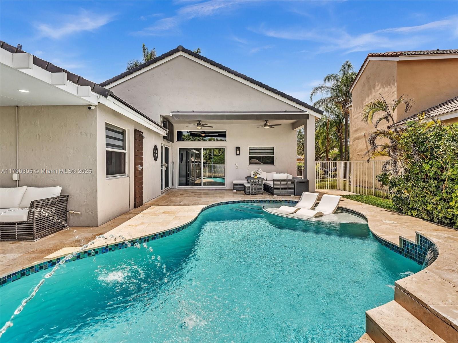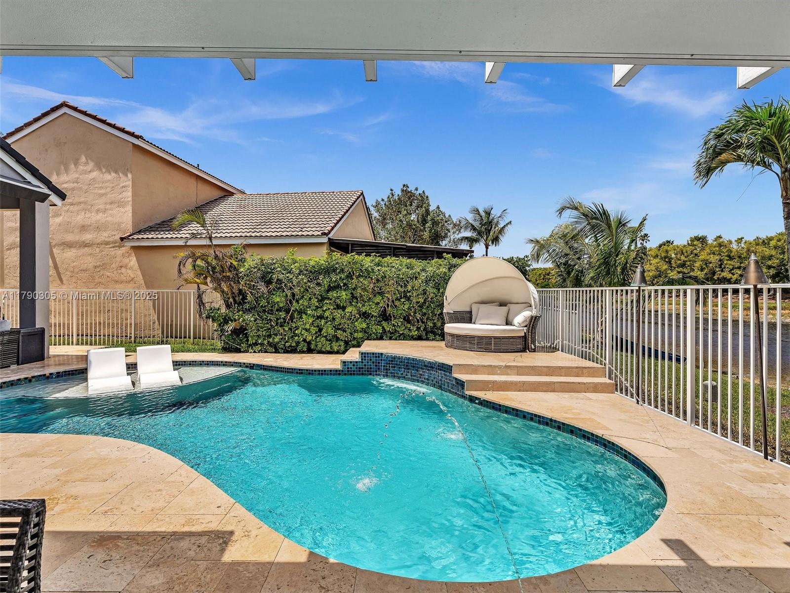 Stunning lakefront pool home in The Falls, Weston. Fully renovated & move-in ready! New 2025 roof, 2024 exterior paint, tile in living, luxury vinyl floor in bedrooms. Modern kitchen & baths with quartzite counters. Custom wall unit with electric fireplace. Saltwater pool with travertine deck, LED lights, and heater. Electric awnings, additional pergola, outdoor shower, aluminum fencing. 2023 Rheem A/C, zebra shades, electric rollers on sliders. Travertine paver driveway. Gated community with A+ schools. Easy to show!! Bring your buyers.