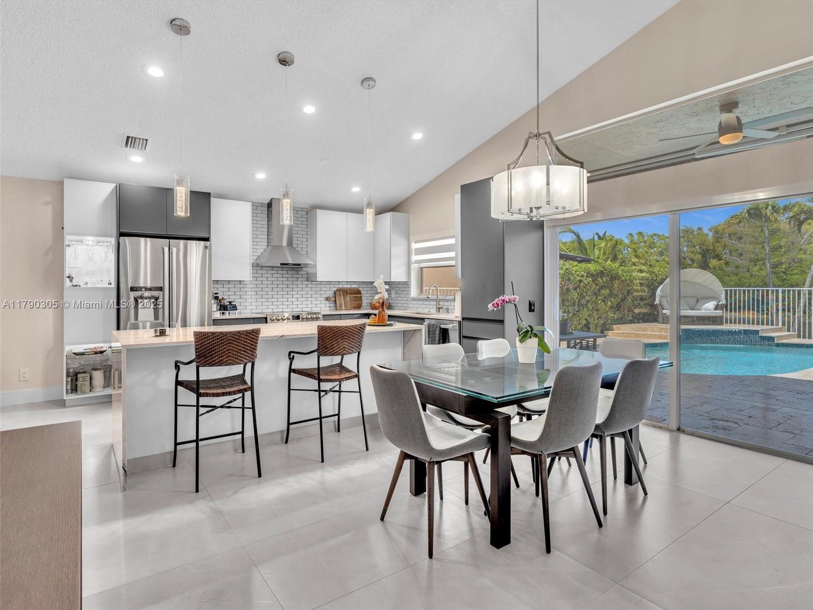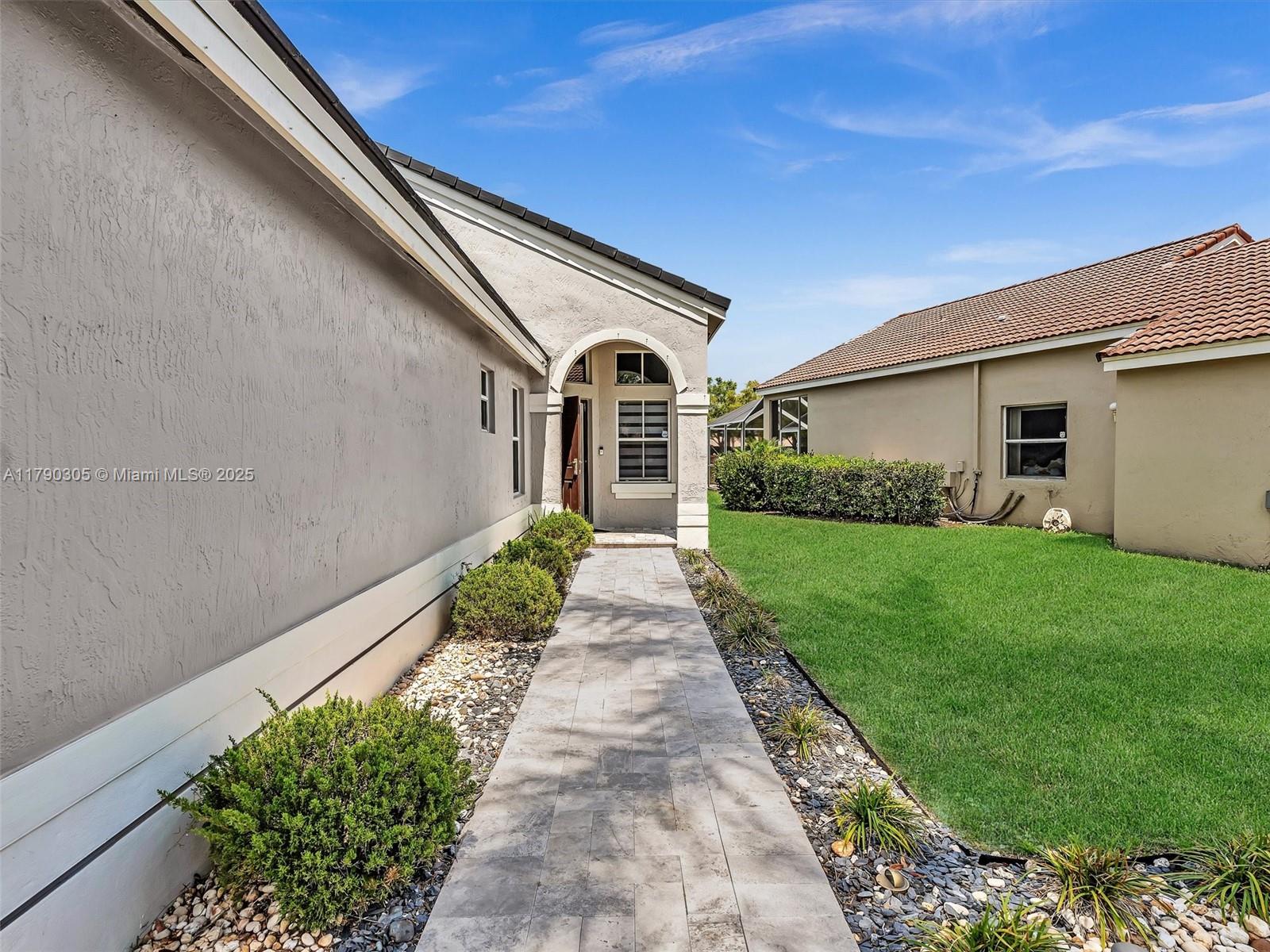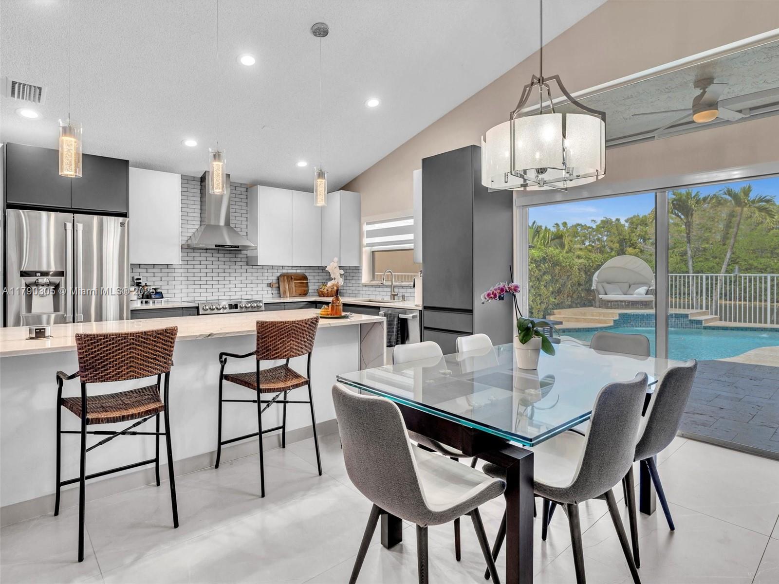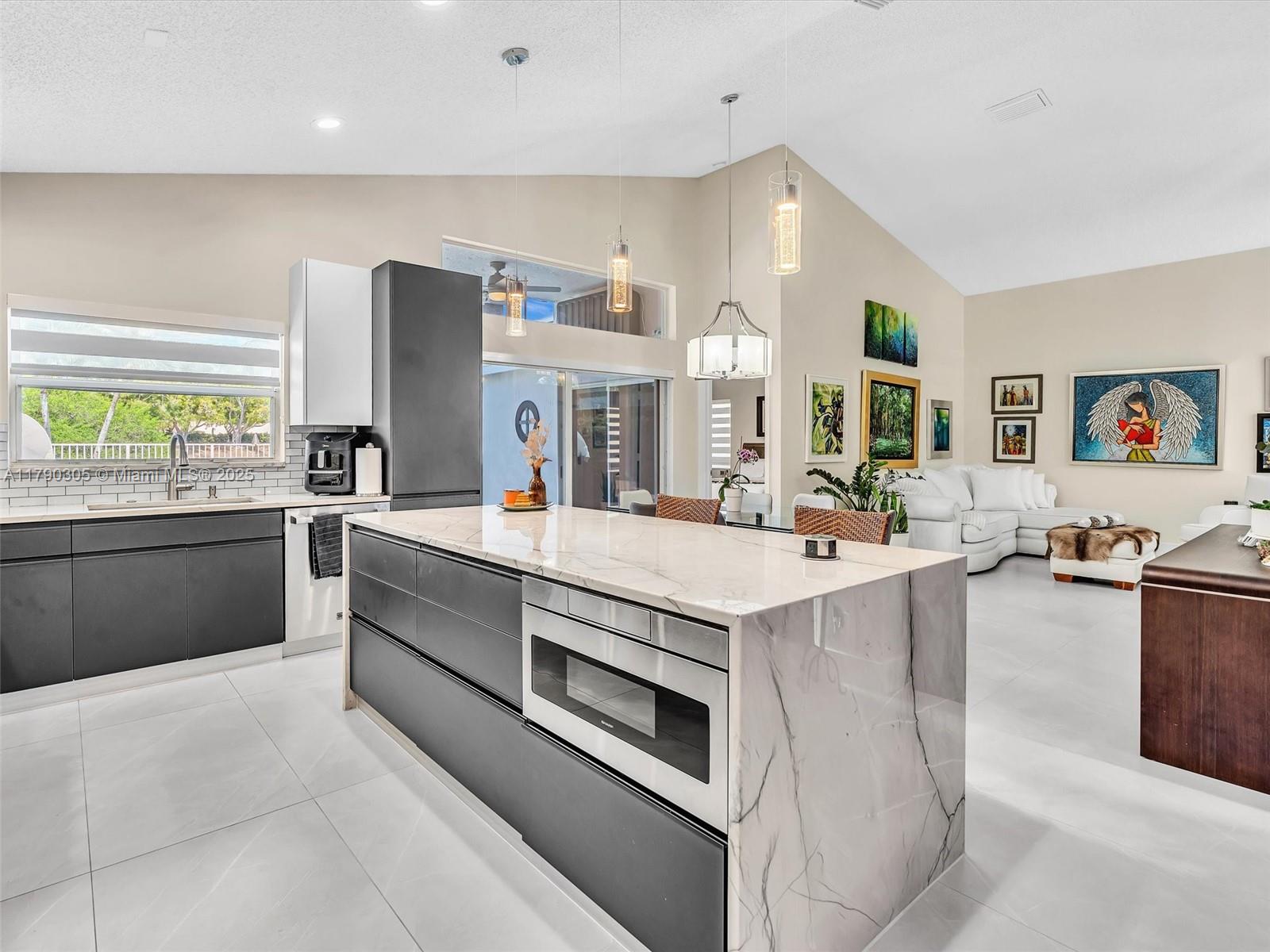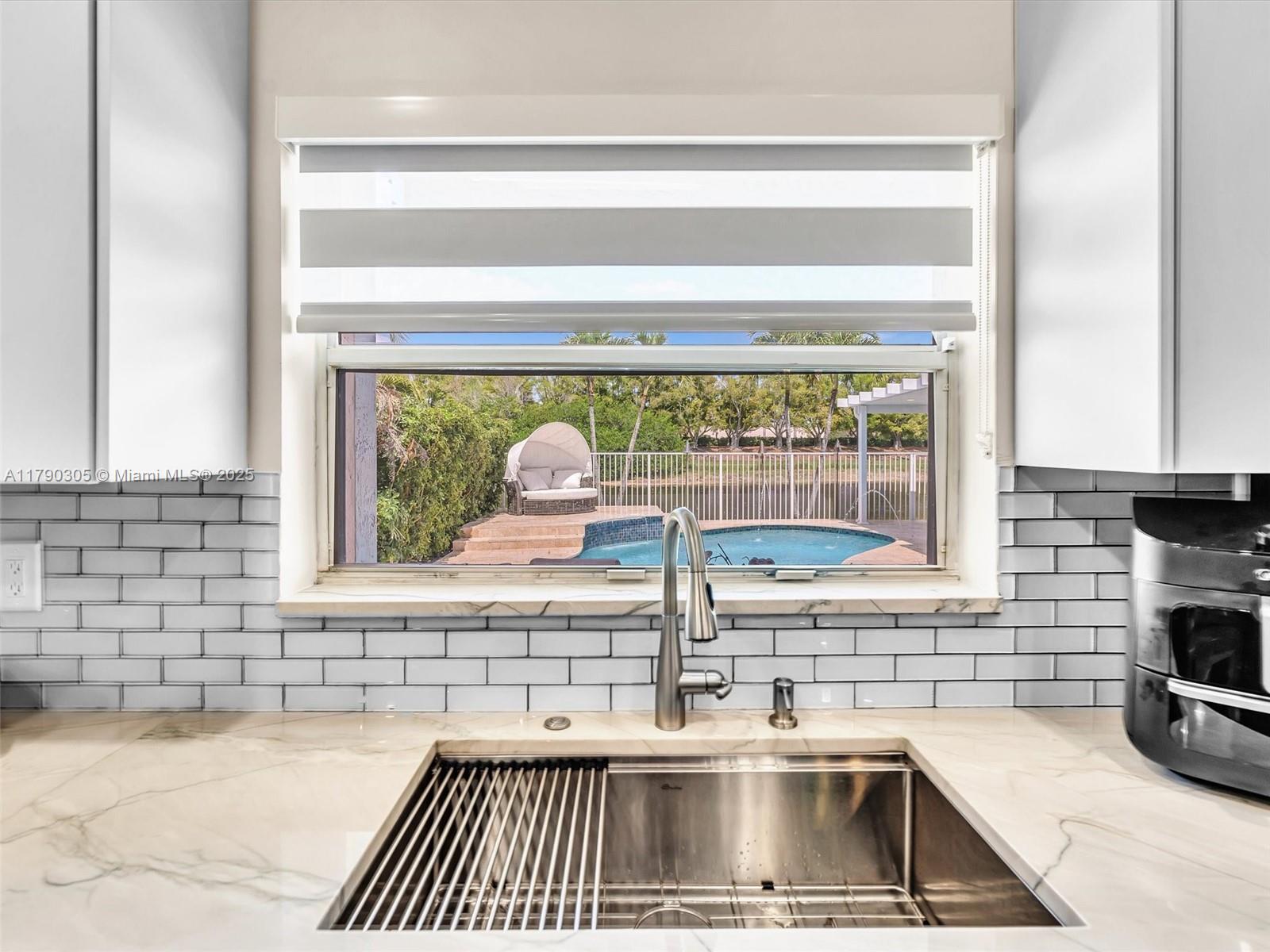 Stunning lakefront pool home in The Falls, Weston. Fully renovated & move-in ready! New 2025 roof, 2024 exterior paint, tile in living, luxury vinyl floor in bedrooms. Modern kitchen & baths with quartzite counters. Custom wall unit with electric fireplace. Saltwater pool with travertine deck, LED lights, and heater. Electric awnings, additional pergola, outdoor shower, aluminum fencing. 2023 Rheem A/C, zebra shades, electric rollers on sliders. Travertine paver driveway. Gated community with A+ schools. Easy to show!! Bring your buyers.