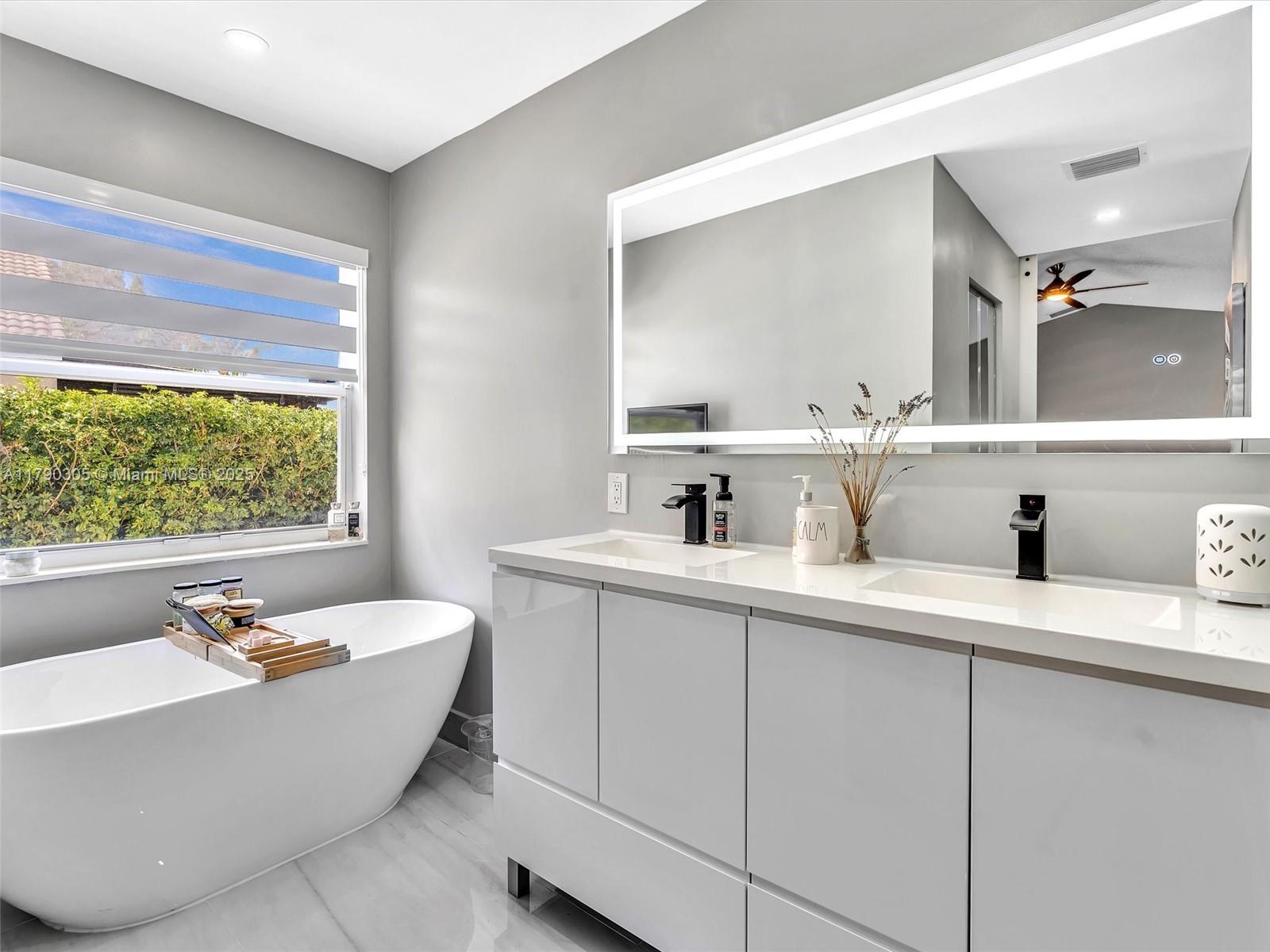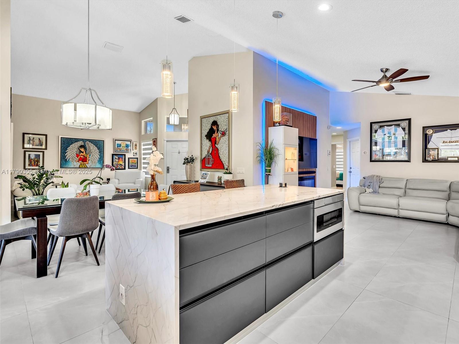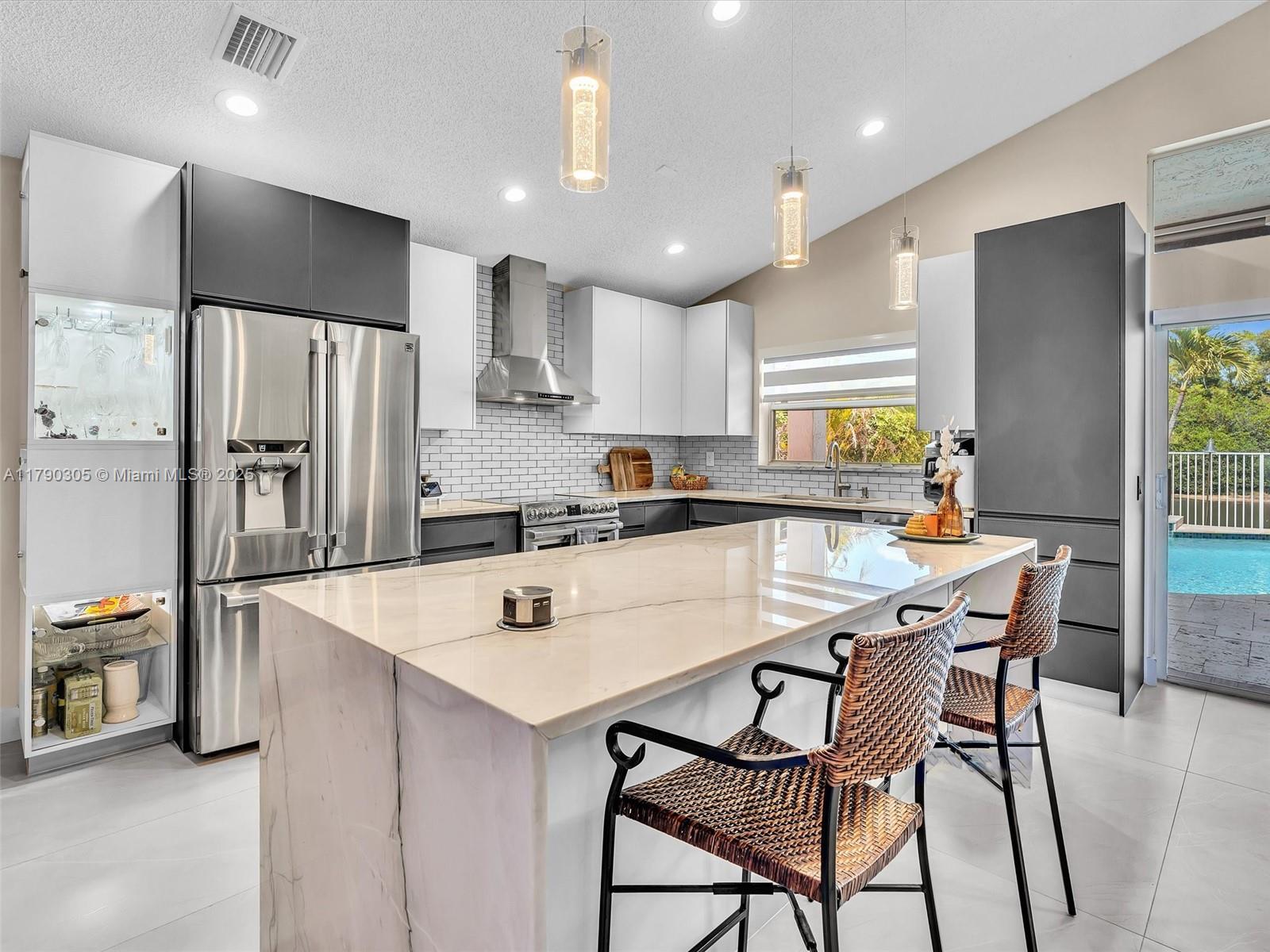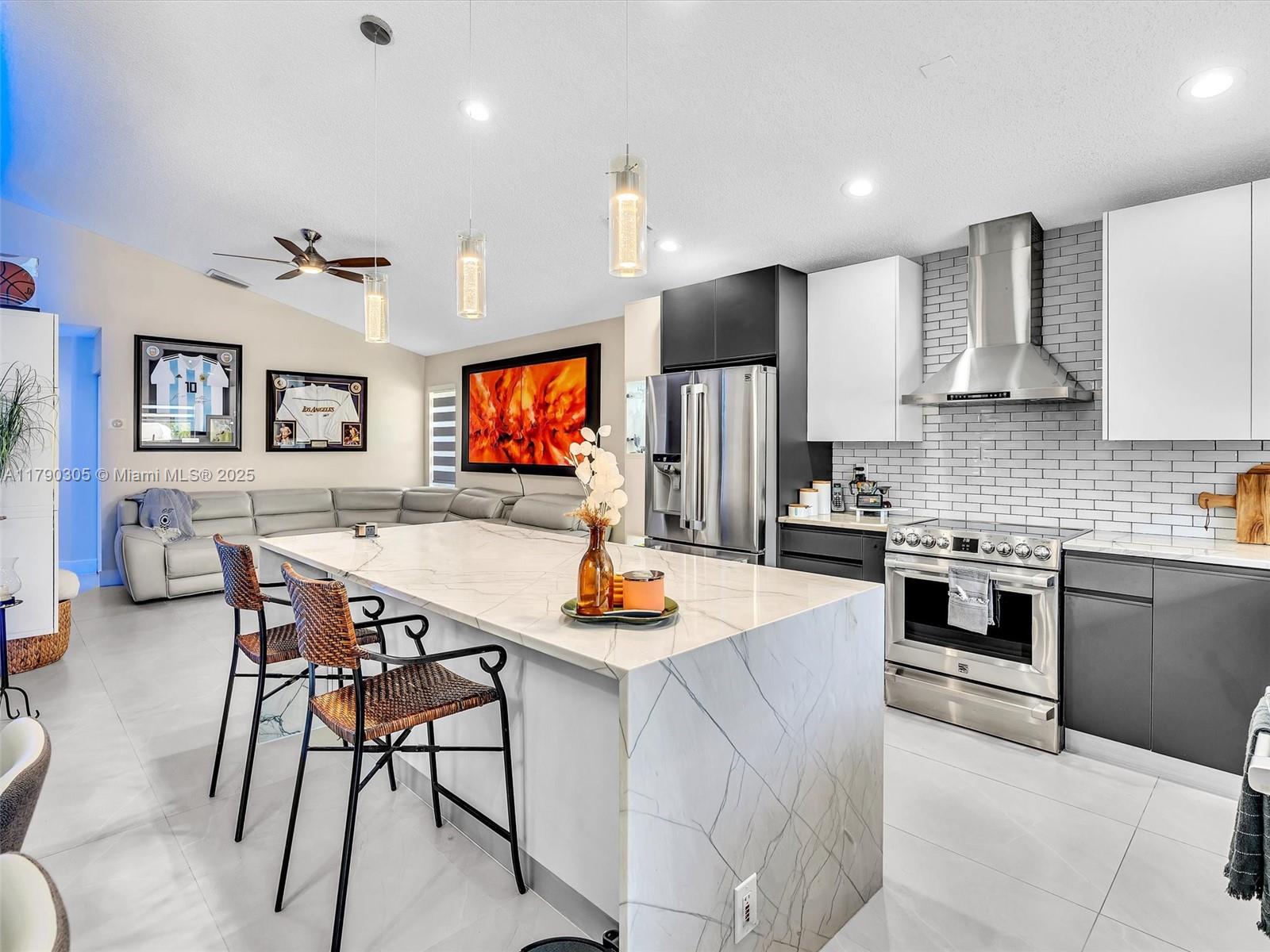 Stunning lakefront pool home in The Falls, Weston. Fully renovated & move-in ready! New 2025 roof, 2024 exterior paint, tile in living, luxury vinyl floor in bedrooms. Modern kitchen & baths with quartzite counters. Custom wall unit with electric fireplace. Saltwater pool with travertine deck, LED lights, and heater. Electric awnings, additional pergola, outdoor shower, aluminum fencing. 2023 Rheem A/C, zebra shades, electric rollers on sliders. Travertine paver driveway. Gated community with A+ schools. Easy to show!! Bring your buyers.