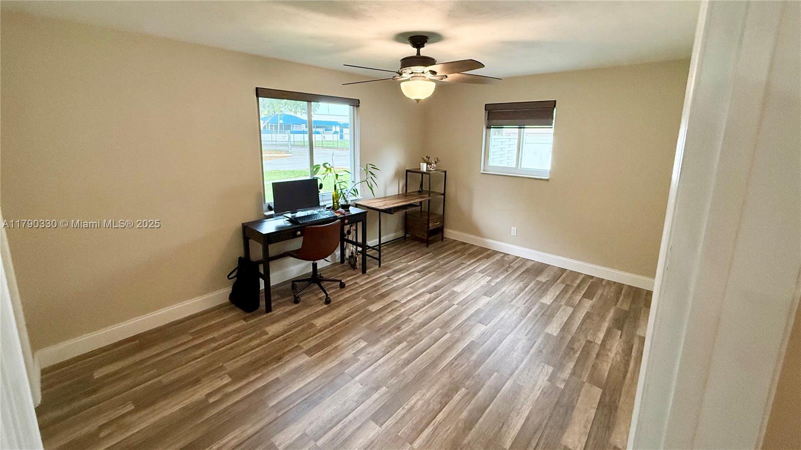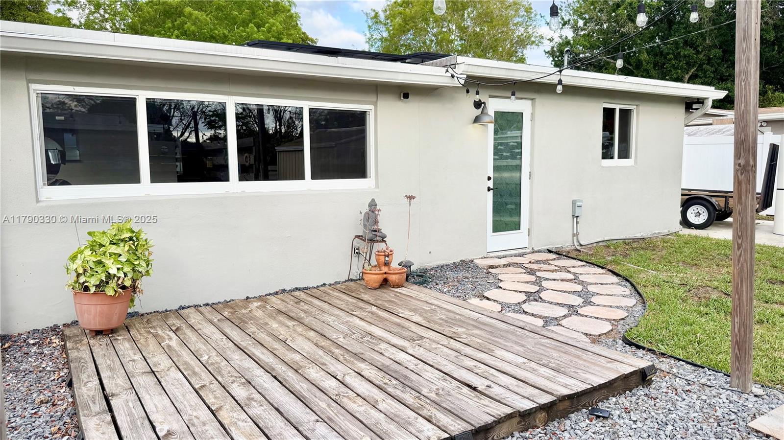 Prime location in a quiet, family-friendly neighborhood, just steps from an elementary school and walking distance to a golf course! This turnkey home is packed with upgrades: expanded master bedroom with added bath (extra sq ft not reflected on record), fresh paint, ceiling fans in every room, and well-maintained appliances. 2020 roof under solar panel warranty, hurricane windows, tankless water heater, and full PVC plumbing to the street. AC is in excellent working order, electric carport gate, tiki hut (permitted), jacuzzi, 8x10 shed, and large concrete slab for storage or entertaining.