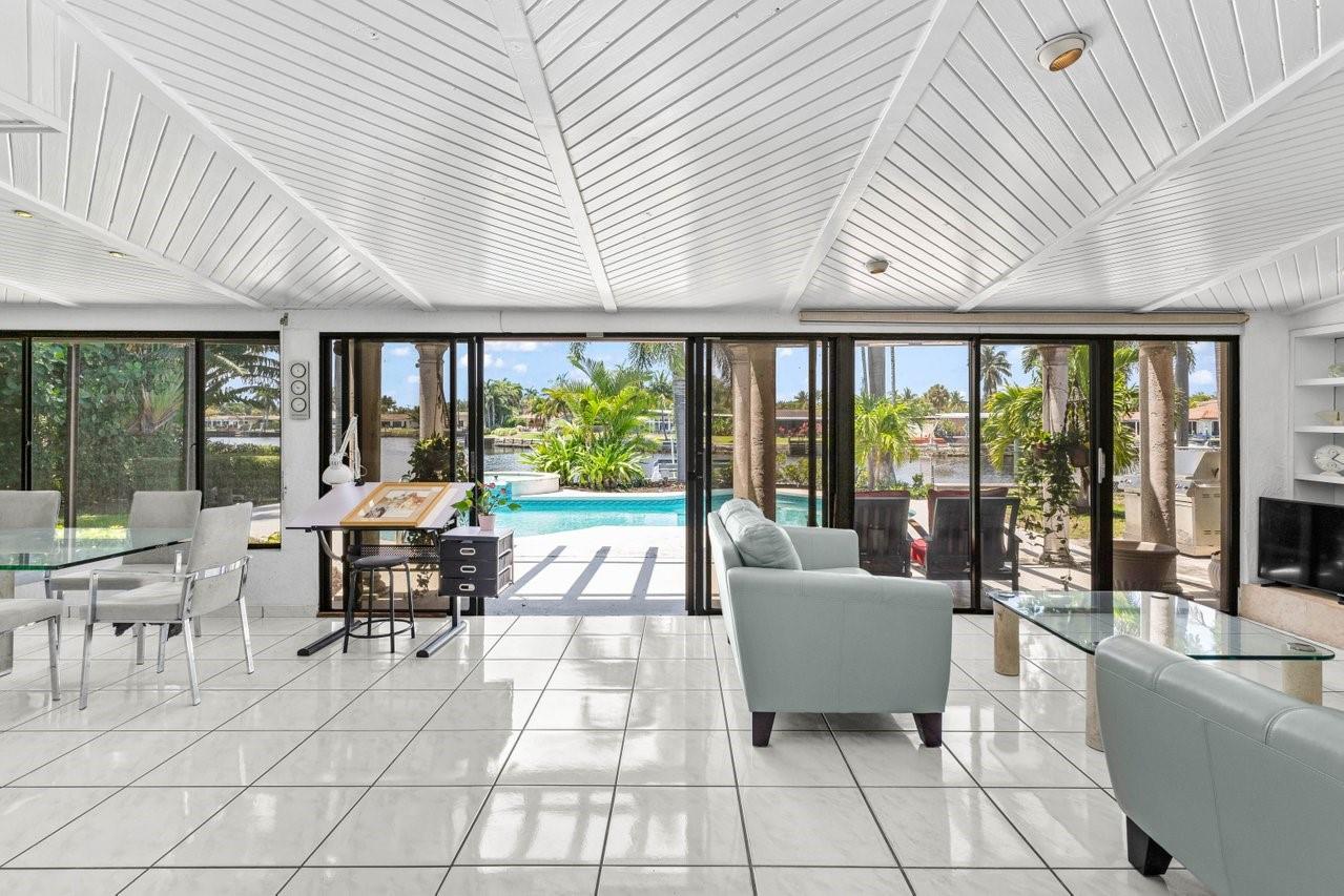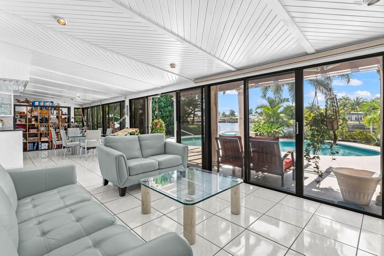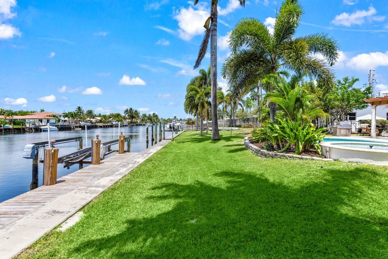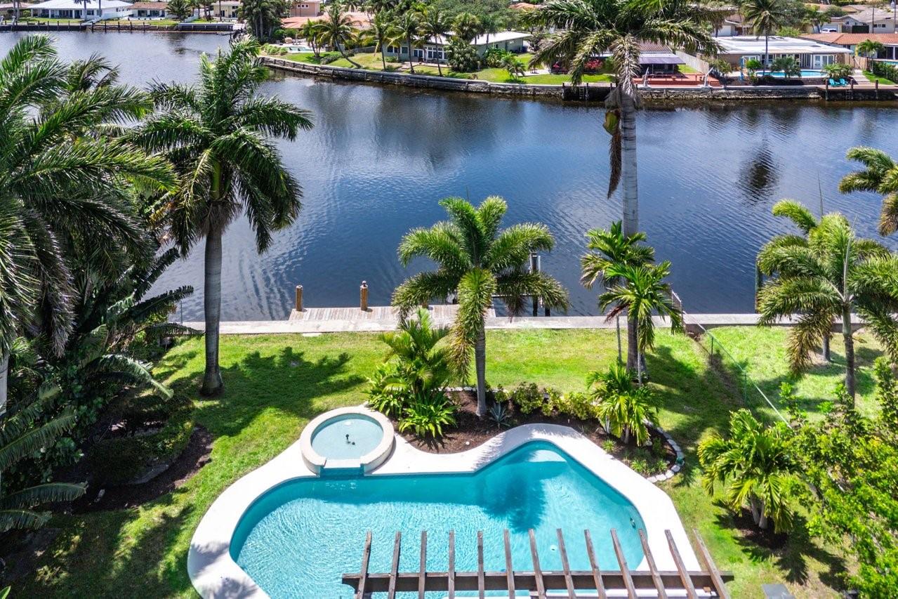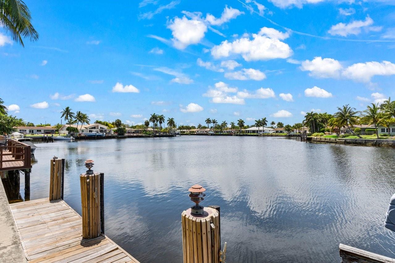 Prime waterfront location in Pompano Beach with beautiful views on a large body of water. Enjoy wide waterway views from the open eat-in kitchen, spacious family room, and charming dining room. This three bedroom home has Brazilian Cherry Wood flooring in the bedrooms and tile throughout the living areas. There is a dock with boatlift on approximately 70 ft of water frontage. Property has plenty of parking with a 2 car garage and circular driveway. The only fixed bridge is the high Federal Highway bridge. Waterway is approximately 220' in width.