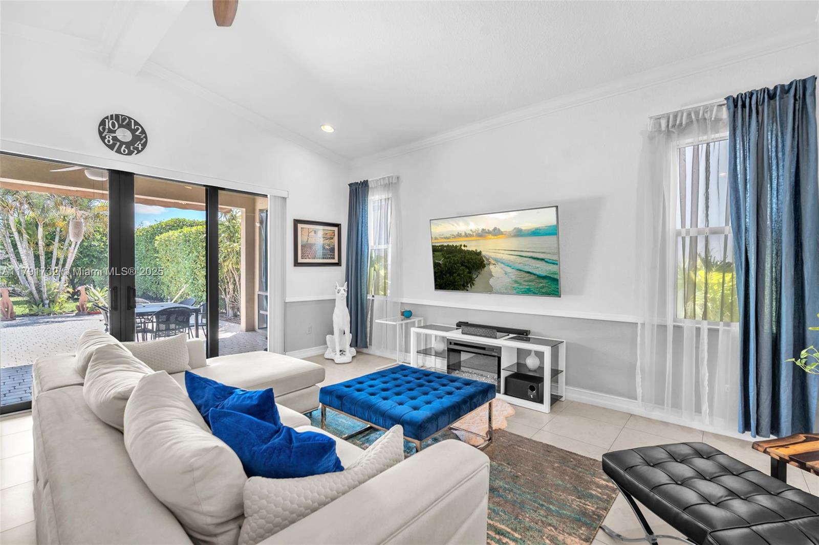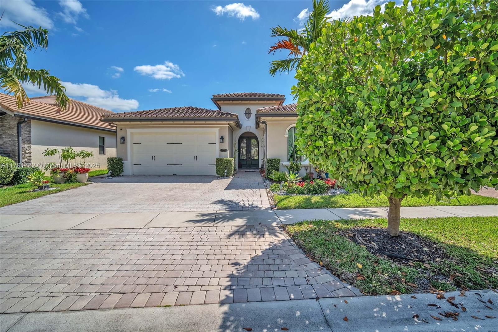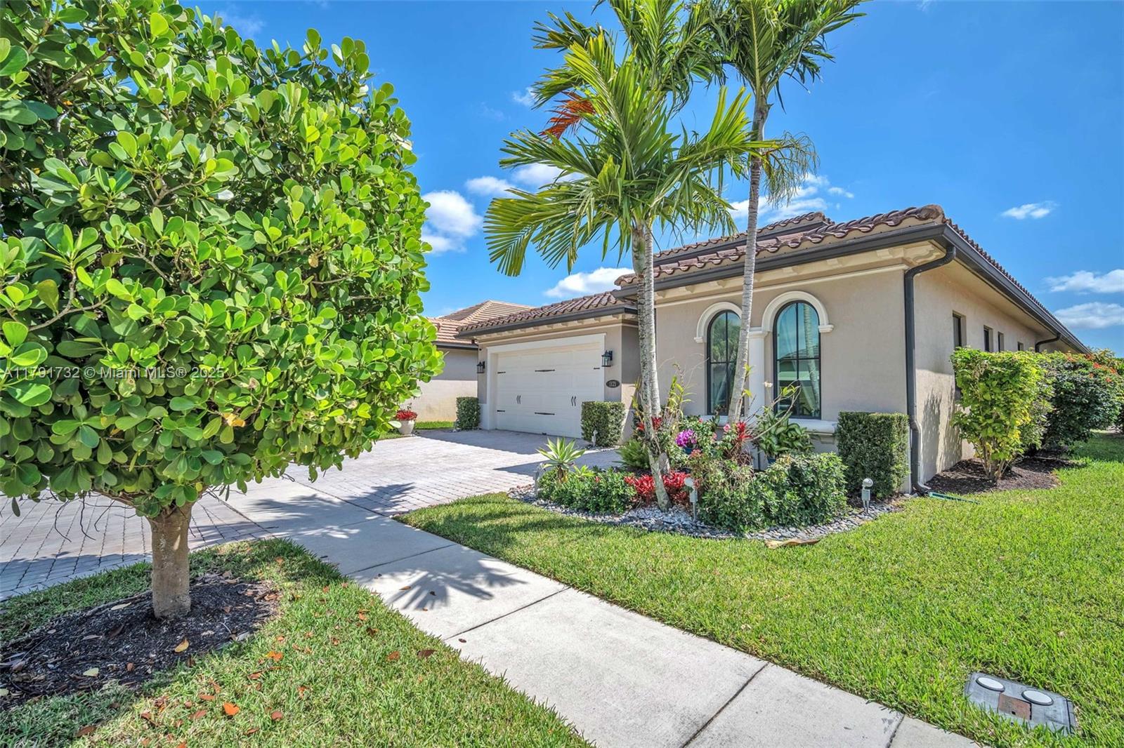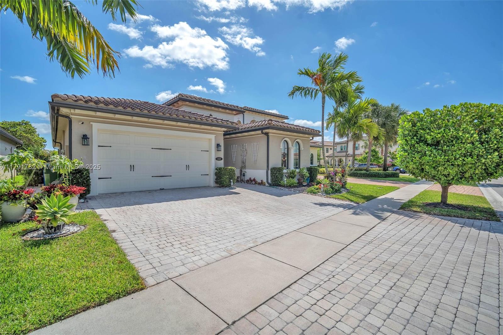 Enter this modern, 2015 3/2.5 single floor home via a lush garden with orchid adorned palms & glass patterned door. Notice the wood ceiling trim and large porcelain tiles throughout. Kitchen boasts dark granite counters with contrasting cream cabinets & backsplash + under cabinet lighting & SS appliances. 2421 SF of living space is reflected in the oversized master with glass enclosed shower + jacuzzi & 2 custom closets. Back yard has large, covered lanai with pavers and plenty of space for a pool. The two-car garage is tiled & has AC. Driveway holds 3 cars. This home also includes high impact windows and alarm system. All this in the prestigious & gated Raintree community with gym & heated pool. You will be close to shops, restaurants, services & the I75.