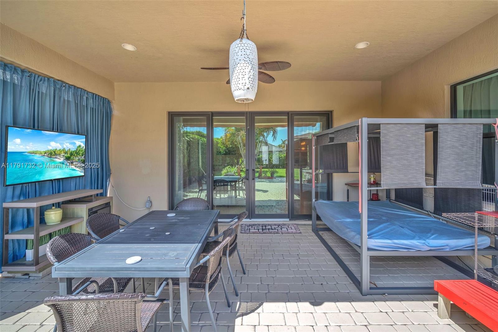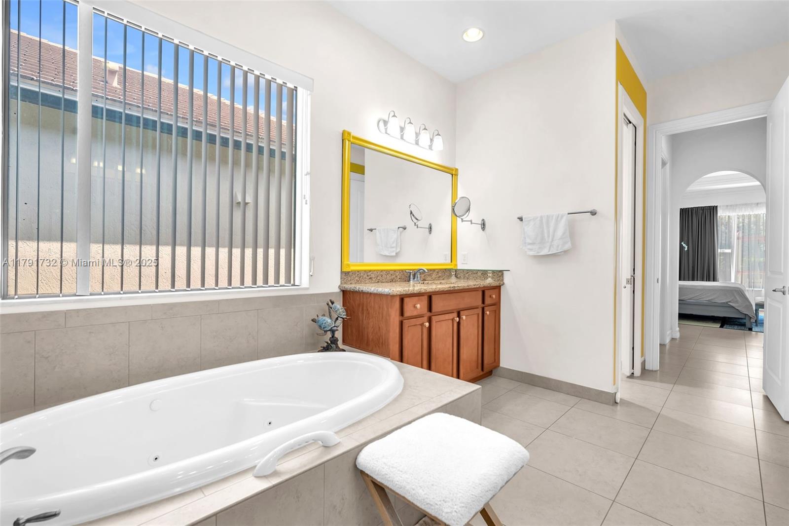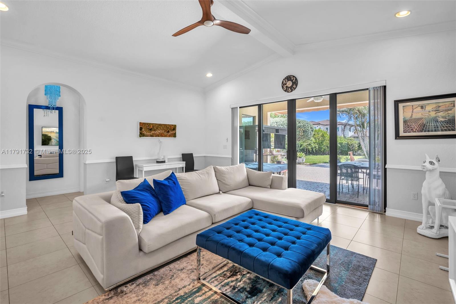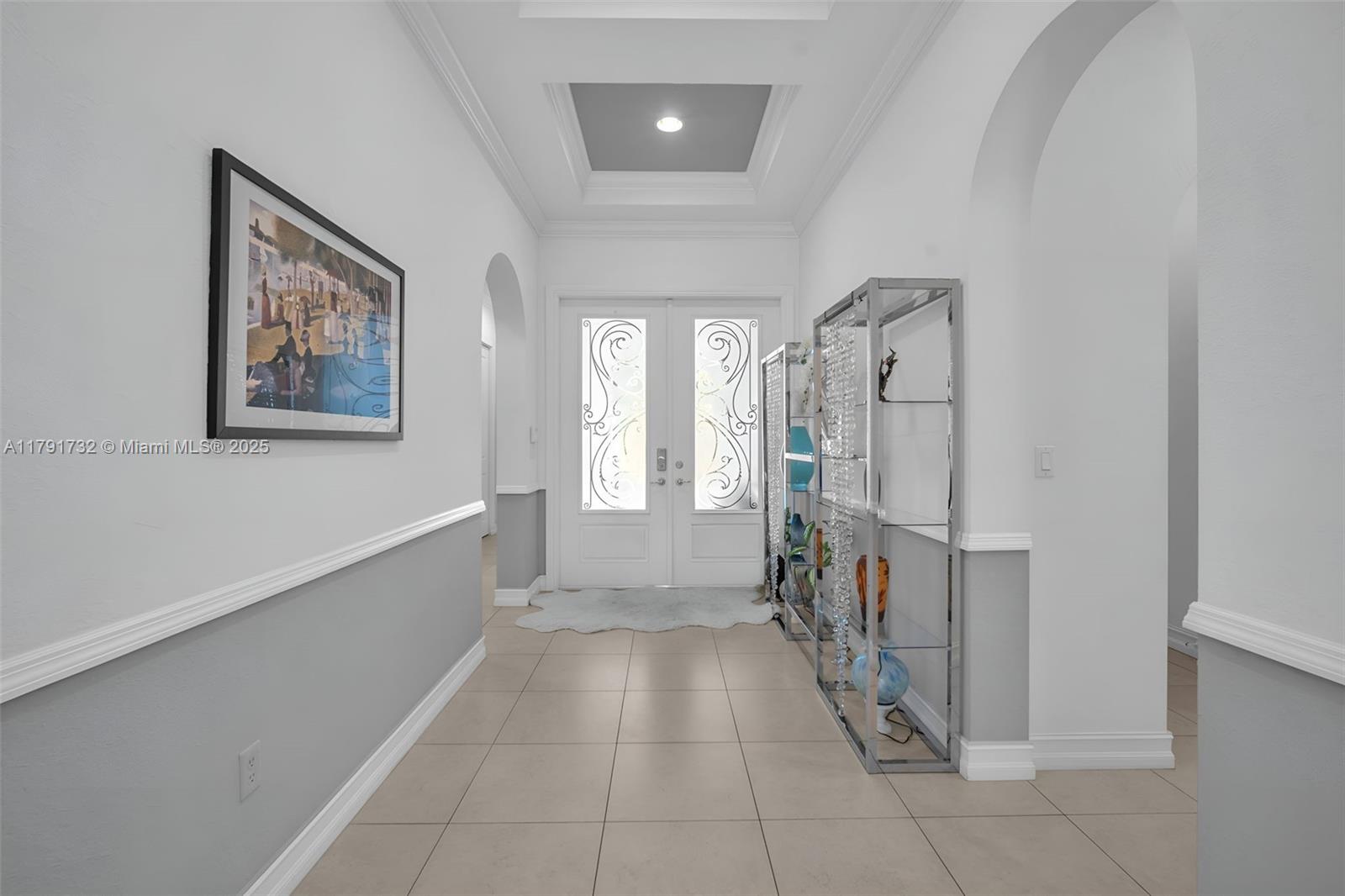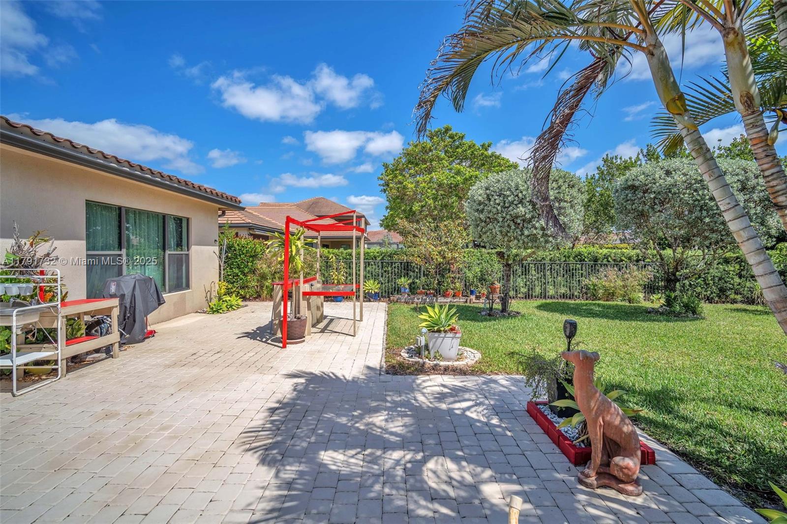 Enter this modern, 2015 3/2.5 single floor home via a lush garden with orchid adorned palms & glass patterned door. Notice the wood ceiling trim and large porcelain tiles throughout. Kitchen boasts dark granite counters with contrasting cream cabinets & backsplash + under cabinet lighting & SS appliances. 2421 SF of living space is reflected in the oversized master with glass enclosed shower + jacuzzi & 2 custom closets. Back yard has large, covered lanai with pavers and plenty of space for a pool. The two-car garage is tiled & has AC. Driveway holds 3 cars. This home also includes high impact windows and alarm system. All this in the prestigious & gated Raintree community with gym & heated pool. You will be close to shops, restaurants, services & the I75.