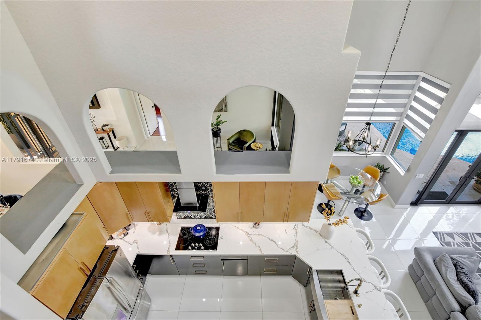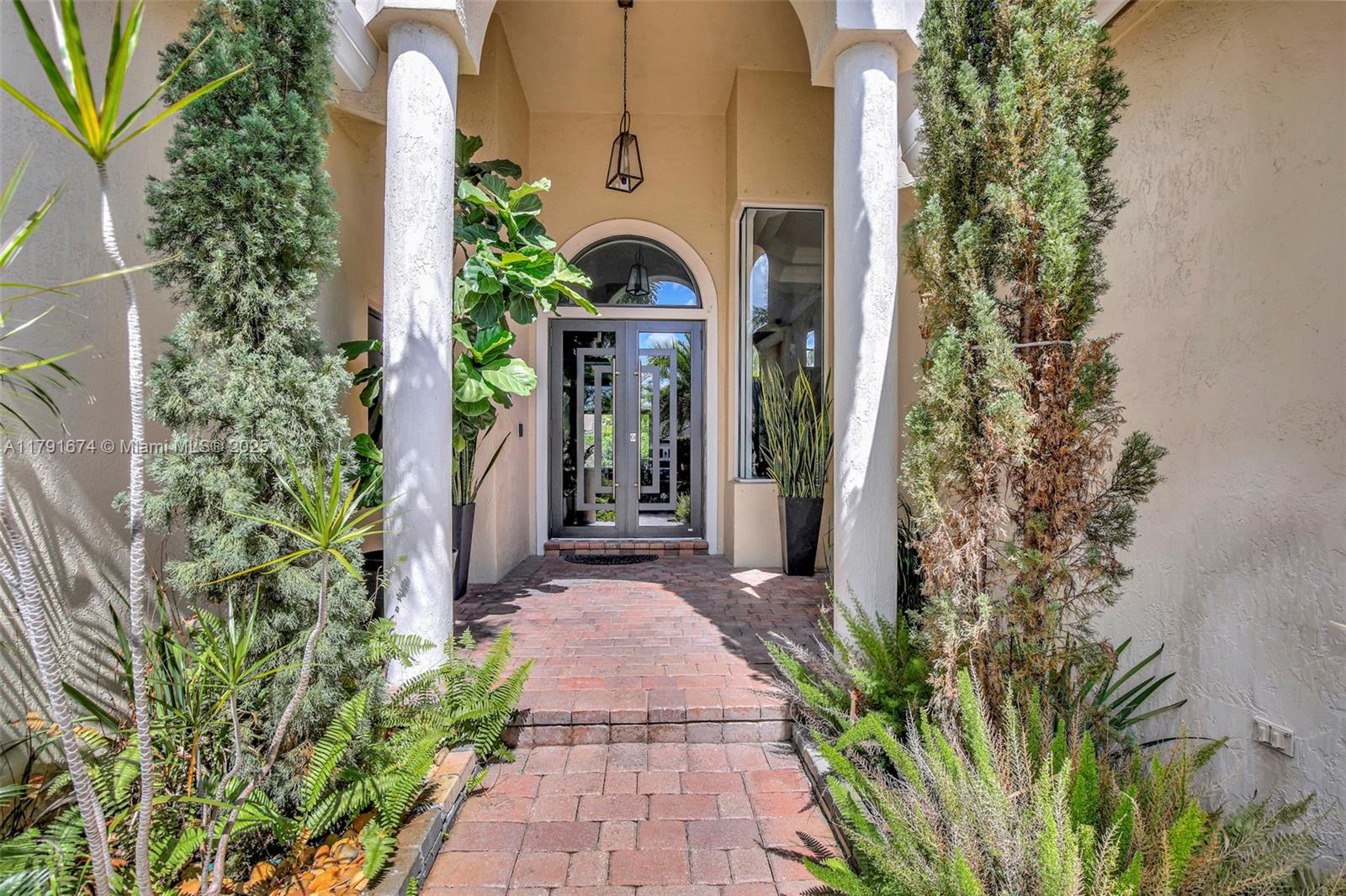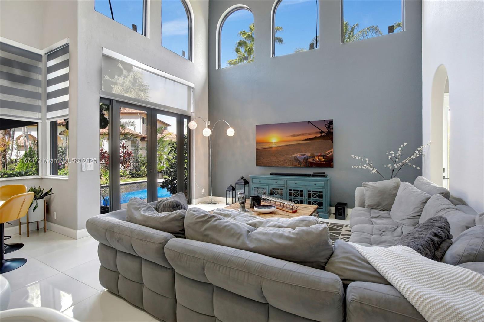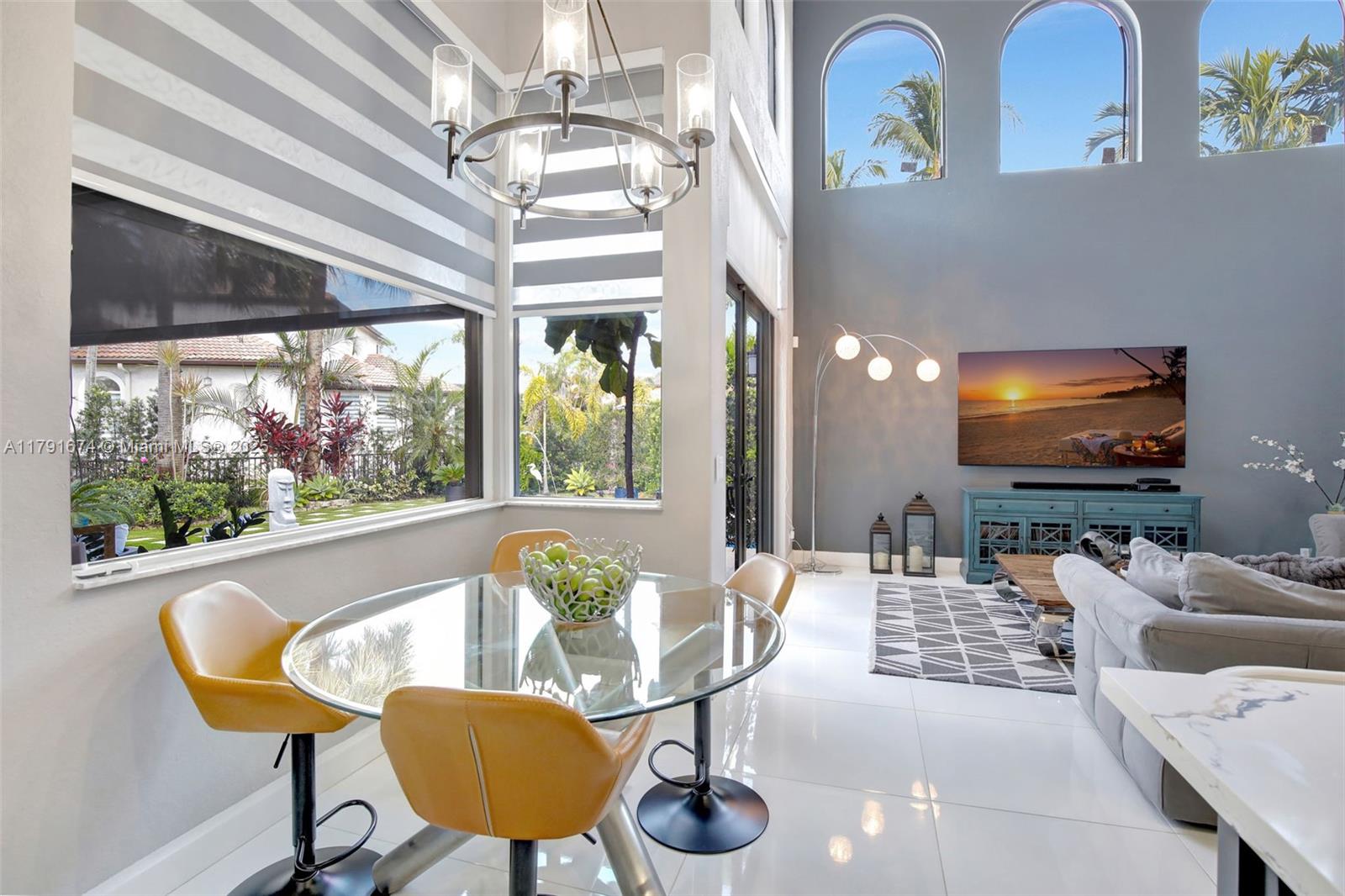 Experience refined living in the exclusive Sunset Lake community. 5/5+loft blends timeless sophistication with a modern edge, featuring dramatic volume ceilings, elegant arched windows, and a seamless indoor-outdoor flow. Enjoy serene afternoons on the expansive covered terrace with motorized screens, overlooking a private resort-style pool framed by lush tropical zen garden. Inside, an open-concept design welcomes abundant natural light through impact glass doors. The chef's kitchen impresses with quartz countertops, wood cabinets, double wall ovens, a wine cooler, barista station with floating shelves, and a peninsula perfect for casual gatherings in the sun-drenched breakfast nook and expansive family room. Primary wing includes sitting area, walk-in closes, and big bathroom. Low HOA.