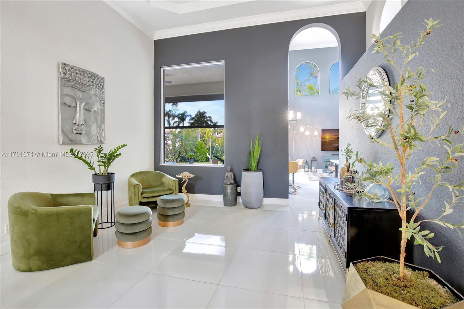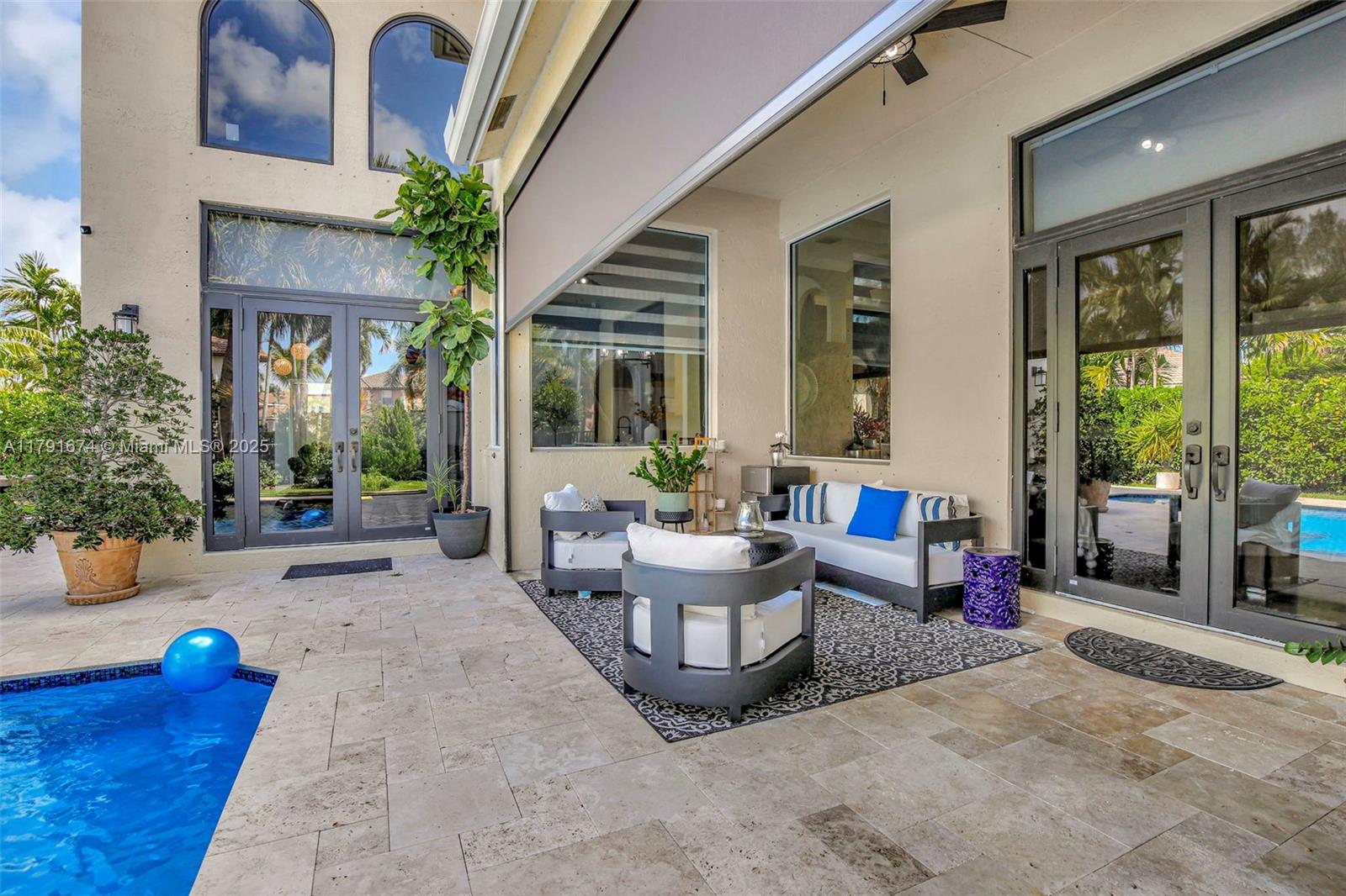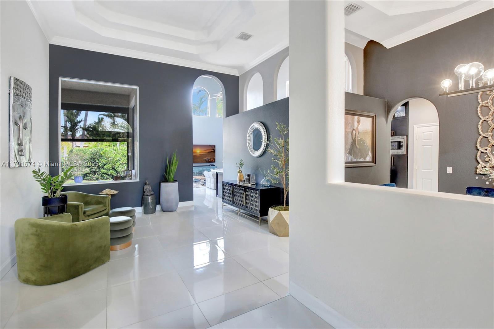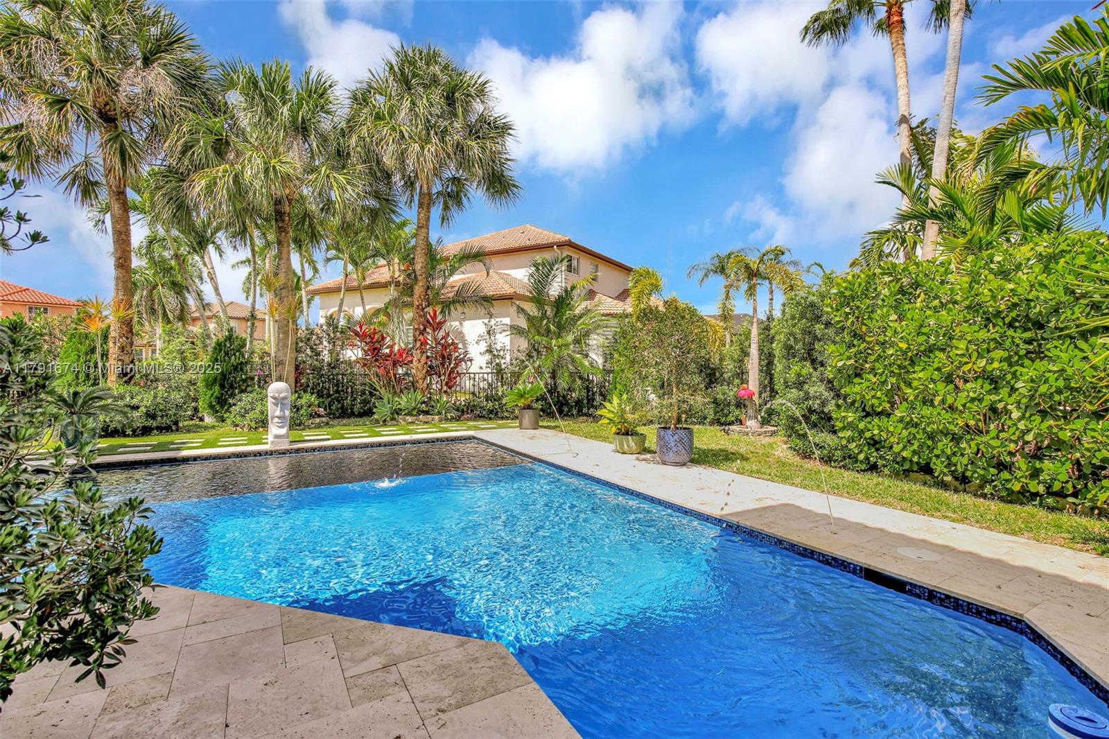 Experience refined living in the exclusive Sunset Lake community. 5/5+loft blends timeless sophistication with a modern edge, featuring dramatic volume ceilings, elegant arched windows, and a seamless indoor-outdoor flow. Enjoy serene afternoons on the expansive covered terrace with motorized screens, overlooking a private resort-style pool framed by lush tropical zen garden. Inside, an open-concept design welcomes abundant natural light through impact glass doors. The chef's kitchen impresses with quartz countertops, wood cabinets, double wall ovens, a wine cooler, barista station with floating shelves, and a peninsula perfect for casual gatherings in the sun-drenched breakfast nook and expansive family room. Primary wing includes sitting area, walk-in closes, and big bathroom. Low HOA.