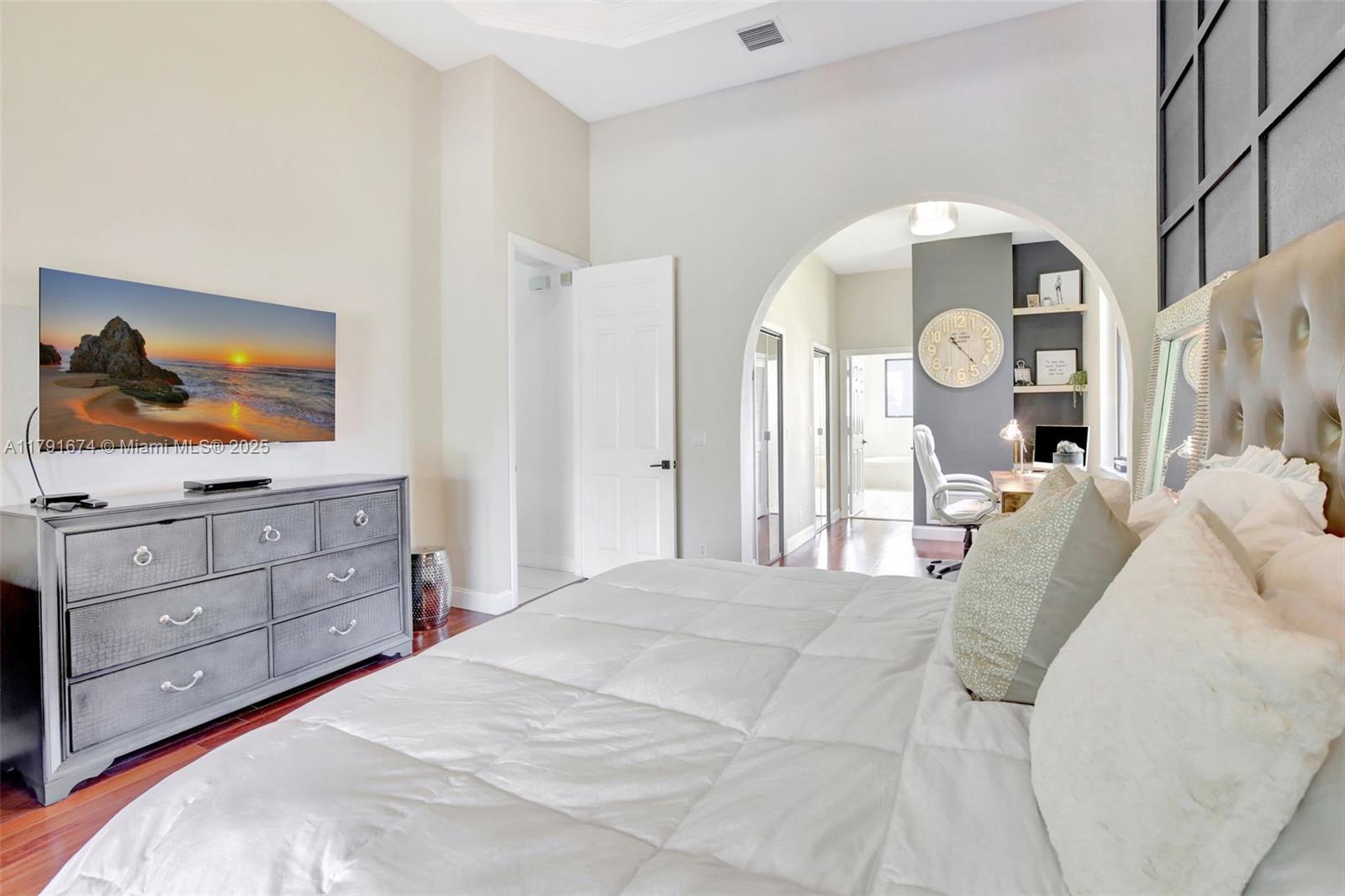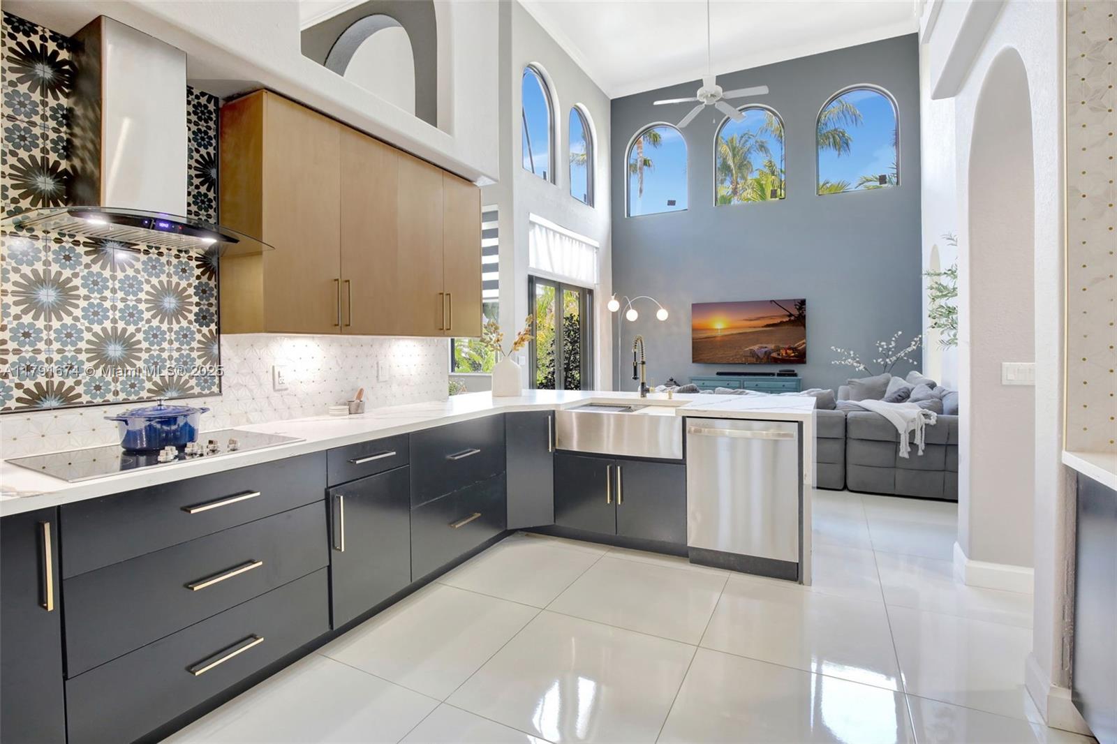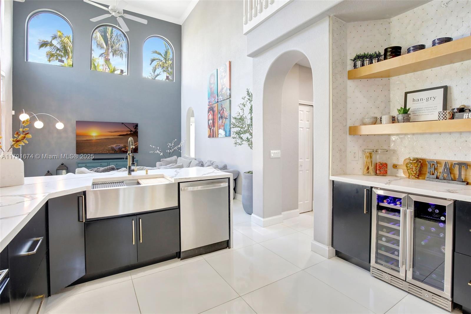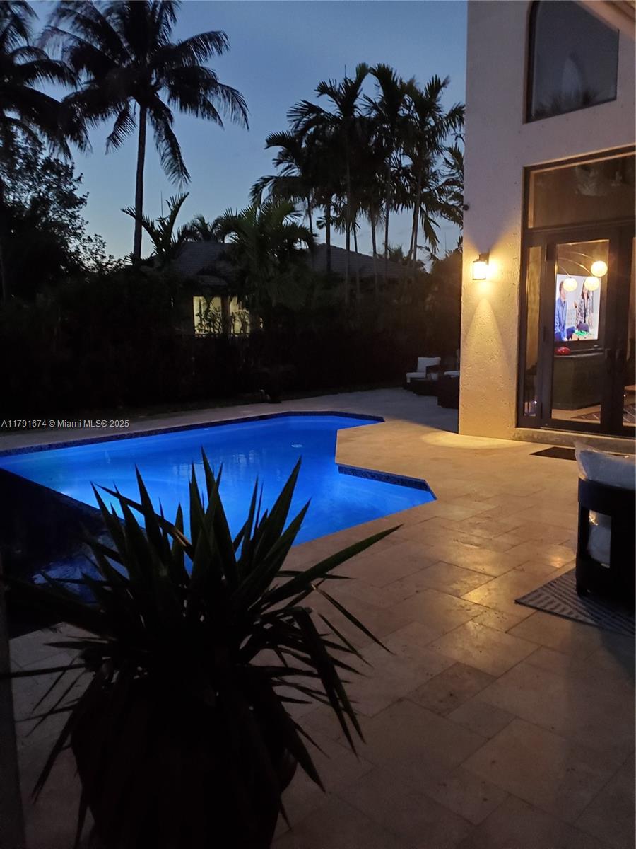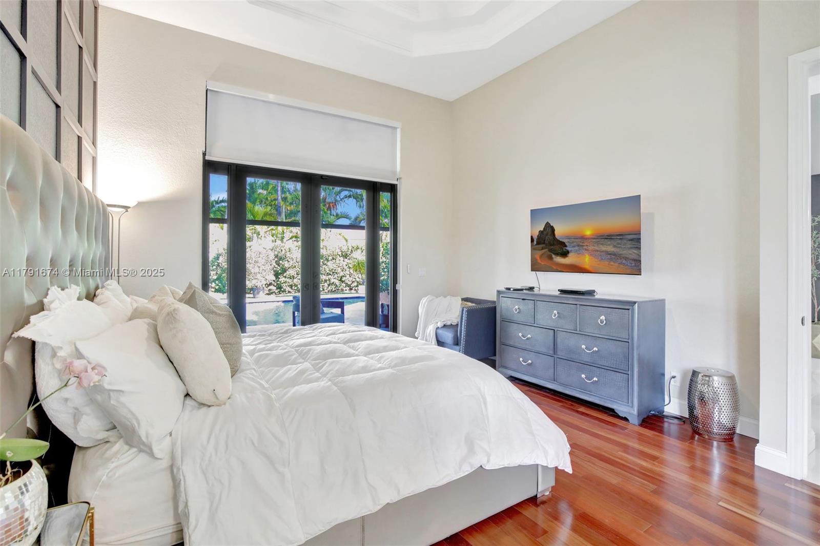 Experience refined living in the exclusive Sunset Lake community. 5/5+loft blends timeless sophistication with a modern edge, featuring dramatic volume ceilings, elegant arched windows, and a seamless indoor-outdoor flow. Enjoy serene afternoons on the expansive covered terrace with motorized screens, overlooking a private resort-style pool framed by lush tropical zen garden. Inside, an open-concept design welcomes abundant natural light through impact glass doors. The chef's kitchen impresses with quartz countertops, wood cabinets, double wall ovens, a wine cooler, barista station with floating shelves, and a peninsula perfect for casual gatherings in the sun-drenched breakfast nook and expansive family room. Primary wing includes sitting area, walk-in closes, and big bathroom. Low HOA.
