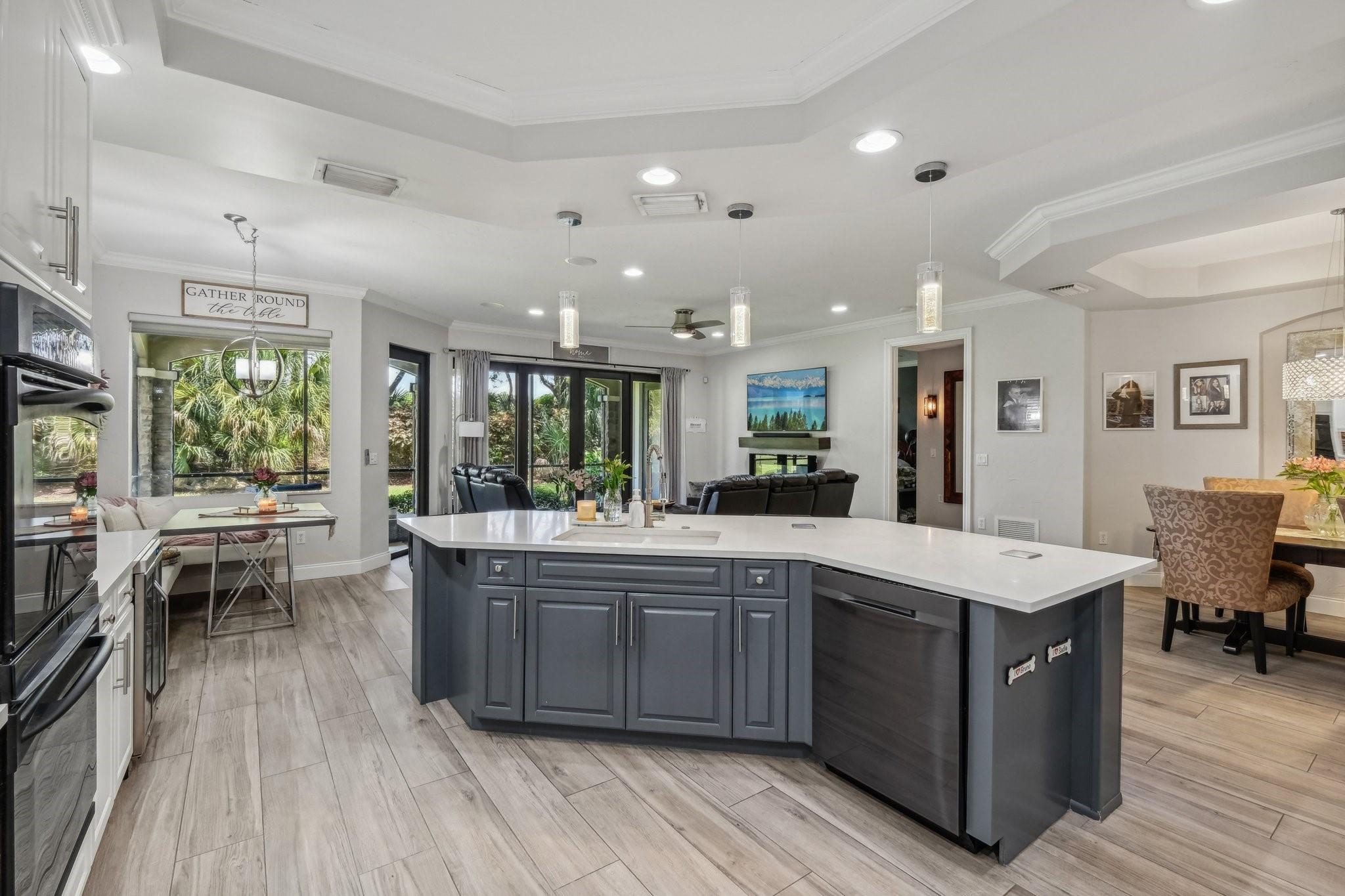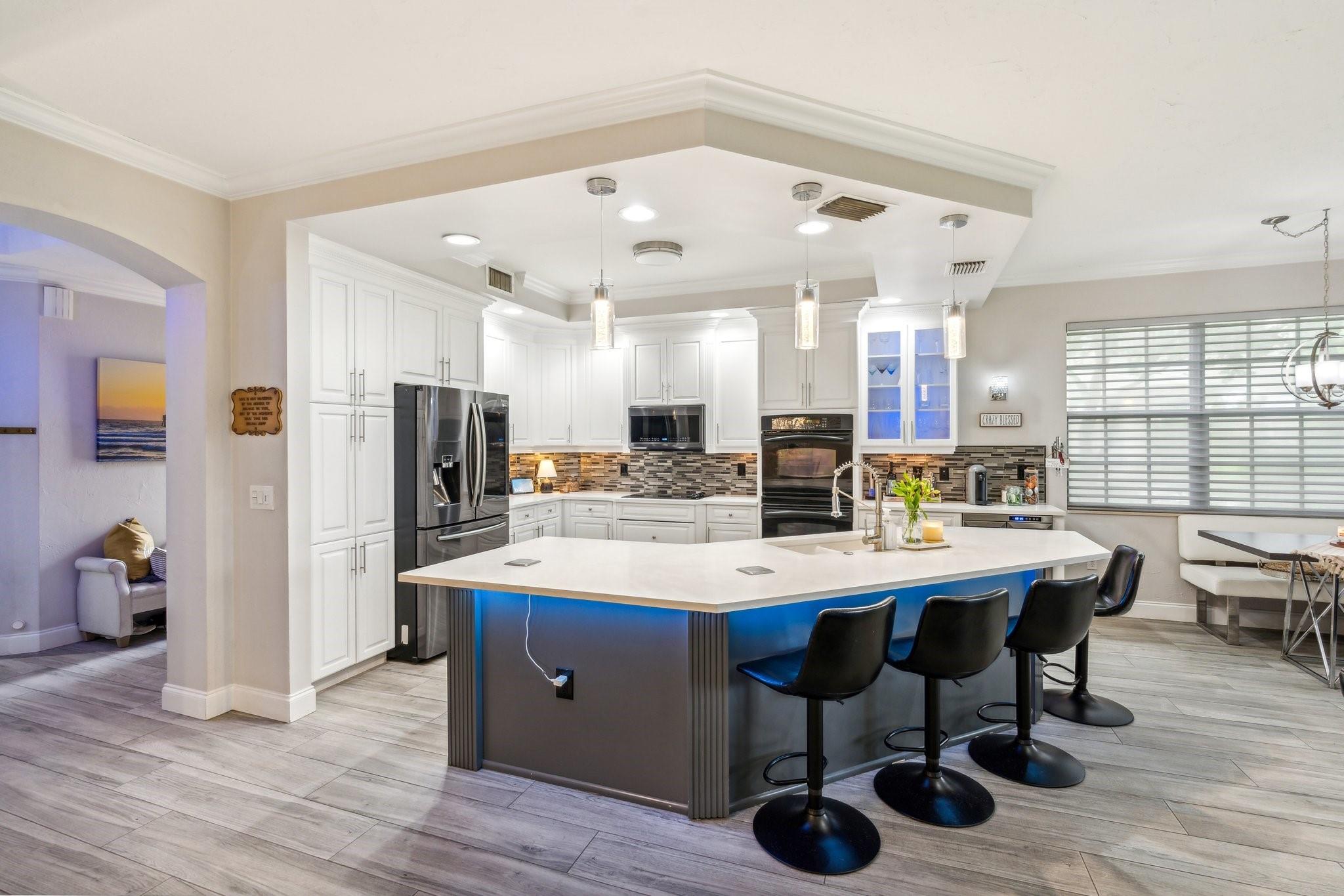 Welcome to your beautifully remodeled, one-level townhome! This turnkey home seamlessly blends luxury and comfort. New 2025 Roof, Impact windows, modern kitchen featuring top-of-the-line appliances, wine fridge, quartz countertops, double oven, smart-fridge, ample cabinet space, open & spacious floor plan, The primary bedroom boasting a generous walk-in closet and a en-suite bathroom. Enjoy the lanai soaking in the tranquil surroundings. The additional bedrooms are perfect for family, guests, or a home office. The community offers top amenities & remolded in 2024, including golf cousrse, fitness center, sauna, pool, tennis courts, pickle ball, bar & restaurant. Quarterly HOA Covers, Insurance, Roof, Lawn Care, Pool, & Maintenance. Home is Gated with 24 hour Security.