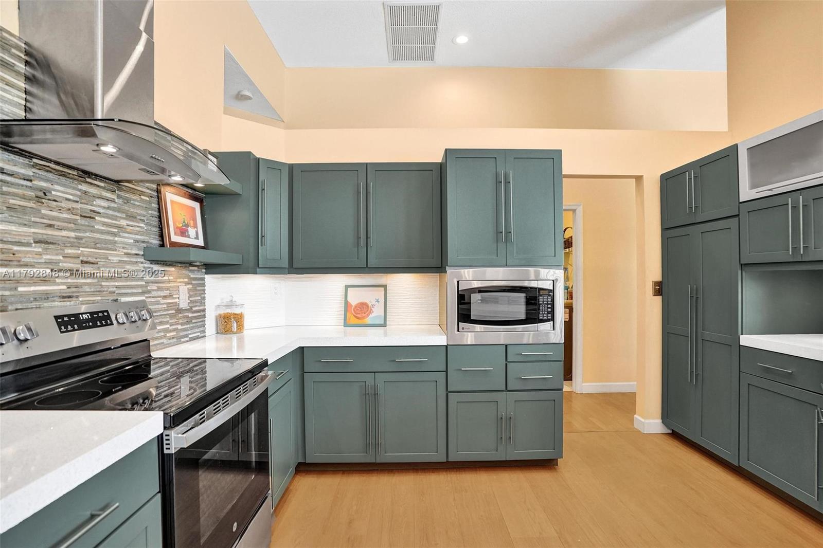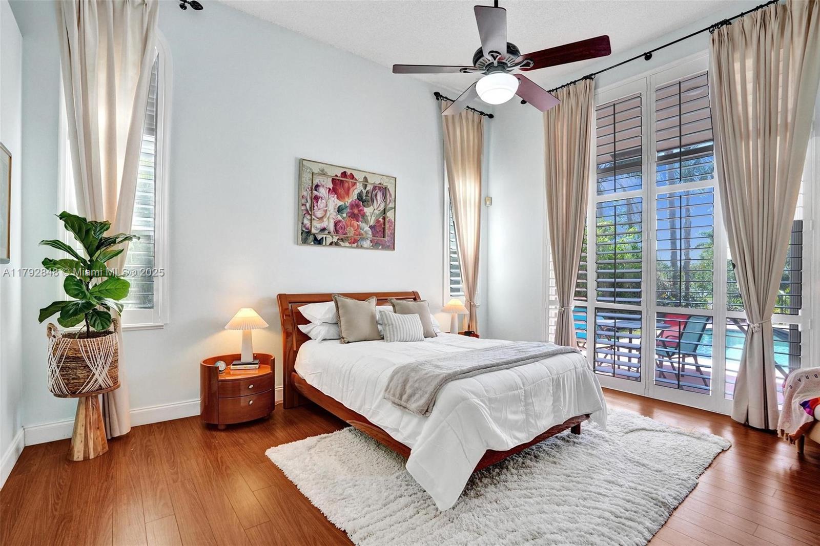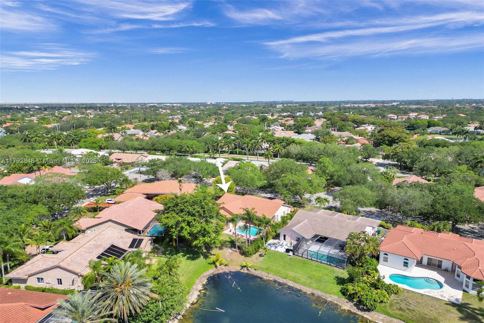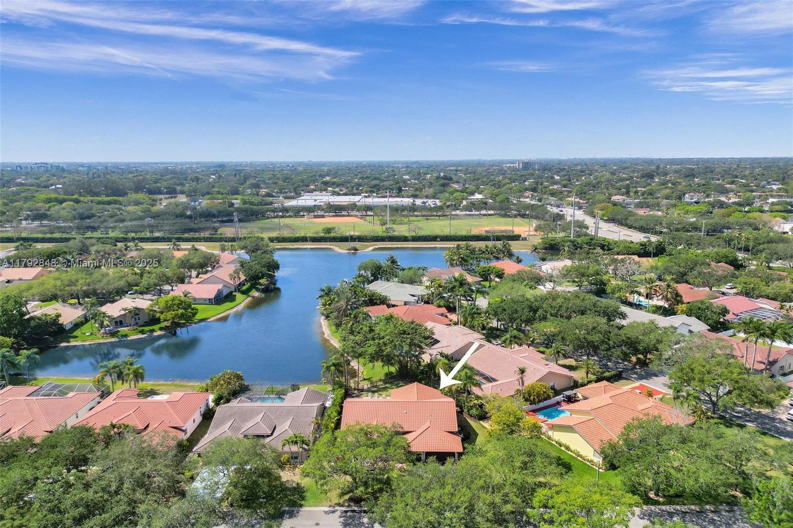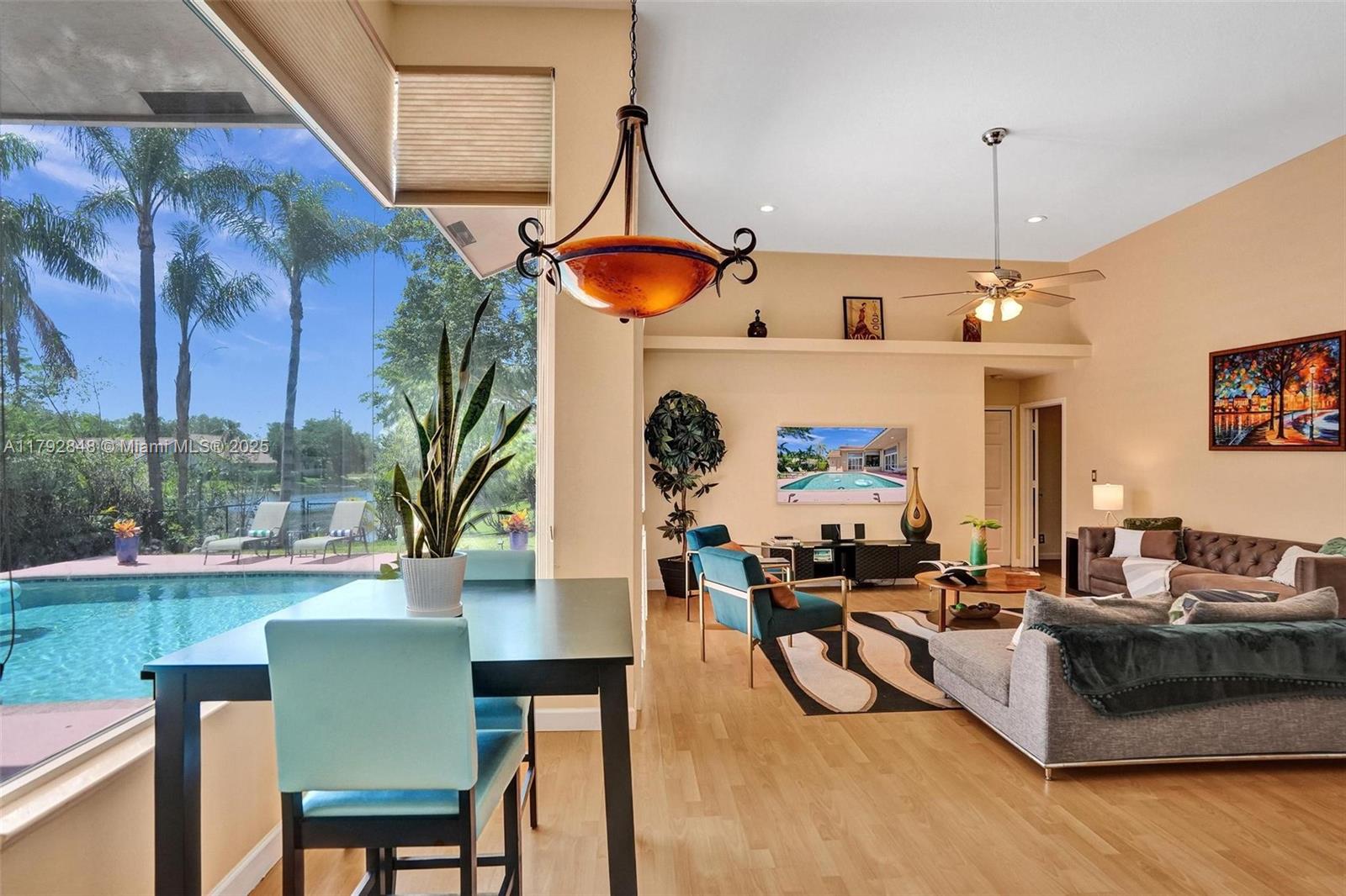 Nestled in an intimate section of Brookside on a pie-shaped homesite with beautiful curb appeal! This 4BD/3BA, 3-car garage home offers a perfect flow with soaring volume ceilings, vinyl plank floors, versatile formal dining room with outside hurricane & inside plantation shutters. Grand double-door entry opens to spacious living areas separated by a wet bar with storage, while butted glass windows frame tranquil water views. The custom kitchen features Quartz counters, beautiful cabinets & tiled backsplash. Oversized bedrooms in a triple-split layout with cabana bath. Spacious laundry w/ tub. The owner’s retreat boasts floor-to-ceiling windows, dual walk-ins with built-ins, Roman tub & dual vanities. Freshly painted pool deck and fenced yard with lake views complete the picture!