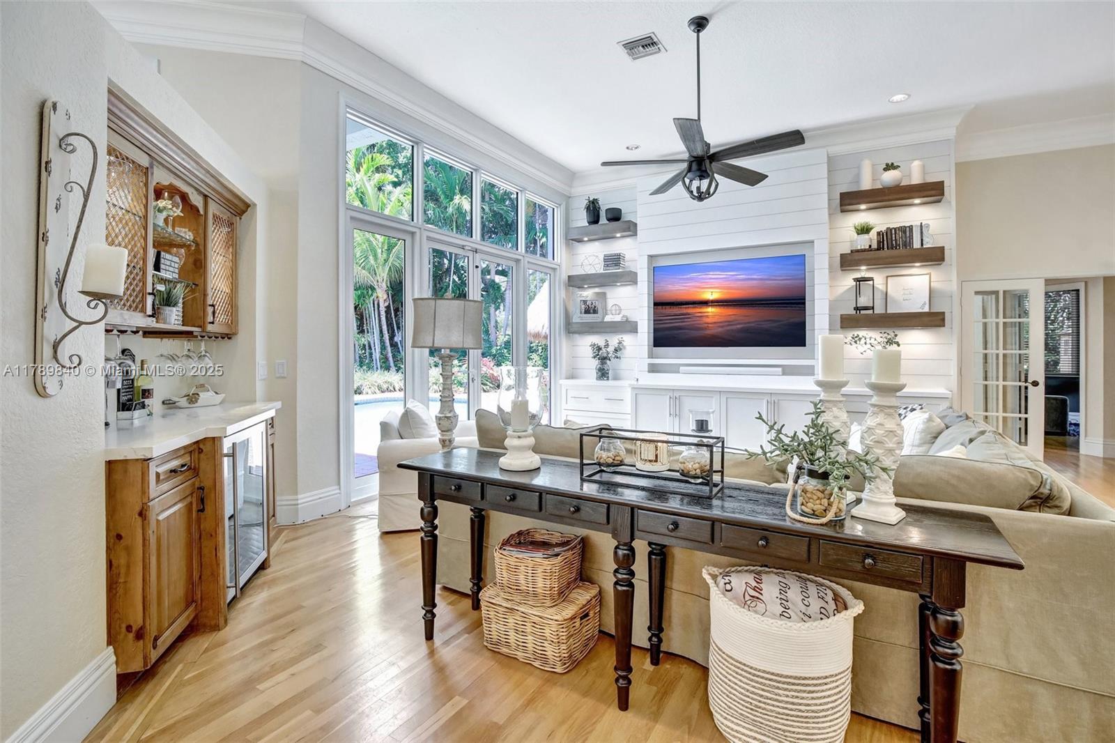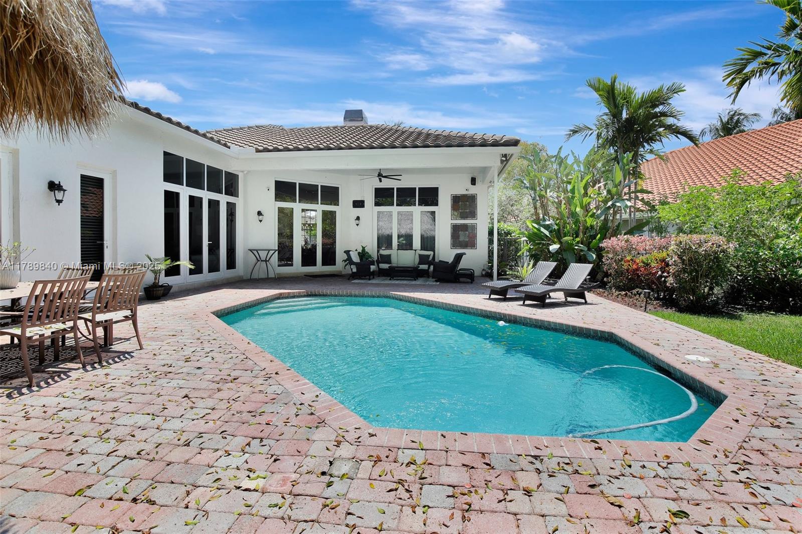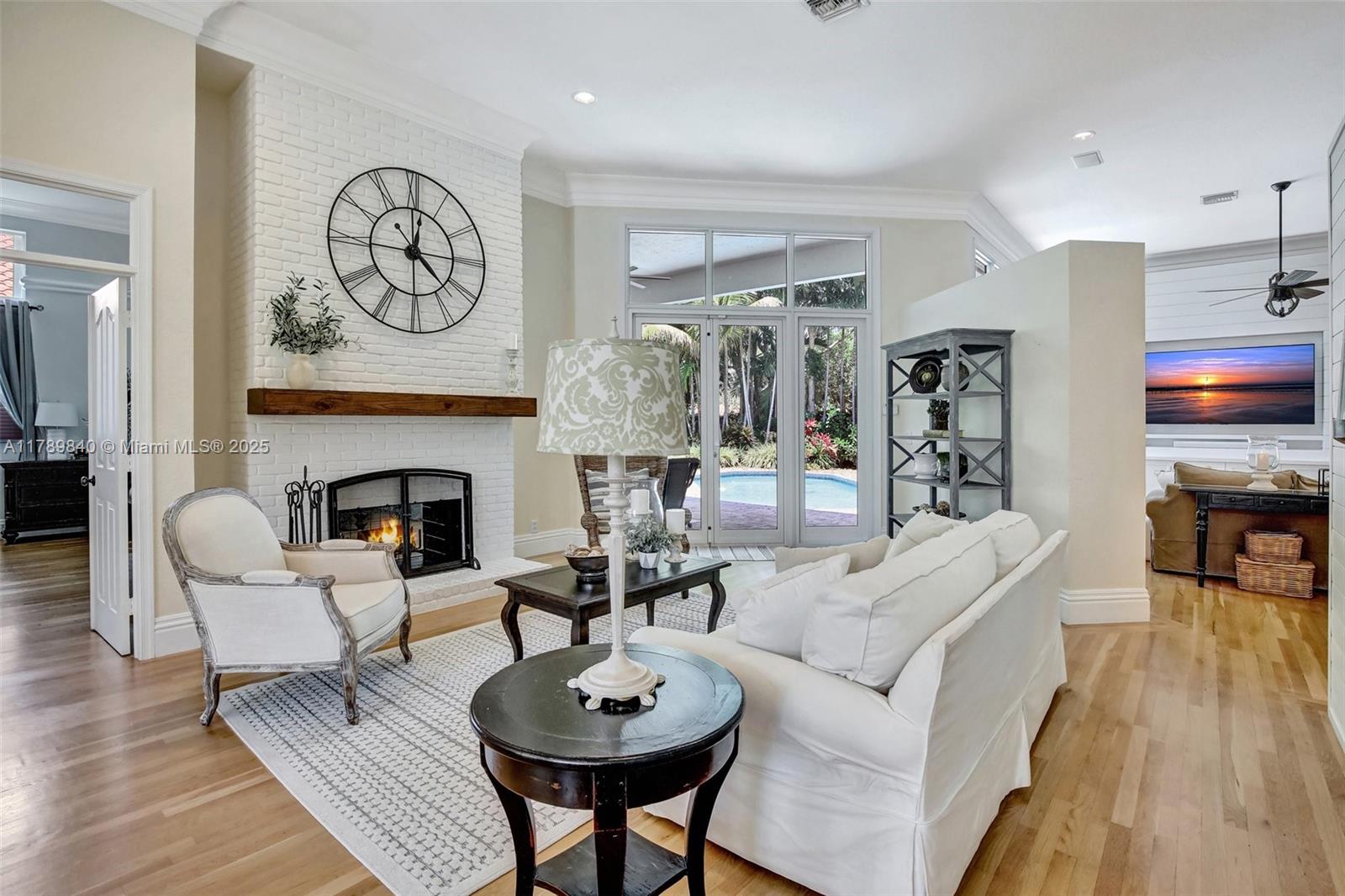 Just under 3,200 SF of open living space with soaring 13-ft ceilings and rich oak hardwood floors. This 5BR/3BA home features a 2018 roof, impact windows/shutters, and a high-end kitchen with Quartz counters, Grabill cabinets, and Sub-Zero, Wolf, and Dacor appliances. Expansive family room with built-in wine bar and cooler. Luxurious primary suite with custom his-and-her closets, renovated spa bath, and dual-sided fireplace to the living room. Big secondary bedrooms; 5th bedroom currently an office. Enjoy the oversized covered patio, sparkling pool, and Tiki Hut with built-in grill. Live the luxury lifestyle at WHCC!