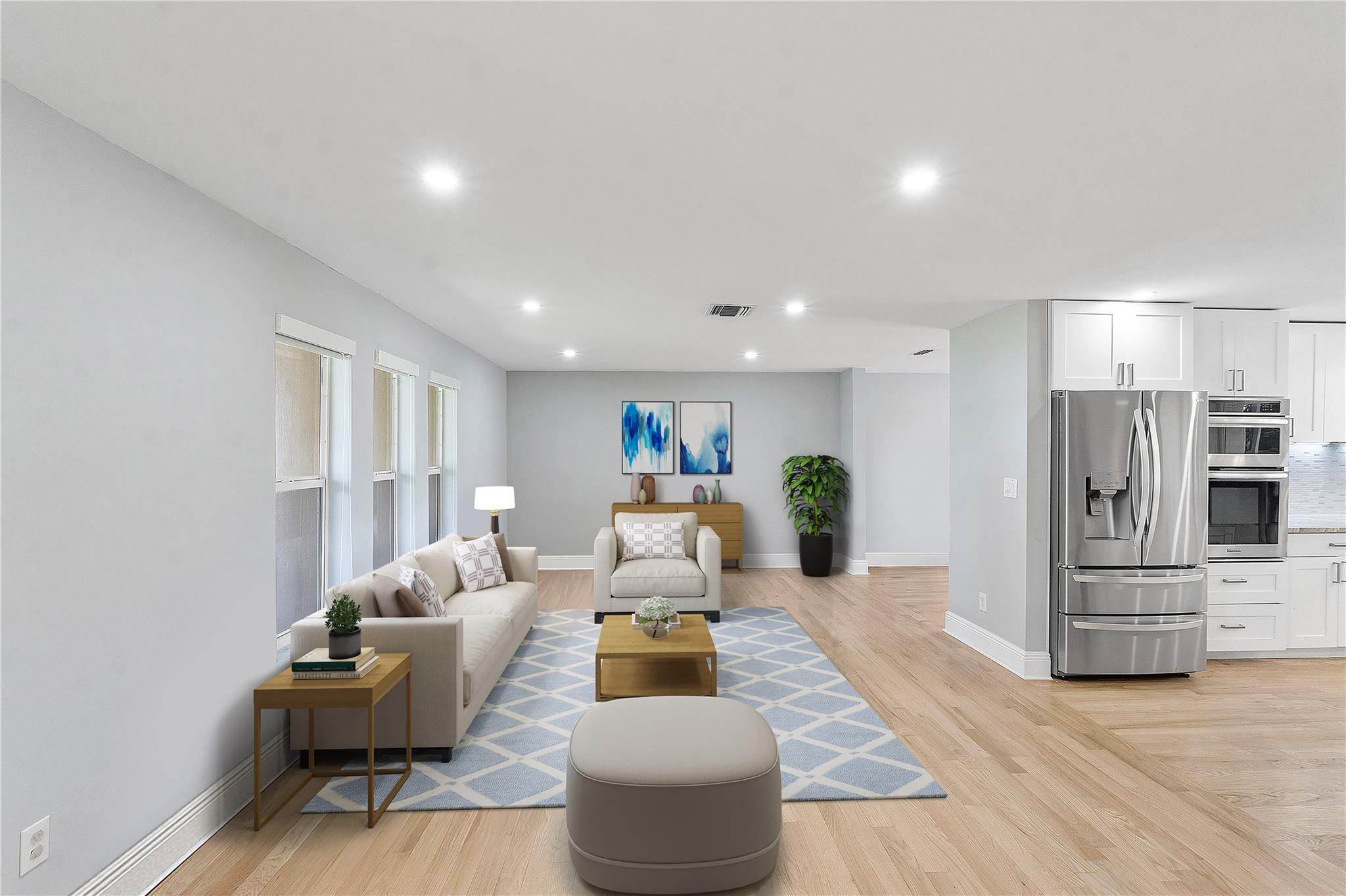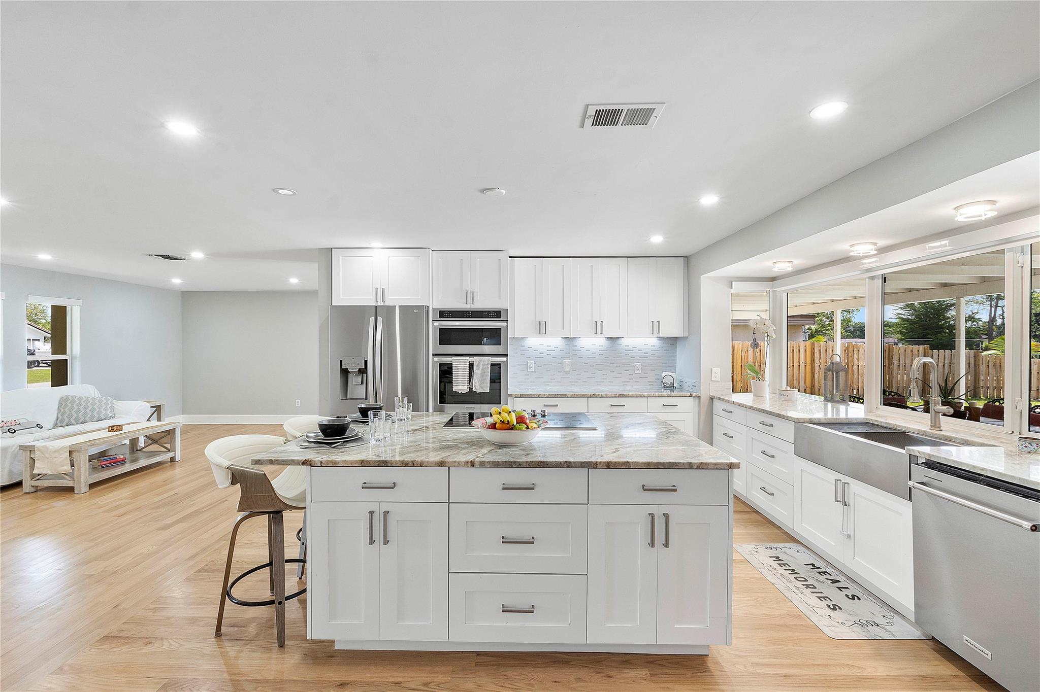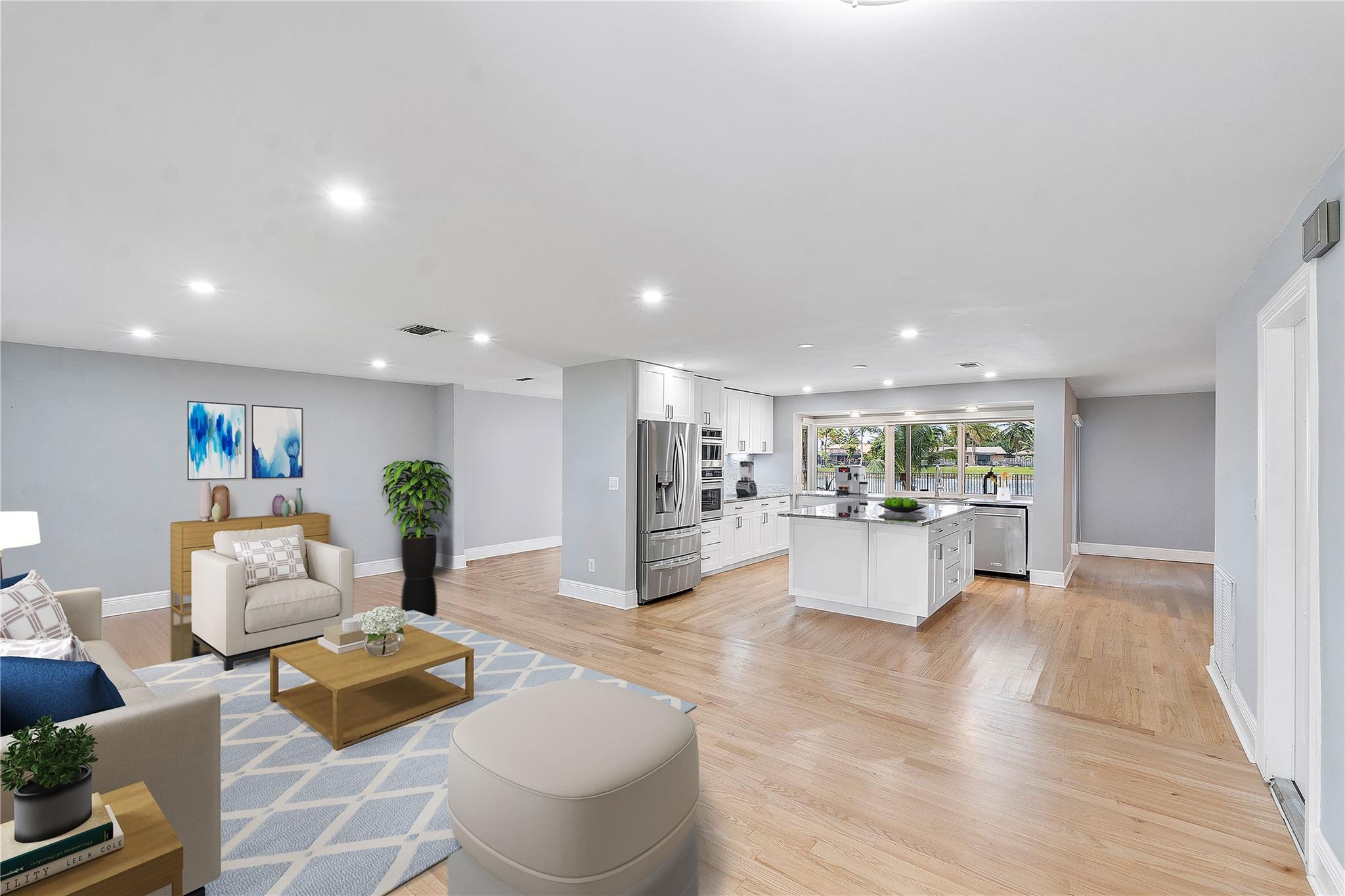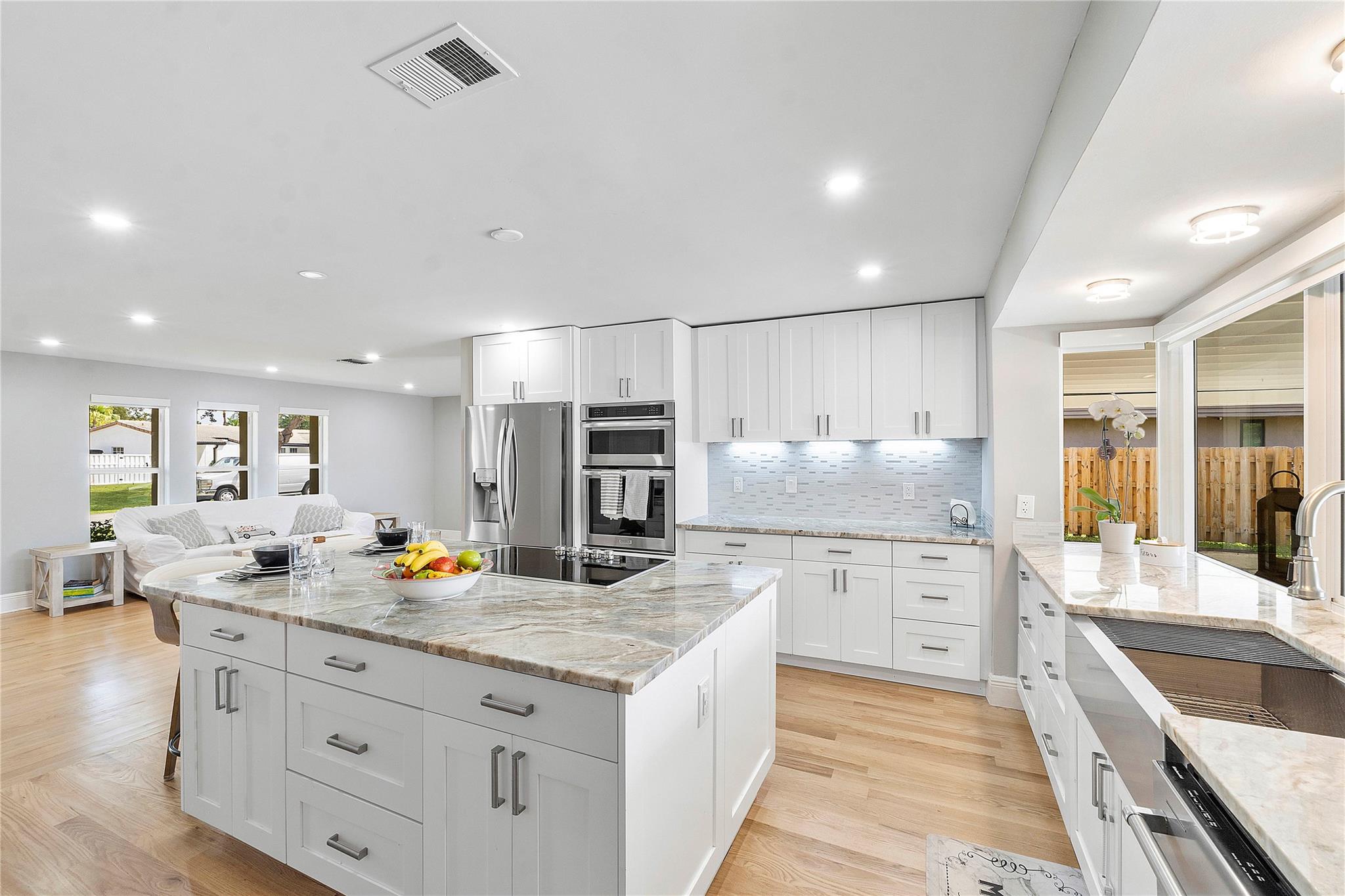 Discover this stunning home featuring 5 spacious bedrooms and 2 modern bathrooms, living. Throughout the residence, beautiful hardwood floors add warmth and elegance. All impact windows and doors ensure safety and energy efficiency. The open floor plan creates a seamless flow between living spaces, highlighted by a large, updated kitchen equipped with new appliances, luxurious dolomite counters, a generous center island for cooking and gathering, and ample cabinet storage. The primary bedroom boasts a renovated bathroom with dual sinks and a jacuzzi tub/shower combination. Step outside to a fenced yard with a covered patio, ideal for outdoor entertaining. Enjoy a private pool and picturesque lake view, making this home a perfect oasis. Walk to School and Sports Complex