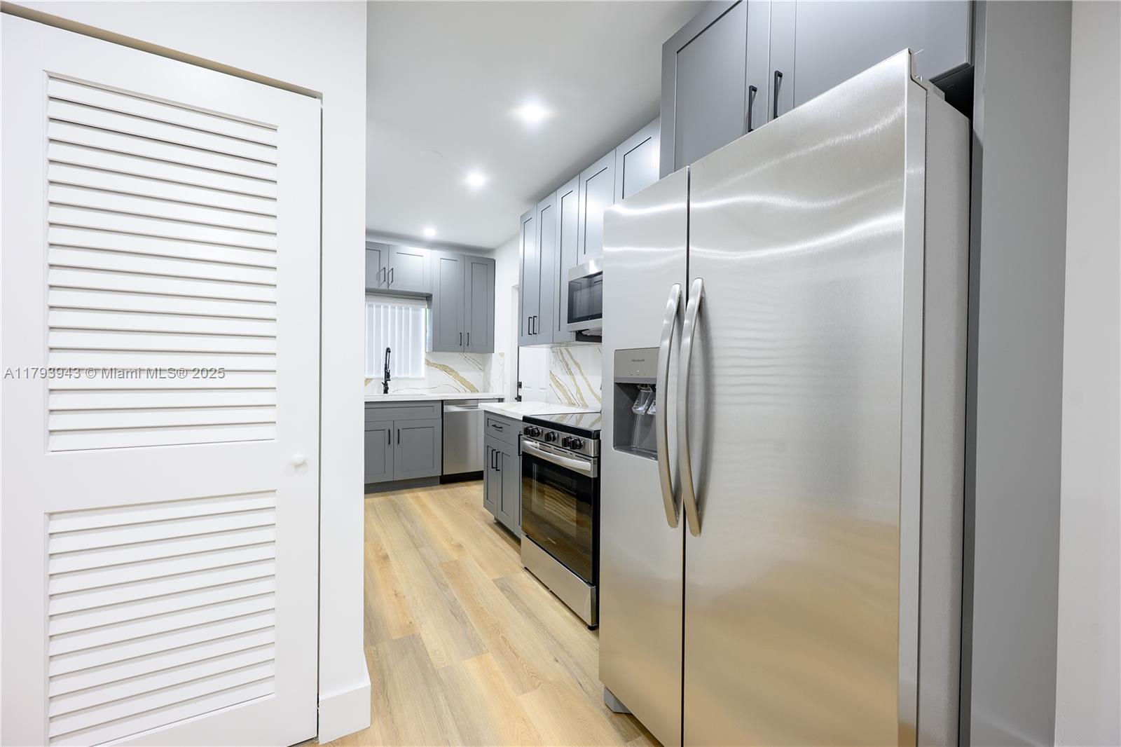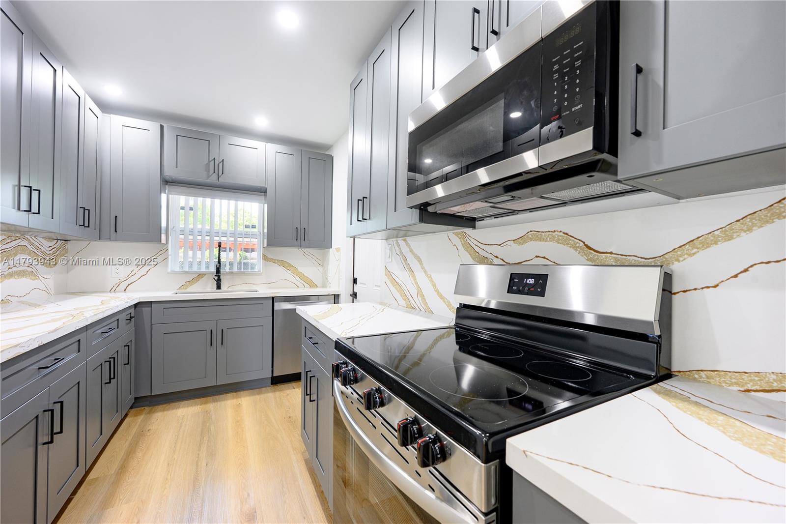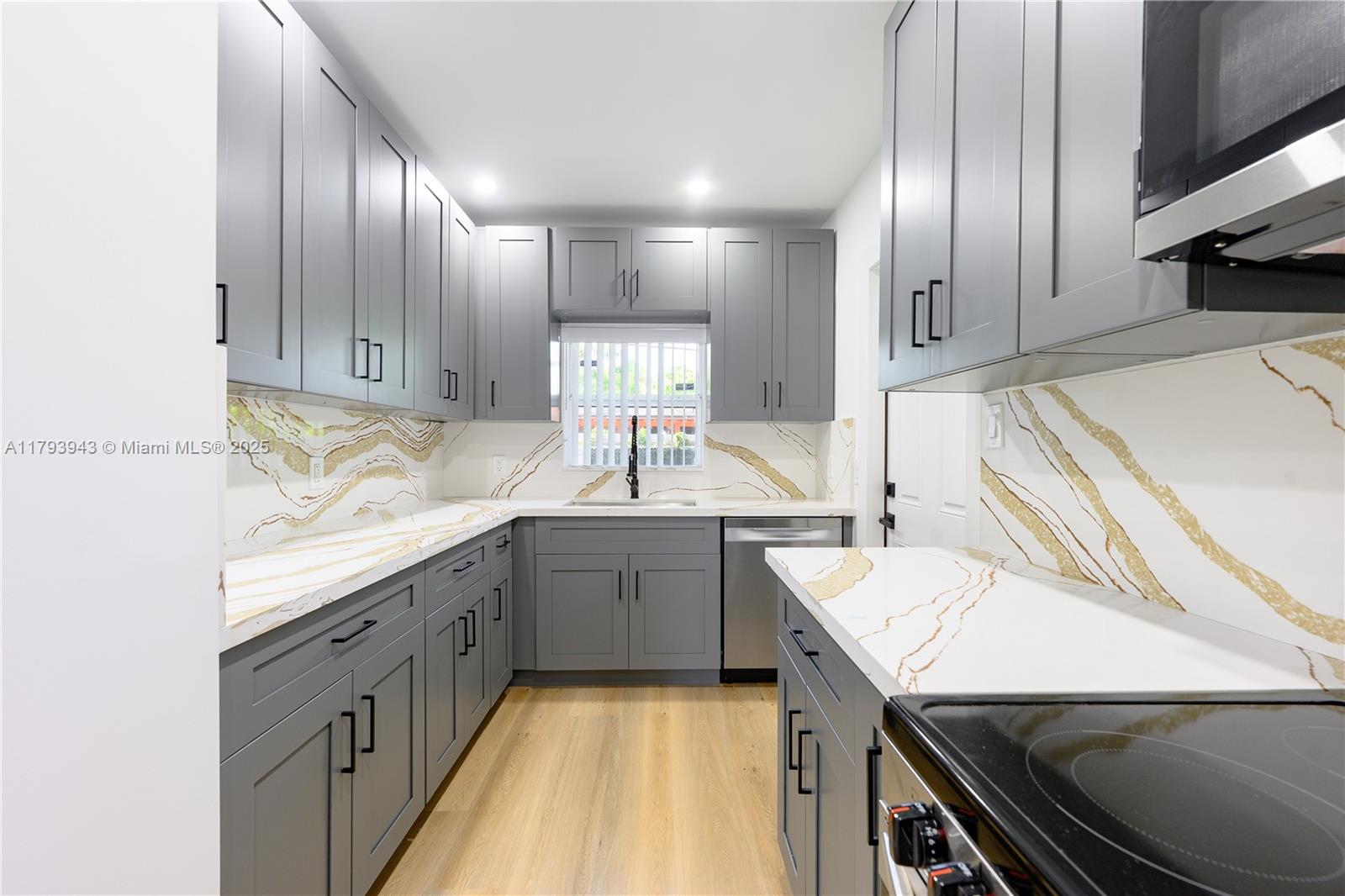 NEW roof installed in 2019! UPDATED home offering modern comfort. Features 2 spacious master bedroom suites, each with en-suite bathrooms and walk-in showers. New wood laminate flooring throughout, fresh interior and exterior paint, and an UPDATED kitchen with NEW appliances. 1 of the bedrooms also offers private access to the outside. Hurricane impact windows ensure safety and energy efficiency. The property boasts a large front yard and expansive side yard with ample space for RV or boat parking. Located on a quiet street, and near major expressways including I-95 and the Turnpike.