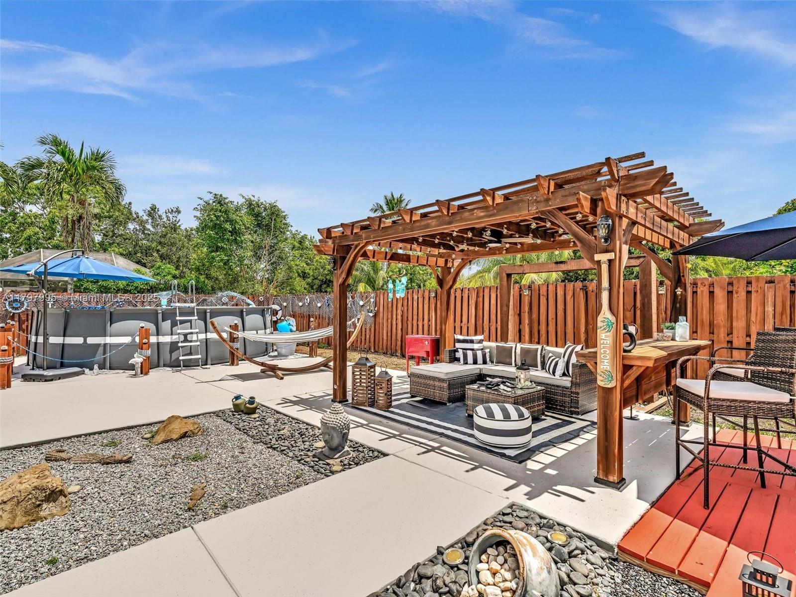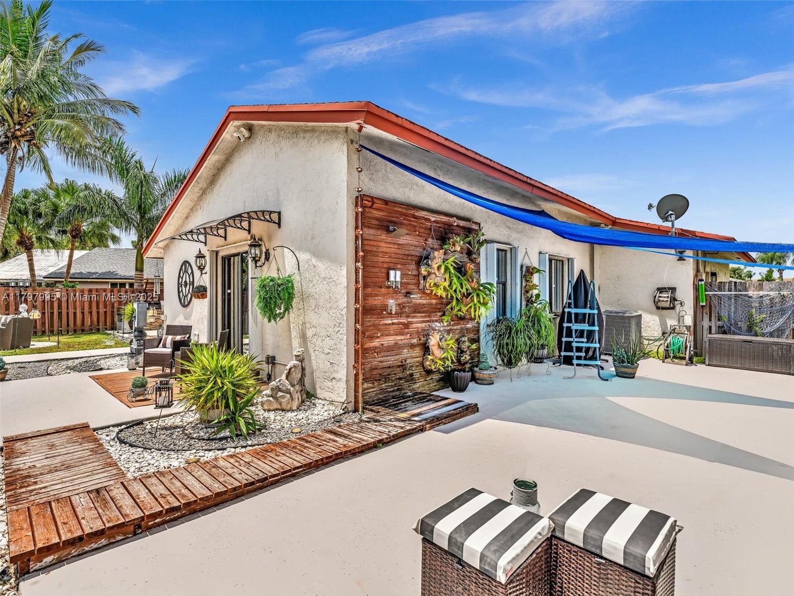 Exceptional value in Parkwood Homes III! This upgraded 3BR/2BA single-family home with 2-car garage offers a bright, open layout with vaulted ceilings, updated bathrooms, and a modern kitchen featuring stainless steel appliances, range hood, and wine cooler. Smart home features include 2022 A/C, Ring security system, and Wi-Fi garage opener. The private, fully fenced backyard is designed for entertaining with a pergola, summer kitchen, fire pit, outdoor shower, spacious deck, and above-ground pool. With a low $83/month HOA and a prime Sunrise location close to Sawgrass Mills, Markham Park, shopping, dining, top-rated schools, and major highways, this move-in-ready home delivers comfort, convenience, and lifestyle in one perfect package.