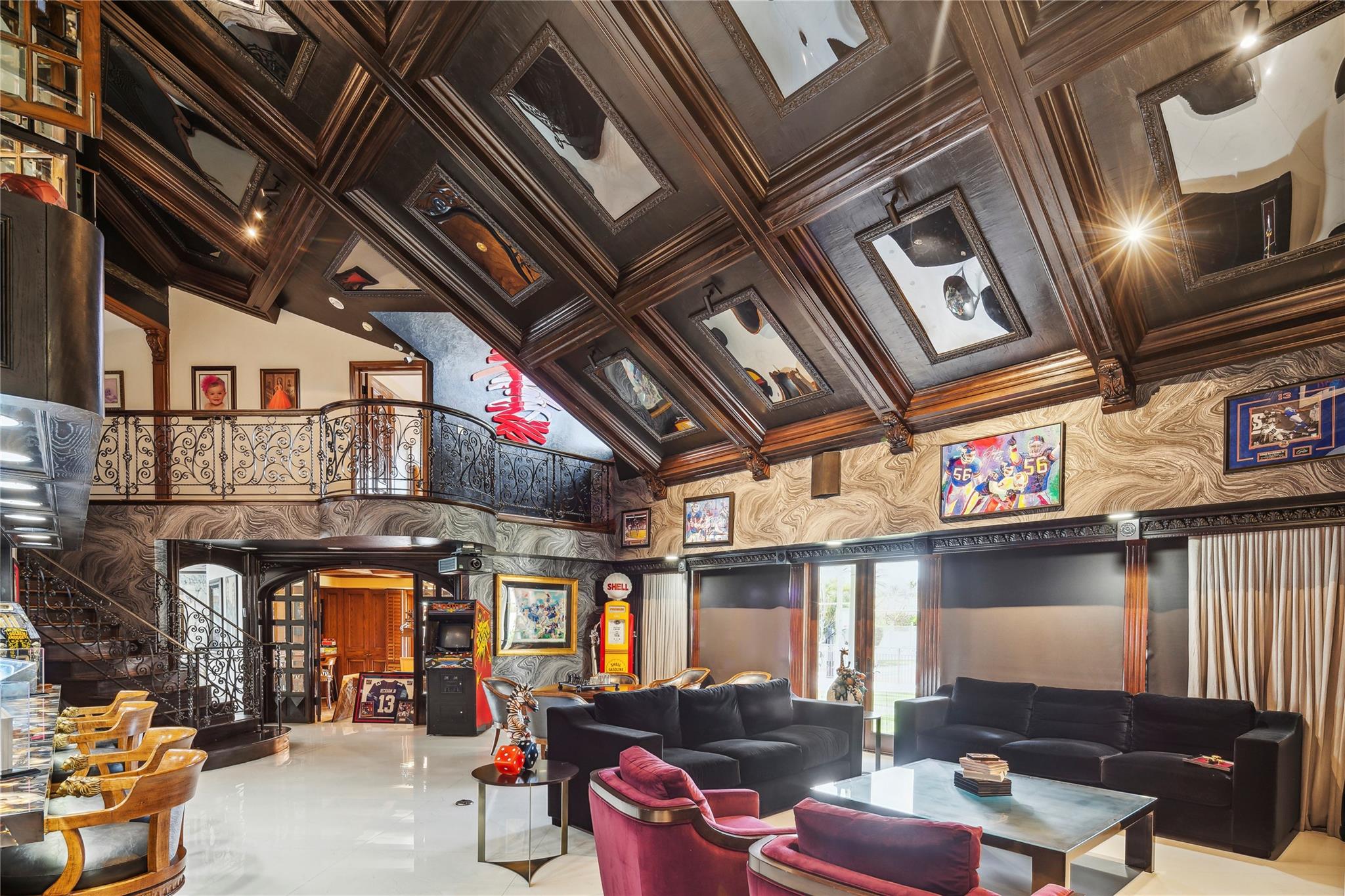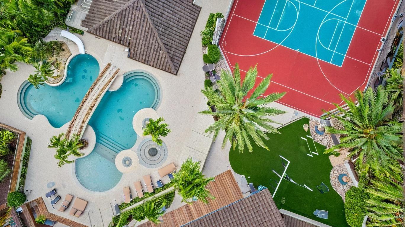 NEW IMPROVED PRICE! Discover the pinnacle of luxury on this 1.7-acre estate with 465 ft of waterfront across 4 lots. Boasting 15,000 sqft, this residence offers 8 bedrooms, 8.5 baths, a grand master suite with HIS & HERS areas, and a private sitting room. Includes a detached guest house and a separate pool house with cabana bath and studio apartment upstairs, a six car garage (split), 2 laundry rooms in main house, and a resort-style pool. Enjoy new tile floors, an upgraded kitchen, beautiful backlit agate bar, and plenty of storage. For recreation: a custom-painted basketball/tennis court, sand volleyball court and an outdoor grill area. Unparalleled privacy and elegance—don’t miss this extraordinary opportunity—true estates like this rarely come available!