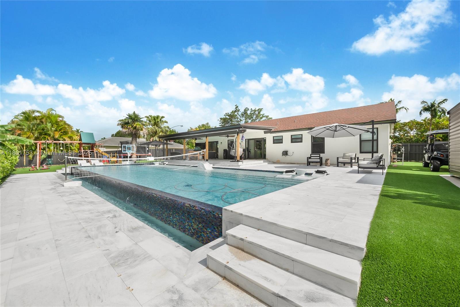 Experience Florida living in this 3/2 home with vaulted ceilings, a luxurious infinity pool, and your own private basketball court, with the option to rent a golf cart for added convenience. The home is enhanced with alkaline water, impact-rated French doors, and windows that bathe the interiors in natural light. Enjoy the benefits of low electrical bills thanks to solar panels. Additional features include an automatic mosquito misting system, landscape lighting, and a versatile AC-equipped garage that can serve as an office or extra room. The charming eat-in kitchen with a breakfast nook connects to the family room, while the spacious gated side yard is ideal for parking your boat or RV. For ultimate Florida lifestyle, this home offers all the amenities you desire.