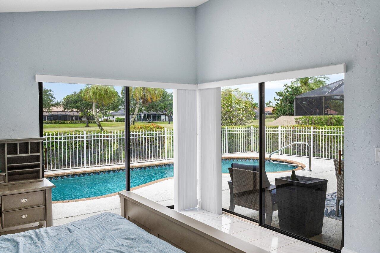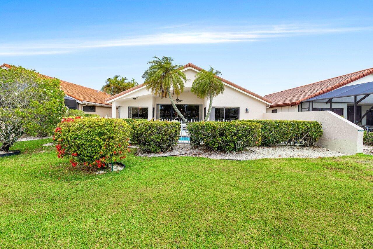 Located in the highly sought-after Boca Woods Country Club, this 3 bed/2 bath home is tucked away on a quiet cul-de-sac street. One of the few models featuring a unique front entry, this home welcomes you to a spacious split floor plan. Step outside to your private patio and pool, and enjoy peaceful fairway views, a truly serene setting perfect for relaxing or entertaining. Recent upgrades include remodeled bathrooms (2025) hurricane-rated garage door & fresh exterior paint. Boca Woods is an all age Country Club Community which offers resort style amenities, including two championship golf courses, Har Tru tennis courts, pickleball courts, state of the art fitness center, spa, game room, fully renovated clubhouse with fine dining and much more! Mandatory Country Club membership required.