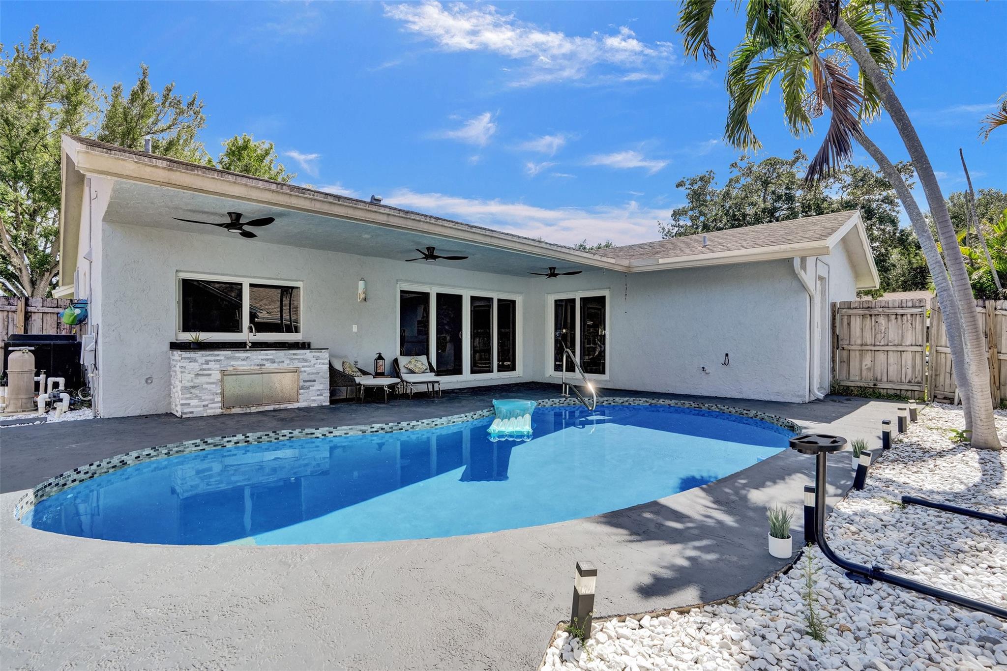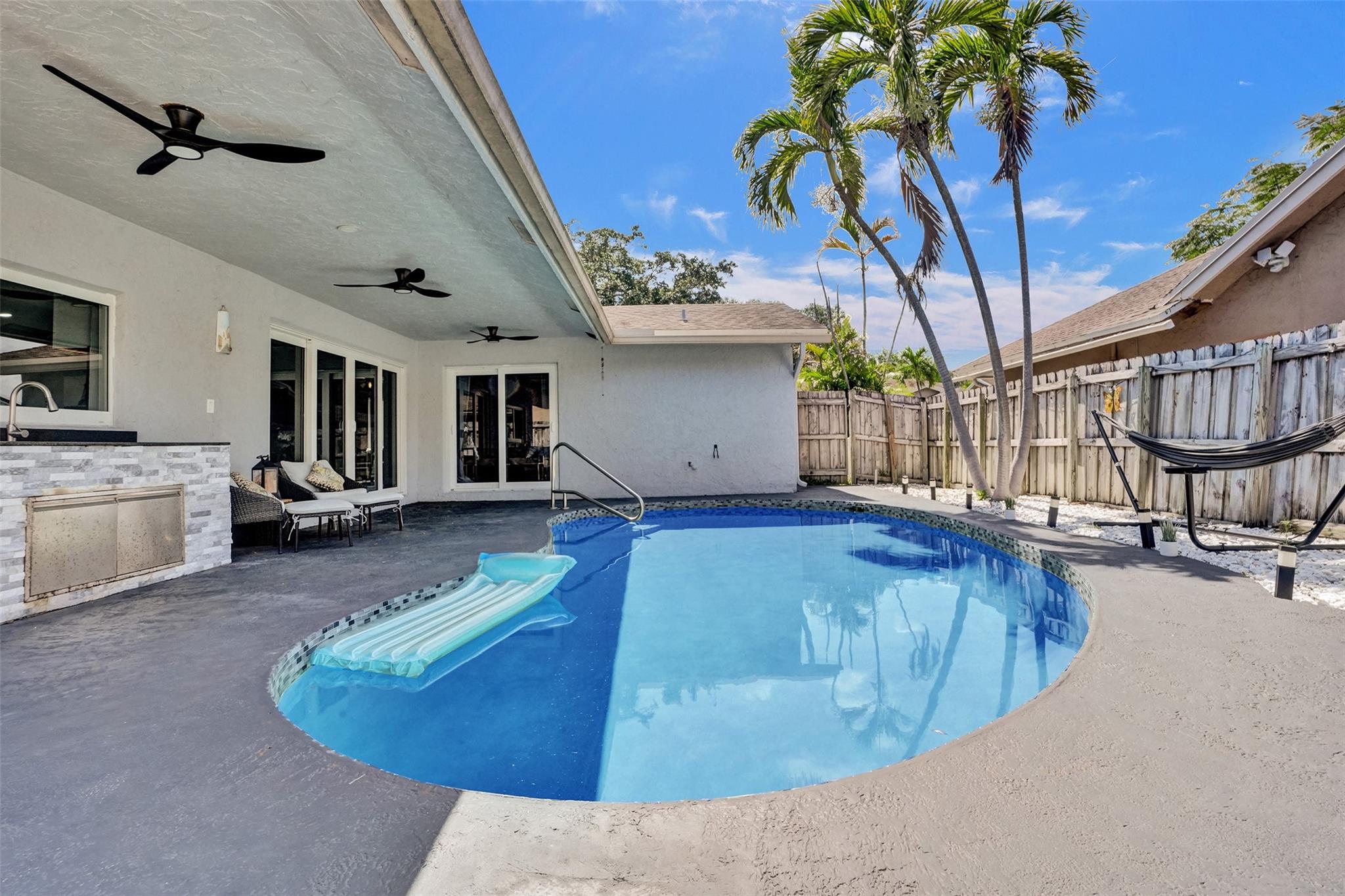 Welcome to this beautifully updated 4-bed, 2-bath corner lot home! Featuring an open floor plan with vaulted ceilings, recessed lighting, & large white tile flooring, this home exudes modern elegance. The upgraded kitchen boasts black granite countertops, high-gloss white cabinets, a spacious island with ample seating, stainless steel appliances, wine fridge, & coffee bar, perfect for entertaining. Enjoy peace of mind with hurricane impact windows, a tankless water heater, & zebra blinds throughout. The primary bath includes a cabana door leading to the backyard oasis, with a recently re-diamond brited & re-tiled kidney-shaped pool & fenced. Additional features : a 2-car garage & low annual HOA fee of just $300. Situated near University Drive, you're close to shops, restaurants, and more.