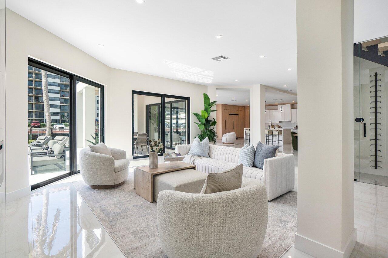 Welcome to this fully renovated waterfront home in East Boca Raton's highly sought-after Boca Keys community. With 90 feet of water frontage and a 40-foot dock just two homes from the Intracoastal, this residence blends modern design with thoughtful, high-end updates throughout. Inside, you'll find a seamless combination of porcelain tile and white oak flooring, a custom floating staircase crafted from white oak with open risers, and a dedicated wine cellar. The home is outfitted with code-compliant PGT hurricane impact windows and doors, ensuring top-tier storm protection. The kitchen has been completely remodeled, featuring premium cabinetry, quartz countertops, top-of-the-line appliances, and a stylish designer backsplash. Step outside to enjoy a rebuilt marble pool deck, a brand-new