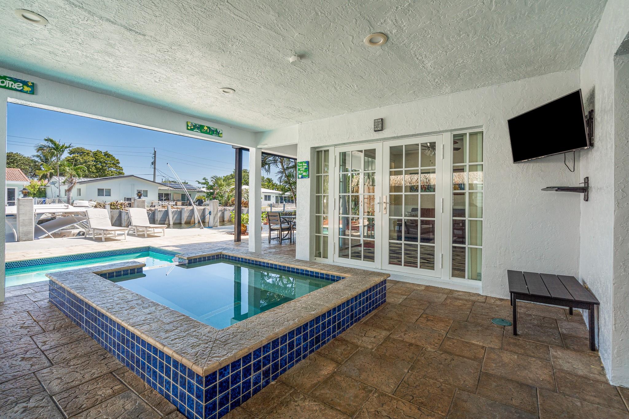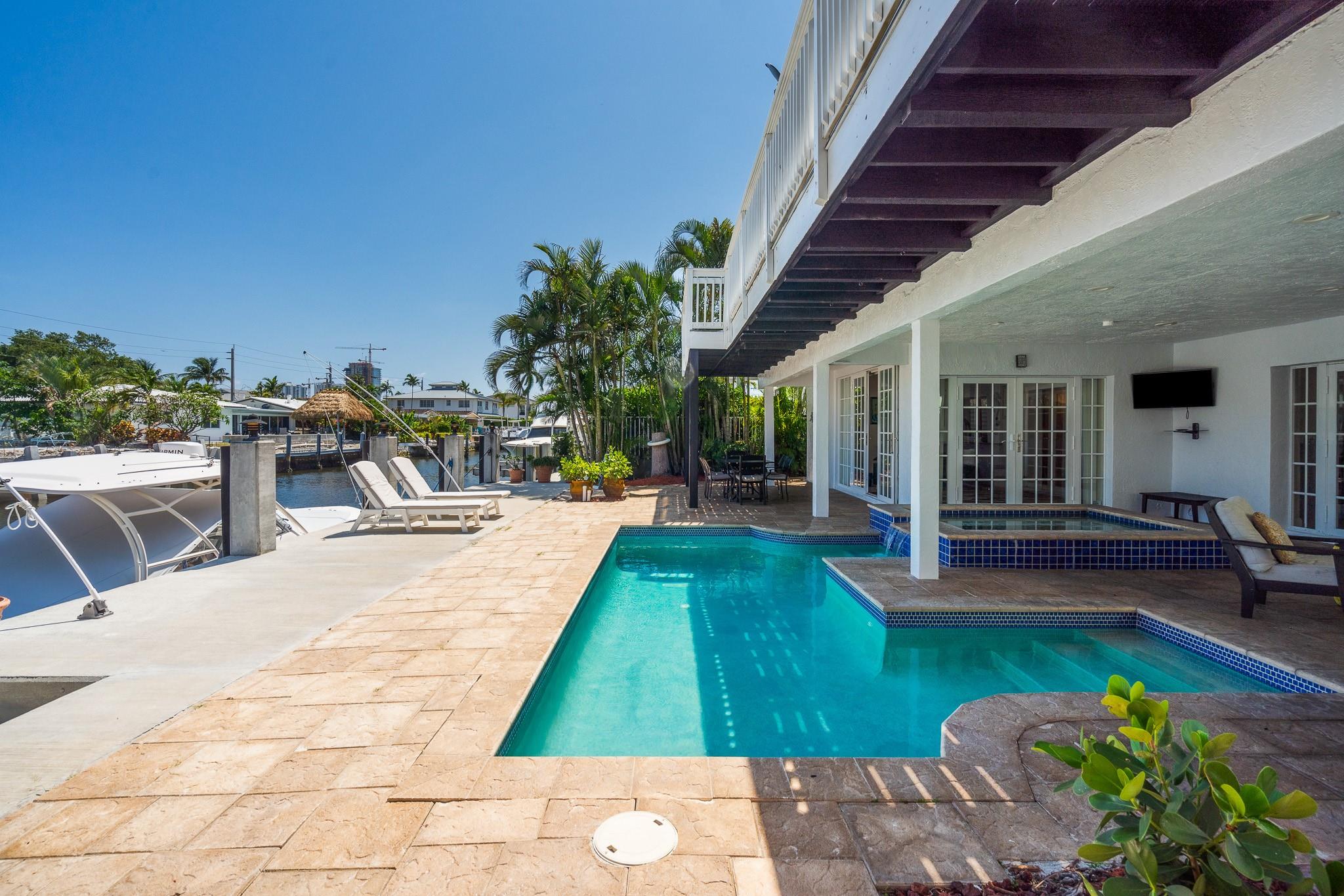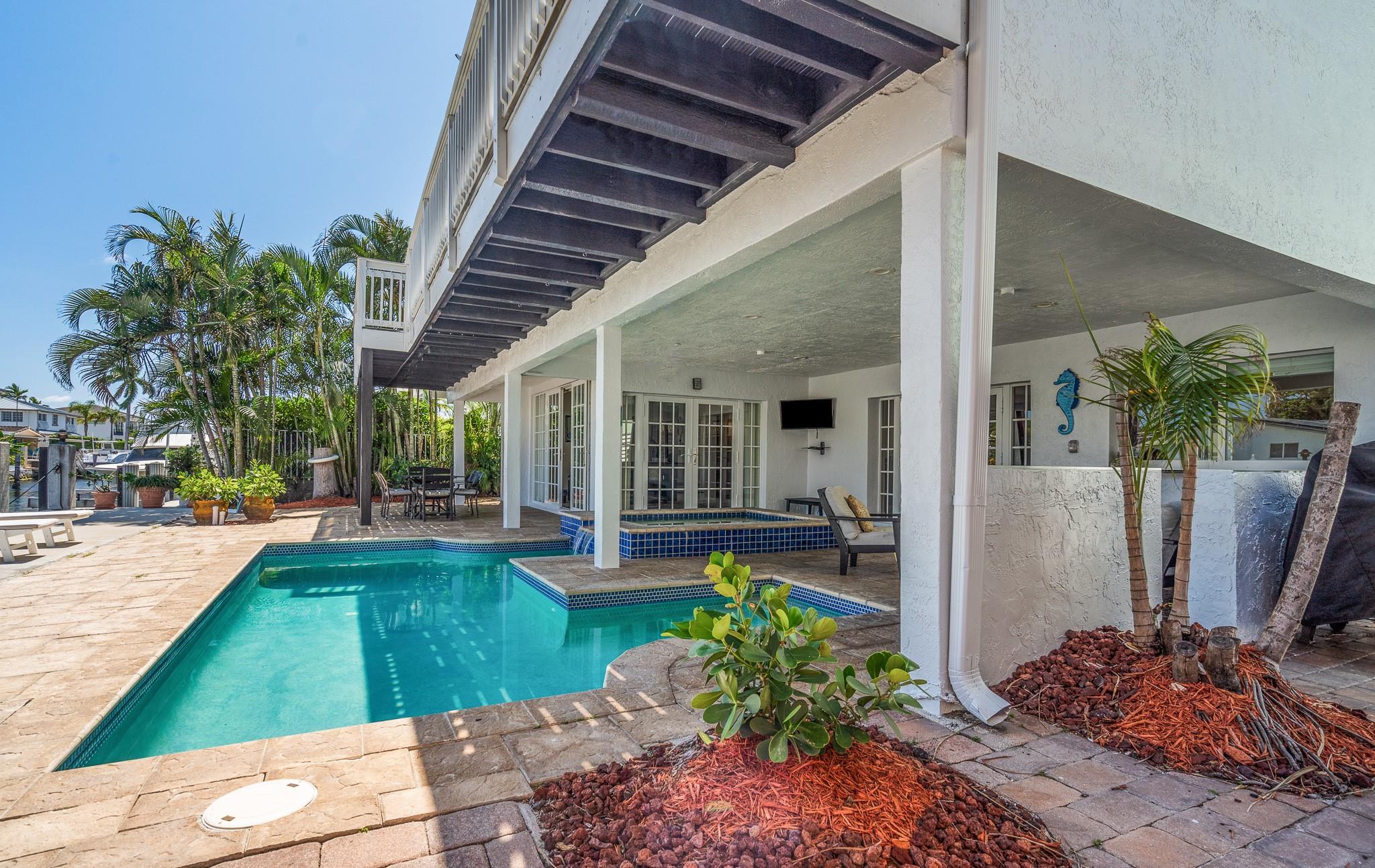 Beautifully designed 4-bedroom, 3-bathroom, two-story home. Waterfront lot with a private dock with direct ocean access—no fixed bridges -60 feet of Waterfront Featuring three bedrooms and two full baths on the main level, ideal for family, guests, or a home office. Upstairs, the private master bedroom with the entire second floor, water views, balcony, a large walk-in closet, and an en-suite bathroom. New Fresh exterior Paint, impact windows and doors. Bright and open living area, seamlessly connecting to the kitchen with premium appliances and granite countertops. Spacious patio with a heated pool and spa, surrounded by tropical landscaping and ample lounging space. This residence is a dream come true for boating enthusiasts and delivers the ultimate waterfront lifestyle.