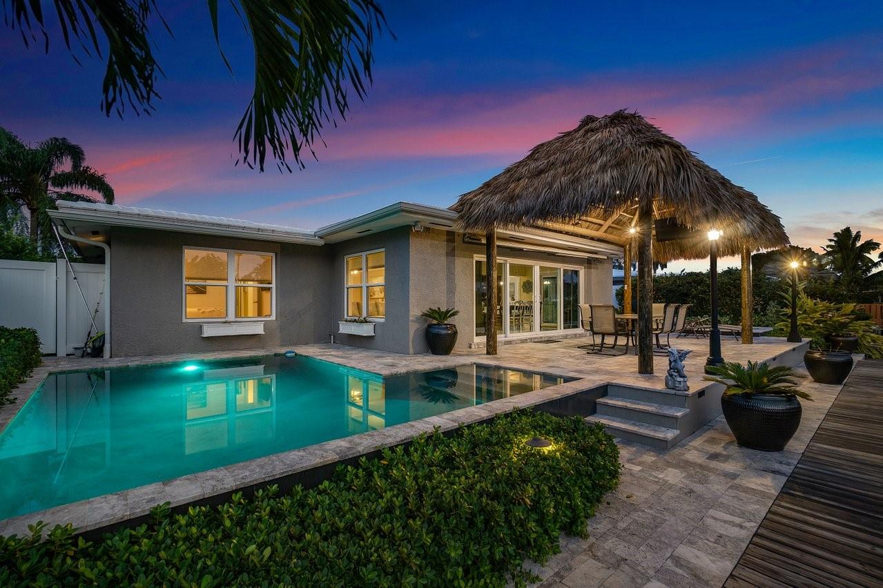 Updated Waterfront Home in Sought After Pompano Beach! Enjoy tranquil water views from almost every room in this 3 Bedroom, 2 Bath, 2 Car Garage home that boasts a desirable Split Floorplan w/Spacious Open Kitchen, Dining & Living Area. Solid Wood Cabinets, Granite Counters & Stainless Appliances complete the Chef's Kitchen. Fantastic Large Interior Laundry Room with Wood Cabinets, Granite Counters & SS sink. Enjoy Incredible Sunset Views while shaded beneath the Gorgeous Tropical Tiki Hut that welcomes you to the serene Backyard Oasis complete w/Easy to Care for Heated Salt Water Pool & Separate In Ground Jetted Spa. So Many Extras including a Marble Patio & Driveway, All Impact Windows & Doors plus a New Roof, New Batter Pilings & New Sea Wall Cap in 2015 Make This Home A Must See!