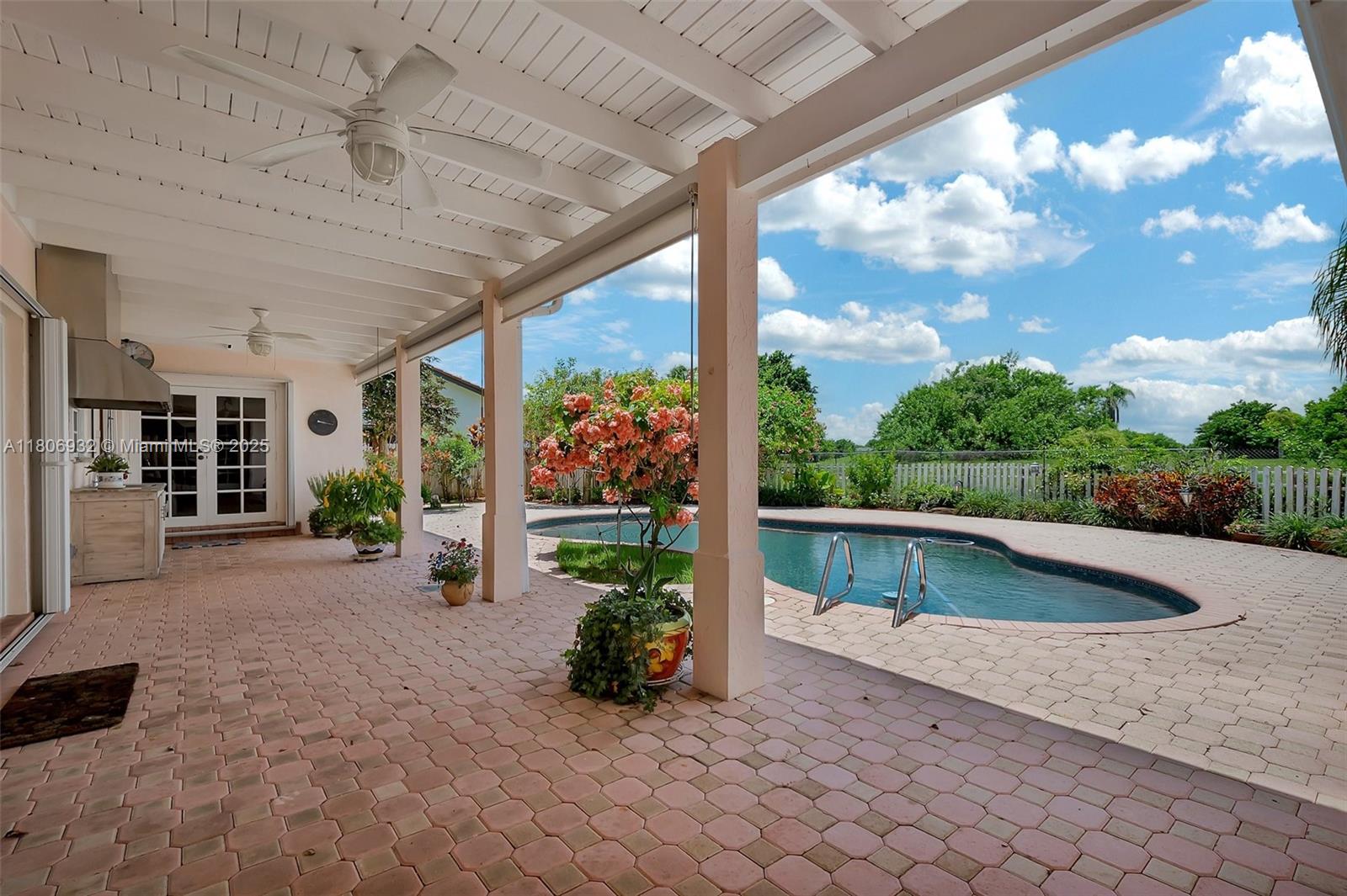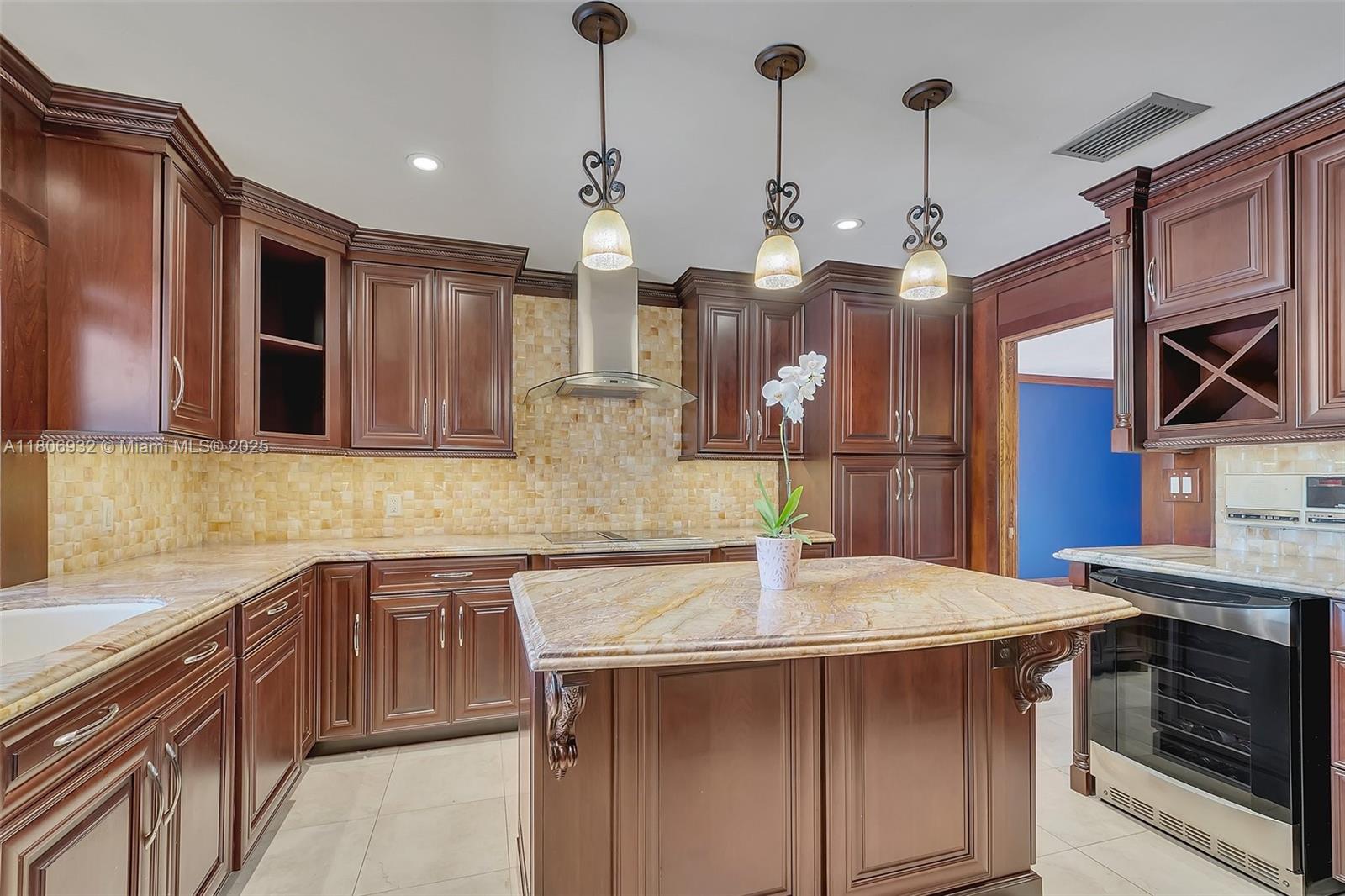Custom, rock lathe and plaster constructed updated beauty. Entertain in style with a one of a kind kitchen featuring a wine cooler, double oven, Jennaire stove top, stunning cherrywood cabinetry with soft closing drawers and cabinets, pull out pantry, double oven, granite & onyx backsplash, island, and top of the line appliances. Charming crown moldings, French doors, & stunning baths with high end Kohler fixtures. Spacious family room features a wood burning fireplace and wet bar/ice maker. Enjoy the primary bath whirlpool jet tub w/shower, double onyx sinks, stunning granite counters, and door to lanai. The lovely pebble tech pool is surrounded by interlocking brick paver patio. Unbeatable location near turnpike, Costco, numerous Publix stores, fine dining & excellent schools.