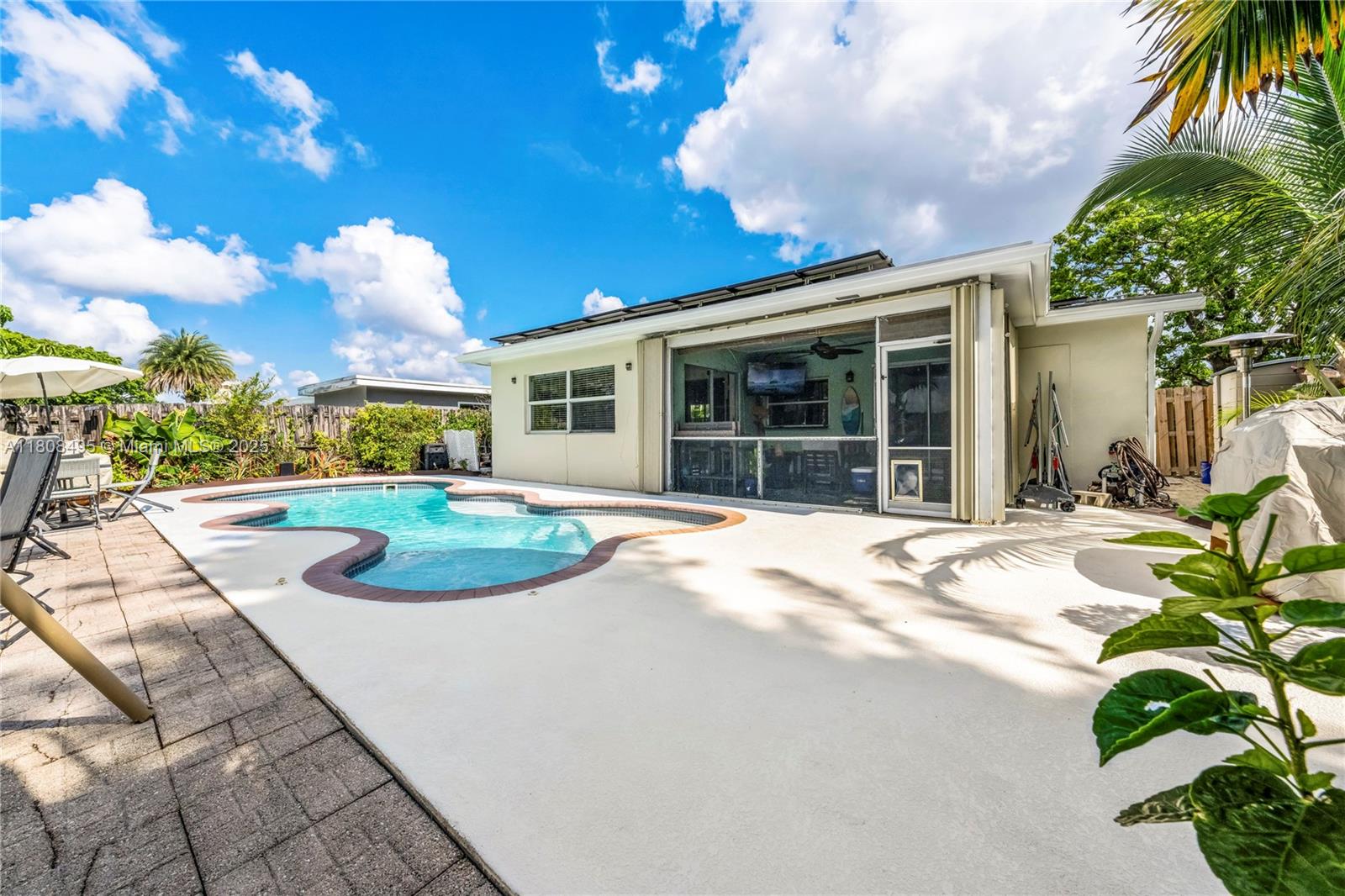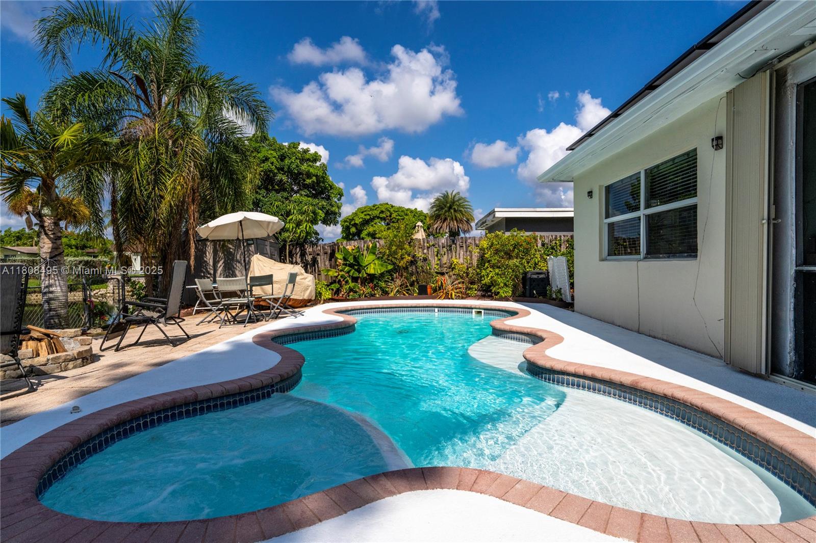 Boutique tropical 3/2 home with elegant landscaping, heated pool and jacuzzi for year-round use. This exquisite newly renovated home features pass-through kitchen, granite countertops, new flooring, beautiful bathrooms and garage with central AC that can also be used as 4th bedroom, or den. Sparkling pool features salt water chlorination and efficient gas water heater. Modern electric system virtually eliminates electric bills, saving hundreds monthly with a fully warrantied solar panel system. Hurricane windows and doors provide full protection and reduce property insurance cost. AC and roof are less than 5 years old. Picturesque fully fenced backyard and open home layout are perfect for entertaining. Situated near Sawgrass Mills, Amerant Arena and 12 miles from beach. A true dream home.