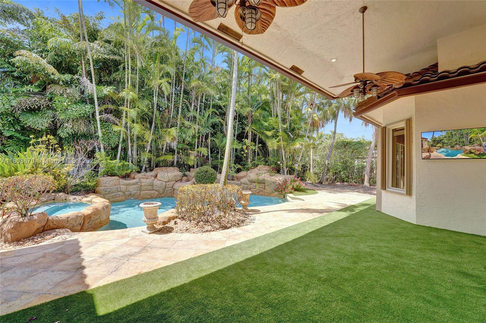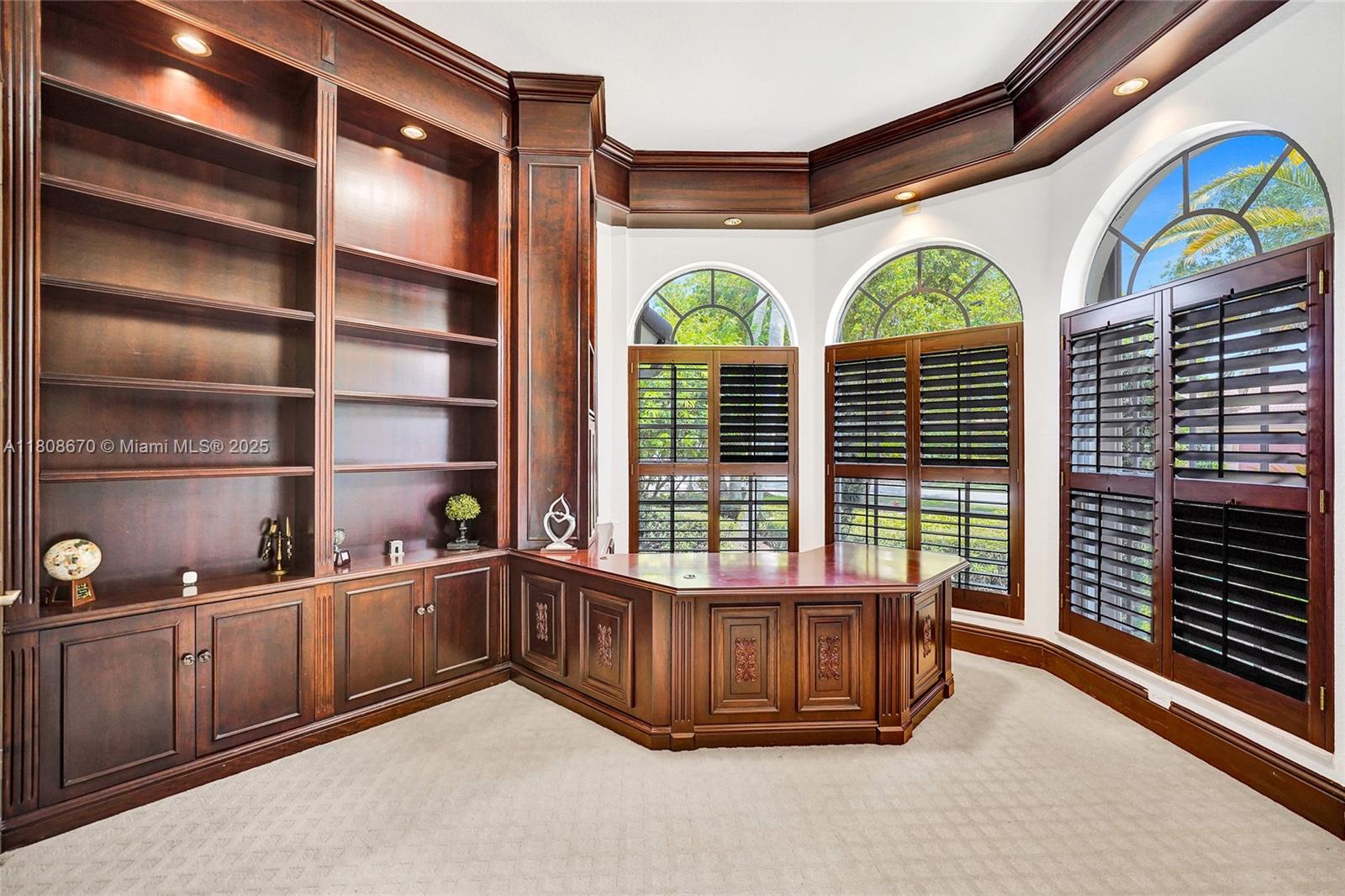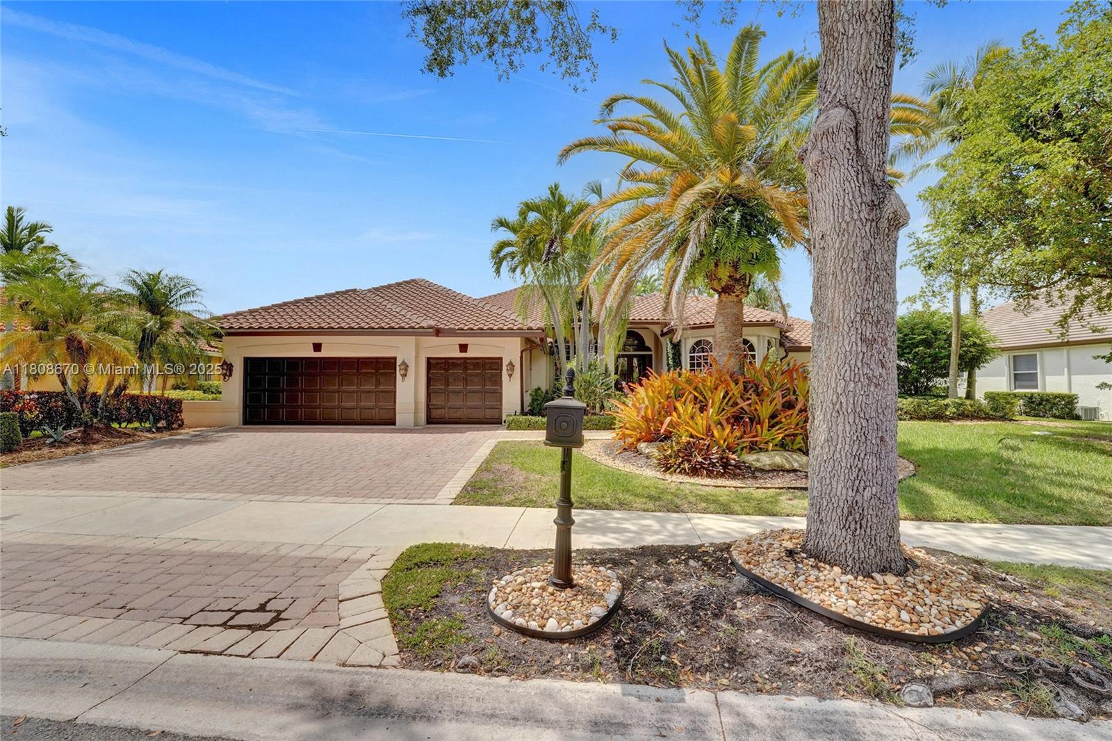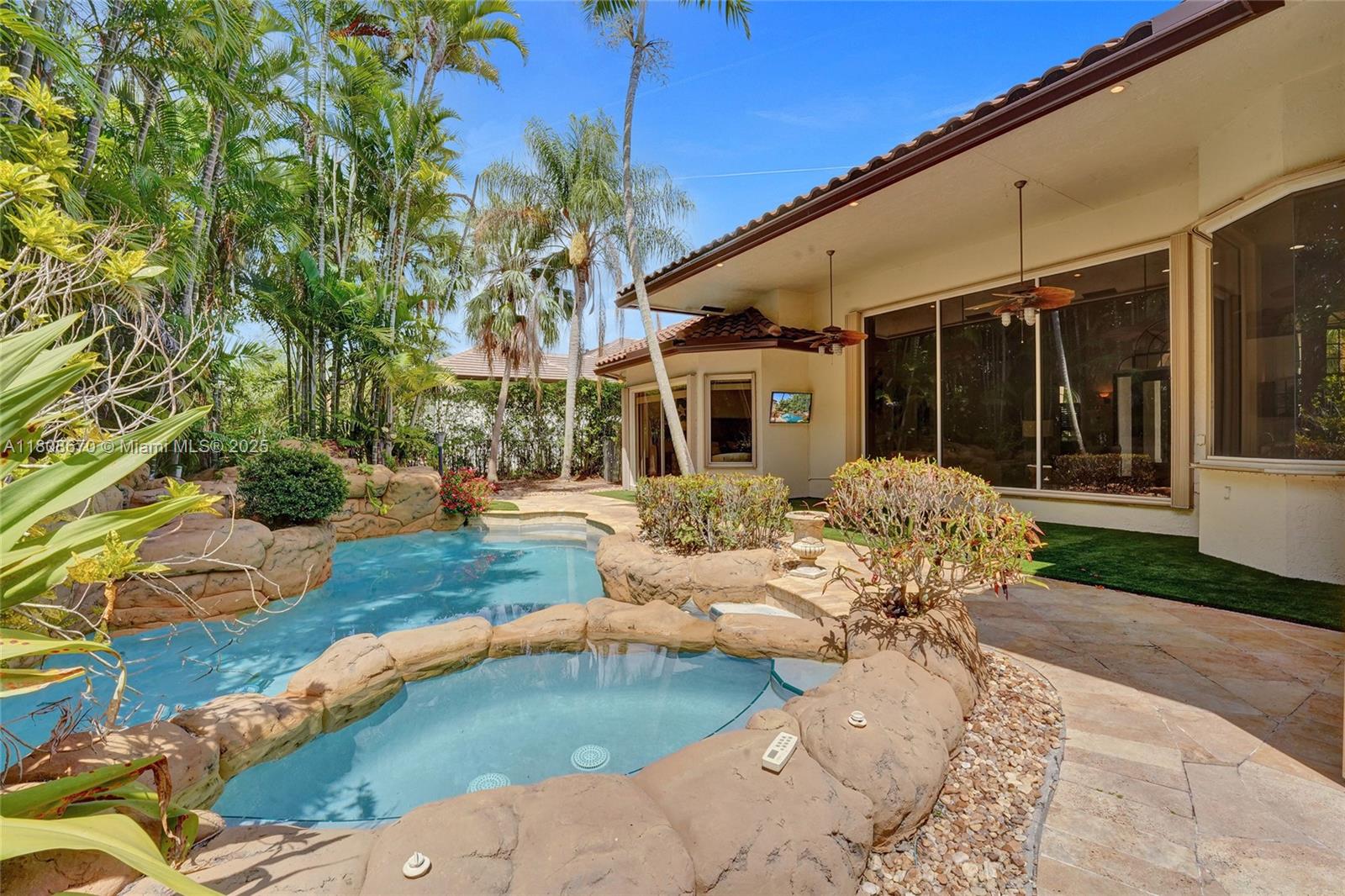 Set on beautifully landscaped 14418 sqft lot, this custom 3,818 sqft residence offers 2020 roof, paver driveway, and accordion shutters. Inside, rich wood flooring, fresh paint, and refined crown molding. At heart of the home, chef’s kitchen showcasing white cabinetry, granite countertops, Sub-Zero refrigerator, and Thermador cooking appliances. Expansive primary suite is a retreat with tray ceilings, dual closets, spa-inspired bath, and direct access to backyard. Three additional bedrooms, private office, and 3.2 baths ensure ample space for family and guests, while thoughtful upgrades: LED lighting, cabana bath, and epoxy-finished garage. Outside, unwind in your own paradise: saltwater pool and spa framed by travertine deck. Perfect blend of luxury, function, and style!