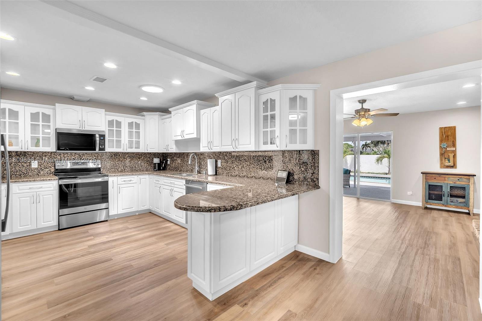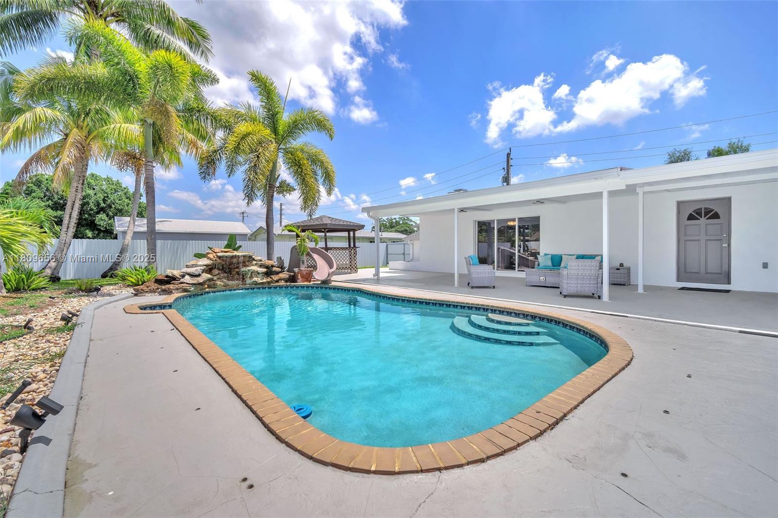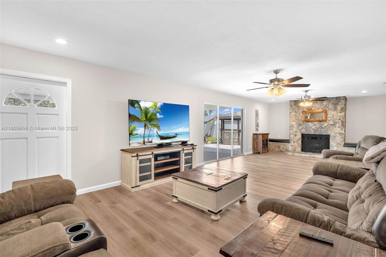 REDUCED!! Gorgeous Davie Home! Tastefully remodeled, spacious 3 bed, 2.5 bath. Open living areas. Large family room! Beautiful stone fireplace. Open eat in kitchen with wood cabinets, granite counters & stainless-steel appliances. Large bedrooms. Walk in closets. Completely remodeled in 2023- New roof, new bathrooms, new flooring, new water heater, freshly painted interior & exterior, new electrical components, lighting & ceiling fans. Covered terrace and swimming pool ideal for entertaining. The pool area is an oasis, with landscaped rocks, palm trees and a beautiful gazebo. Asphalt parking areas for a large RV & a large boat. No rear neighbors. No HOA. Securely fenced. Quiet and private dead-end street. Close proximity to Nova University, highways, shopping centers, horse trails & parks.
