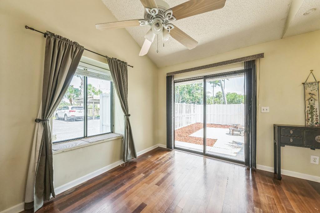 Perfectly located, Jupiter townhome, with 3 bedrooms, 3 bathrooms, and a large loft. The living room offers vaulted ceilings. A great layout for gathering with friends and family. The oversized master bedroom is located downstairs and features it’s own en-suite bathroom as well as a private entrance from the back patio. One guest bedroom and full sized guest bath are also located downstairs. Upstairs is the second guest bedroom, full sized bath and large loft. Outside enjoy the expansive, privately fenced, front patio. One covered and one uncovered assigned parking spots. New roof. Community pool!!!