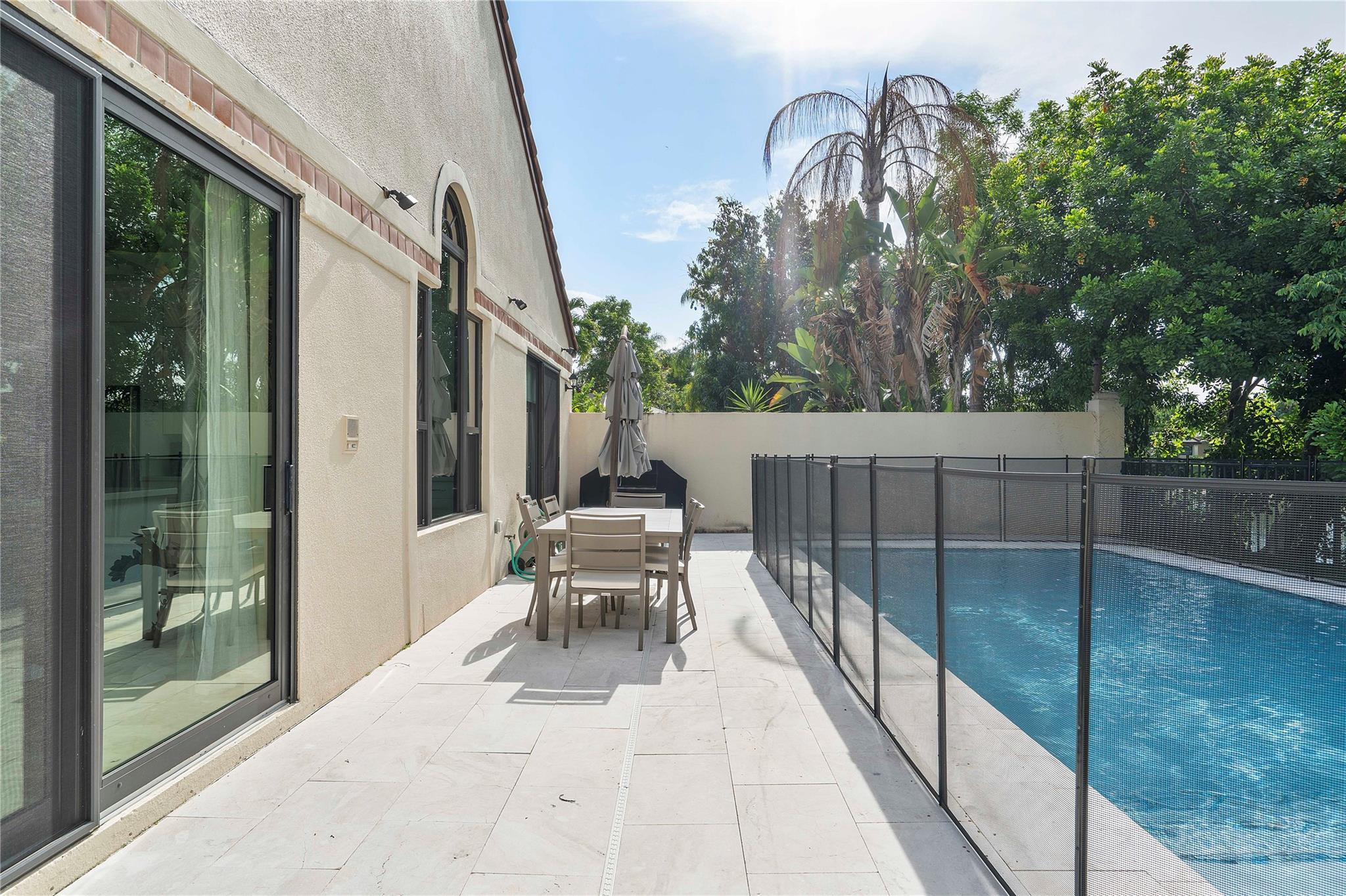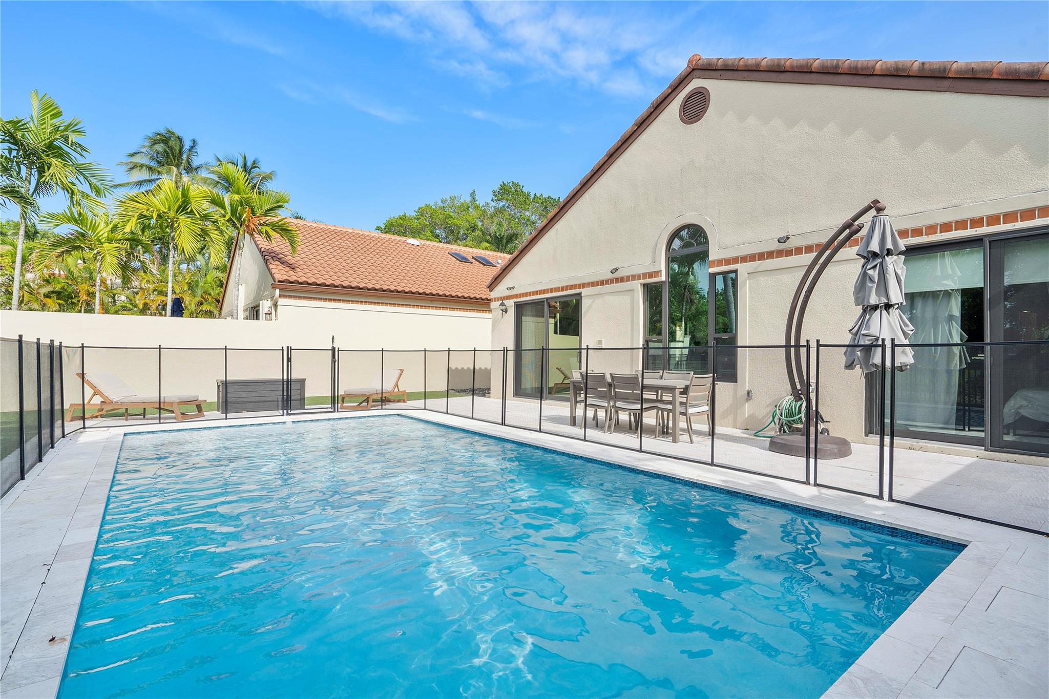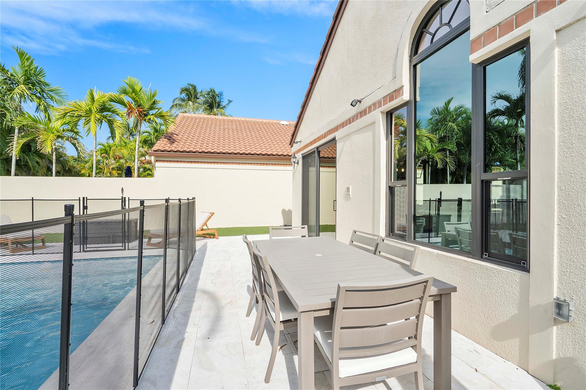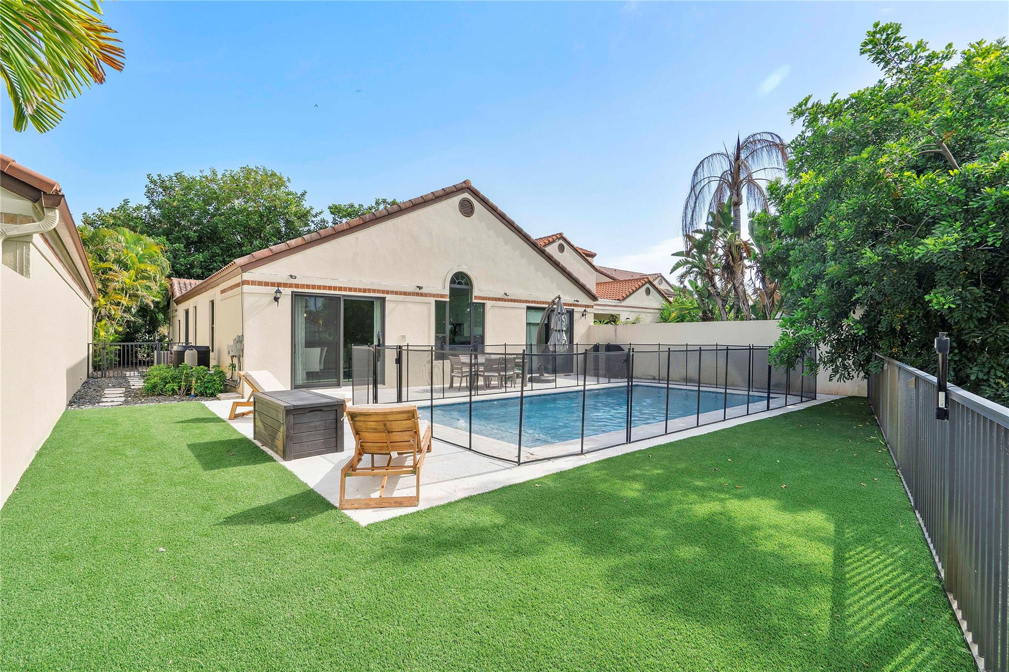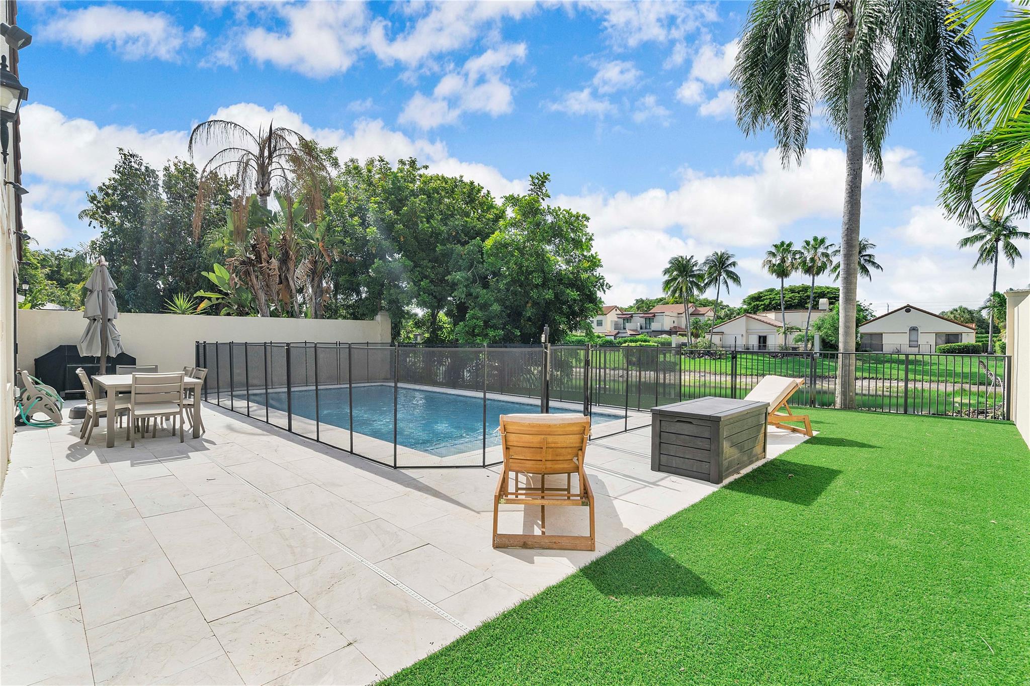 This beautifully renovated 3-bedroom, 2-bathroom home is located in the highly sought-after community of Valencia at Boca Pointe. The roof is from 2009, hvac system was replaced in 2022. Interior features an expansive kitchen with white wood cabinetry, sleek white quartz countertops, and premium stainless steel appliances, high-end laminate flooring throughout and upgraded marble bathrooms by Porcelanosa, including a luxurious master bath with a bidet. The home boasts smooth wall and ceiling finishes with crown moldings and wainscot. Impact windows and doors installed in 2020. The private backyard oasis includes a heated, saltwater pool built in 2023 by Van Kirk, with an expansive marble deck, fully fenced yard that features artificial turf throughout the rear outdoor space done in 2023.