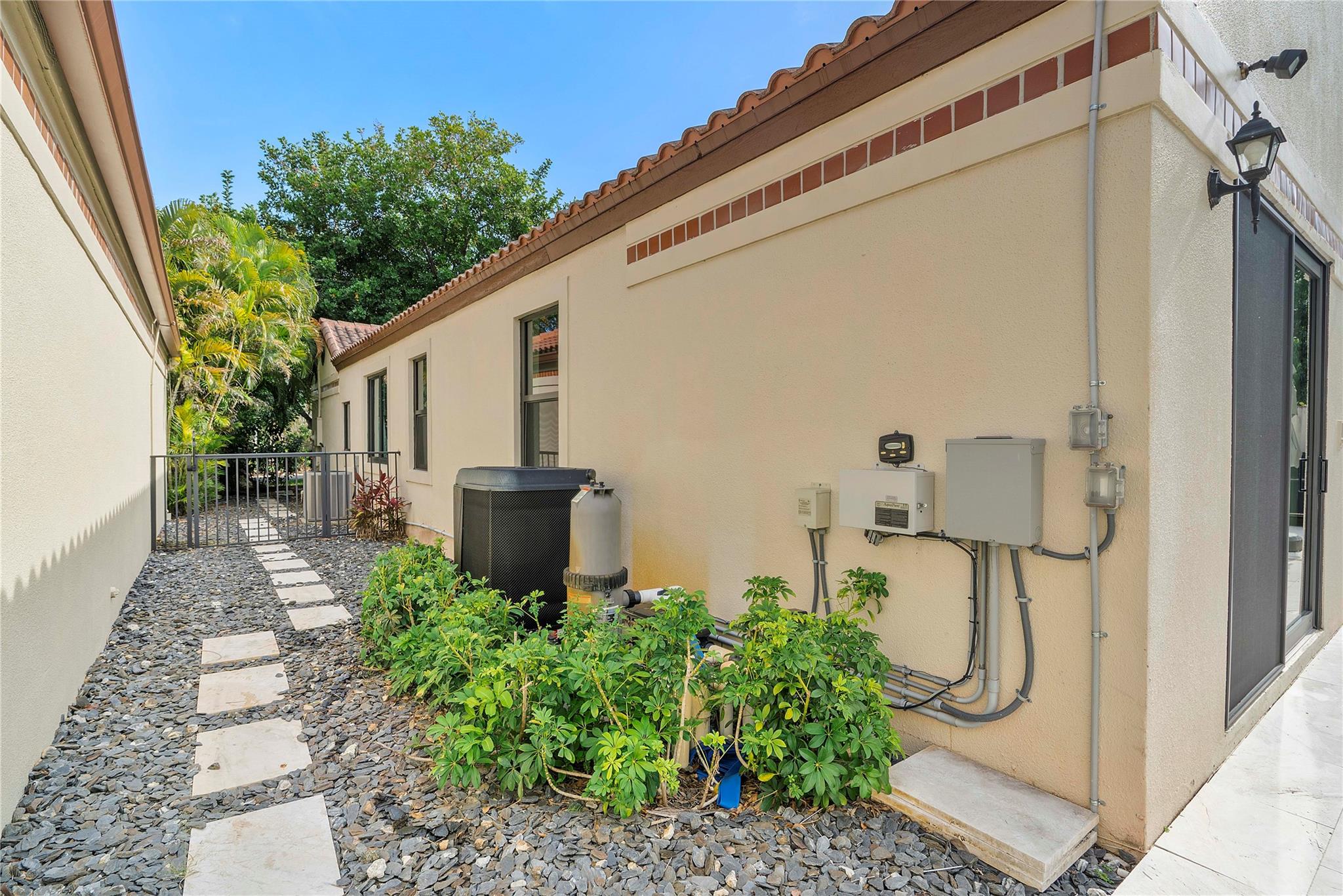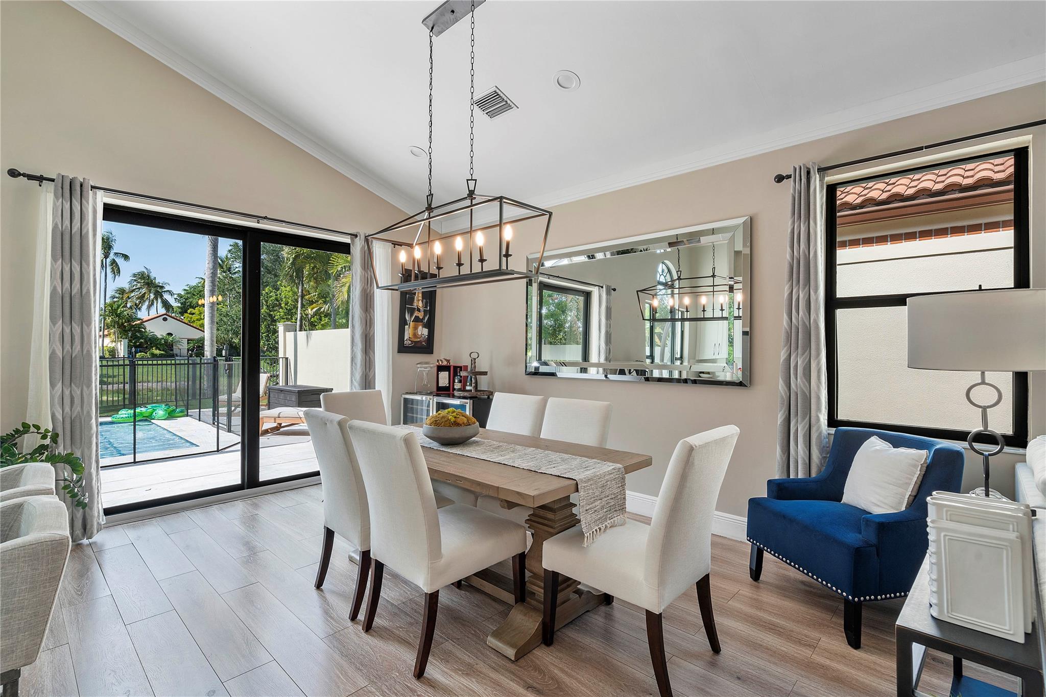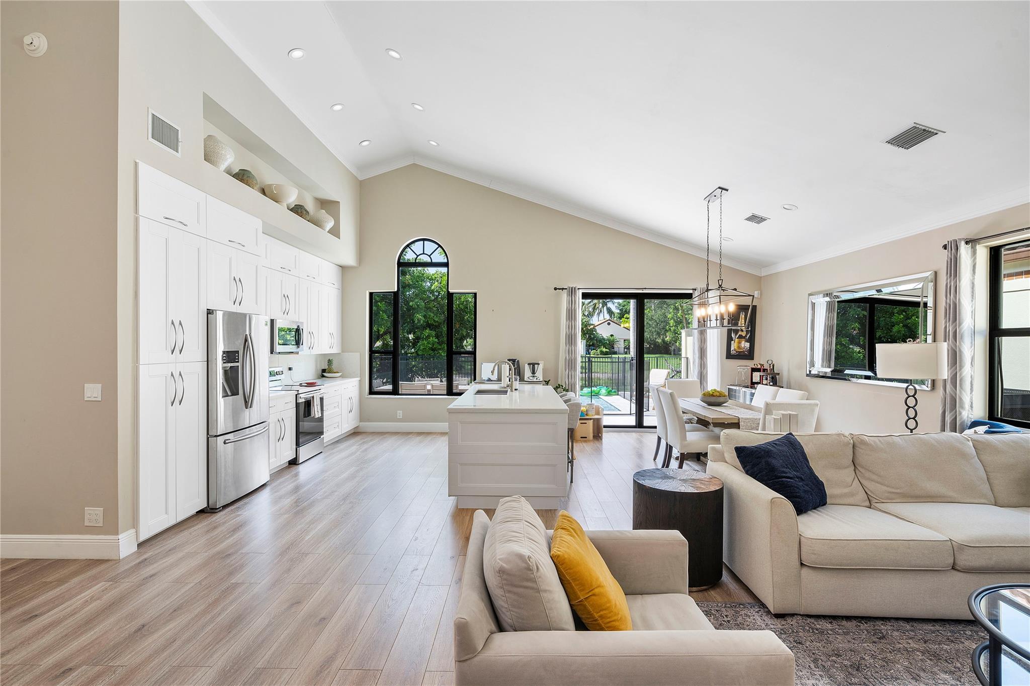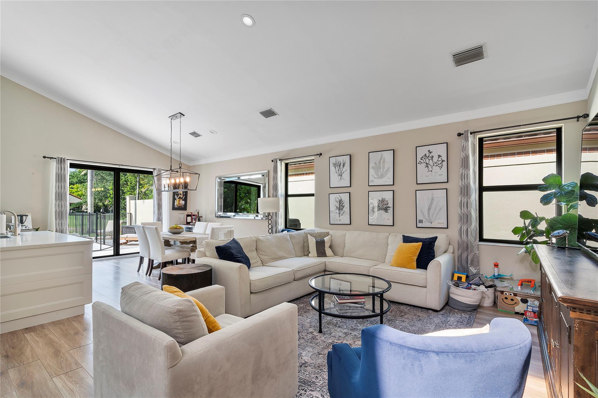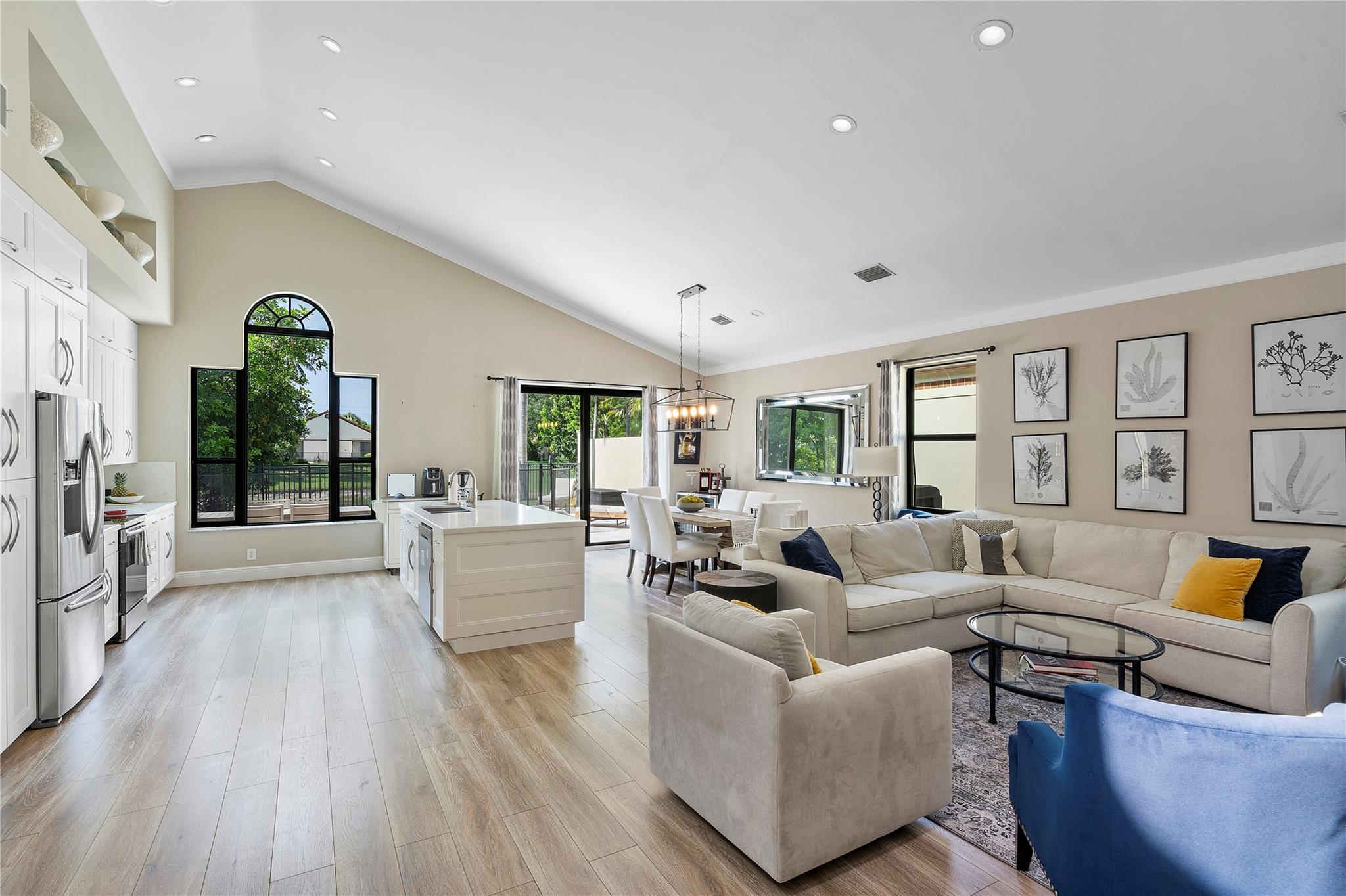 This beautifully renovated 3-bedroom, 2-bathroom home is located in the highly sought-after community of Valencia at Boca Pointe. The roof is from 2009, hvac system was replaced in 2022. Interior features an expansive kitchen with white wood cabinetry, sleek white quartz countertops, and premium stainless steel appliances, high-end laminate flooring throughout and upgraded marble bathrooms by Porcelanosa, including a luxurious master bath with a bidet. The home boasts smooth wall and ceiling finishes with crown moldings and wainscot. Impact windows and doors installed in 2020. The private backyard oasis includes a heated, saltwater pool built in 2023 by Van Kirk, with an expansive marble deck, fully fenced yard that features artificial turf throughout the rear outdoor space done in 2023.