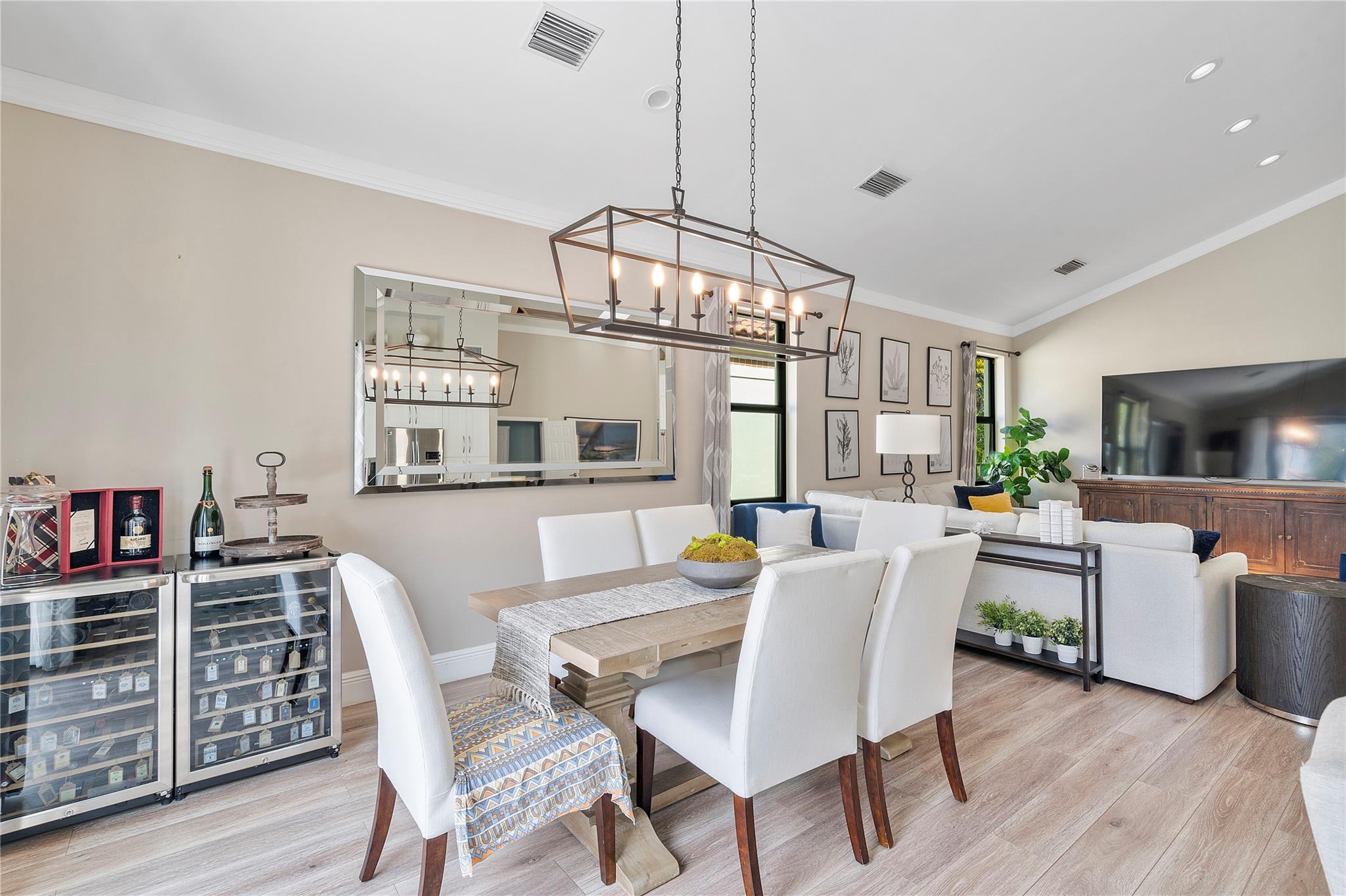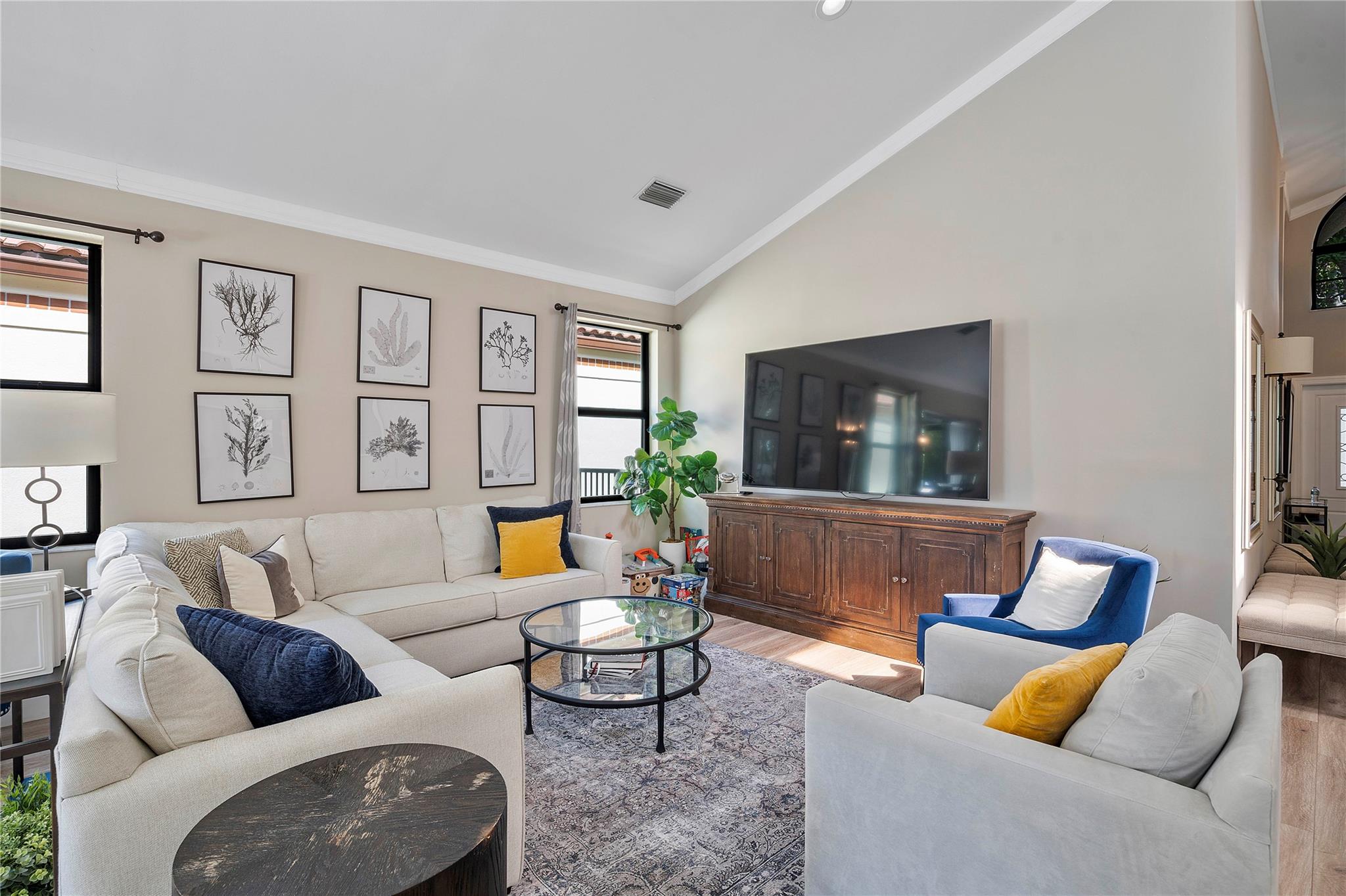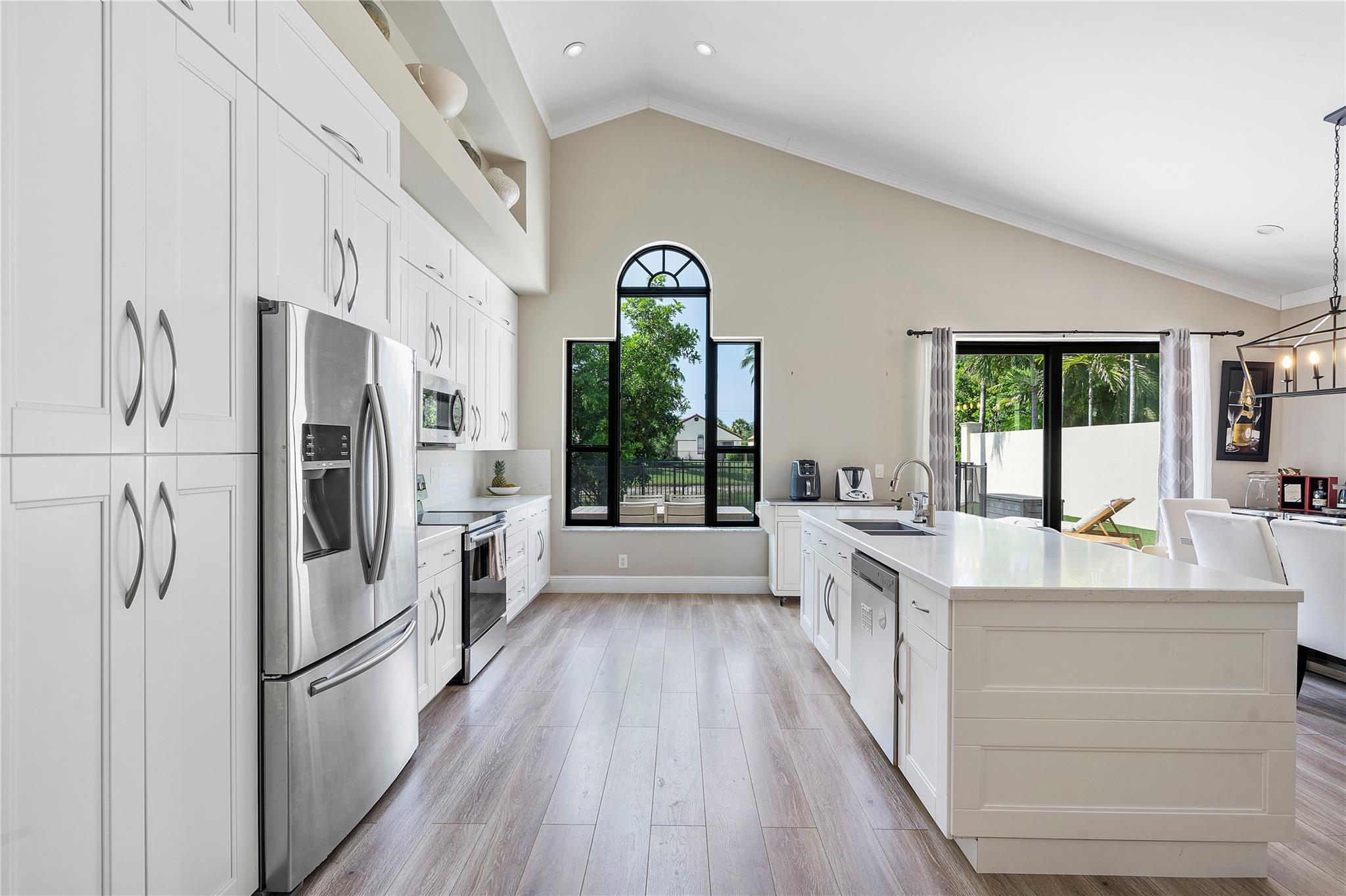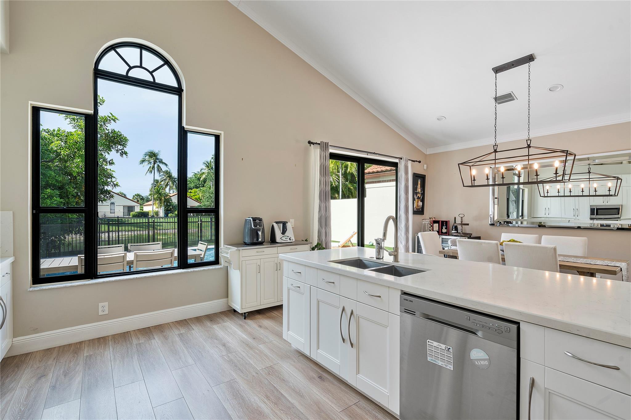 This beautifully renovated 3-bedroom, 2-bathroom home is located in the highly sought-after community of Valencia at Boca Pointe. The roof is from 2009, hvac system was replaced in 2022. Interior features an expansive kitchen with white wood cabinetry, sleek white quartz countertops, and premium stainless steel appliances, high-end laminate flooring throughout and upgraded marble bathrooms by Porcelanosa, including a luxurious master bath with a bidet. The home boasts smooth wall and ceiling finishes with crown moldings and wainscot. Impact windows and doors installed in 2020. The private backyard oasis includes a heated, saltwater pool built in 2023 by Van Kirk, with an expansive marble deck, fully fenced yard that features artificial turf throughout the rear outdoor space done in 2023.