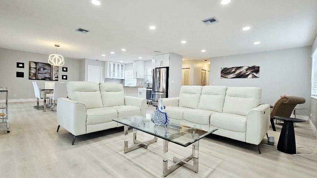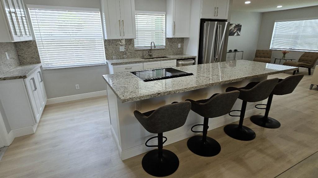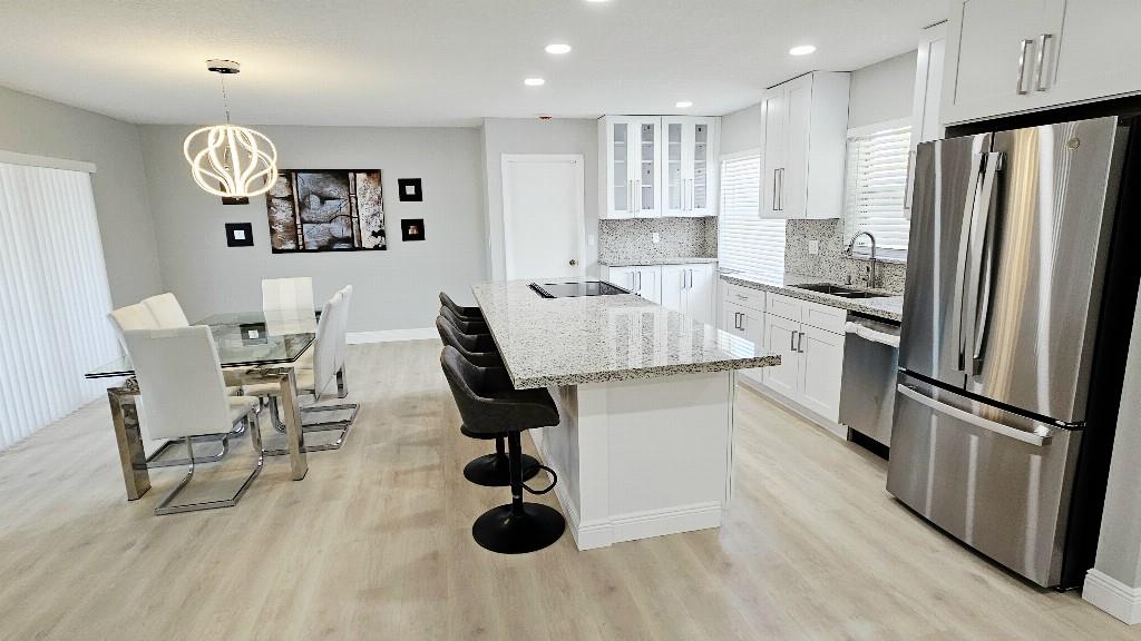 Welcome to your totally renovated, completely open floor plan, move in ready, 2-bedroom 2-bathroom private home in the desirable 55+ Single Family Home section of the Lucerne Lakes Community. The 2025 home renovation includes a brand-new roof, new central air conditioner, new breaker panel, new custom kitchen cabinets, new granite counters, new bathrooms, new hurricane rated garage door and opener, new patio rescreening, new luxury vinyl floors, new textured ceilings, new baseboard, new recessed lighting, and new interior and exterior paint. The dream kitchen includes a brand-new GE stainless steel appliance package. The new modern custom kitchen includes all wood shaker cabinets with soft close doors and drawers. The oversized island includes a slide in stove and built-in microwave.