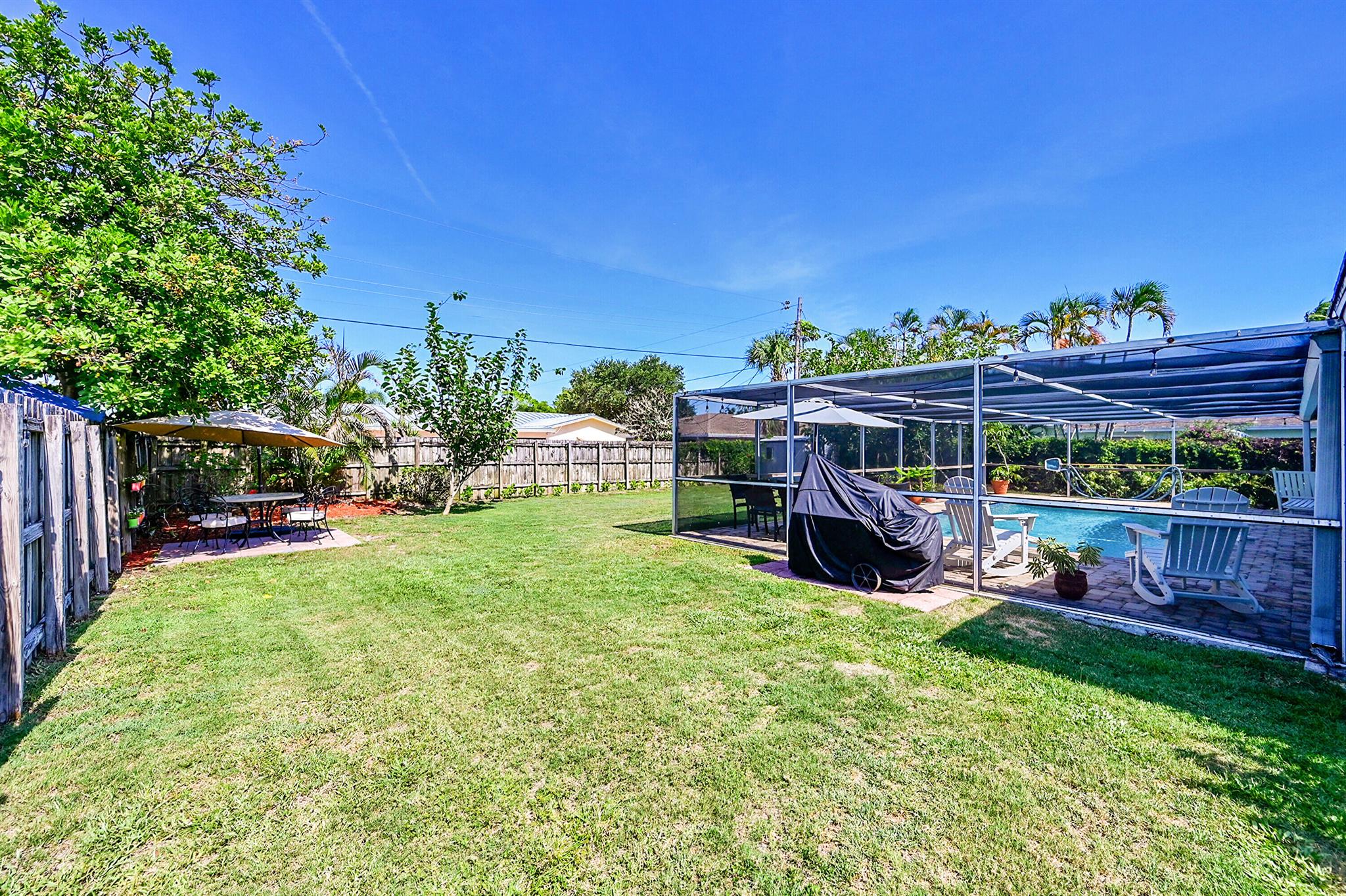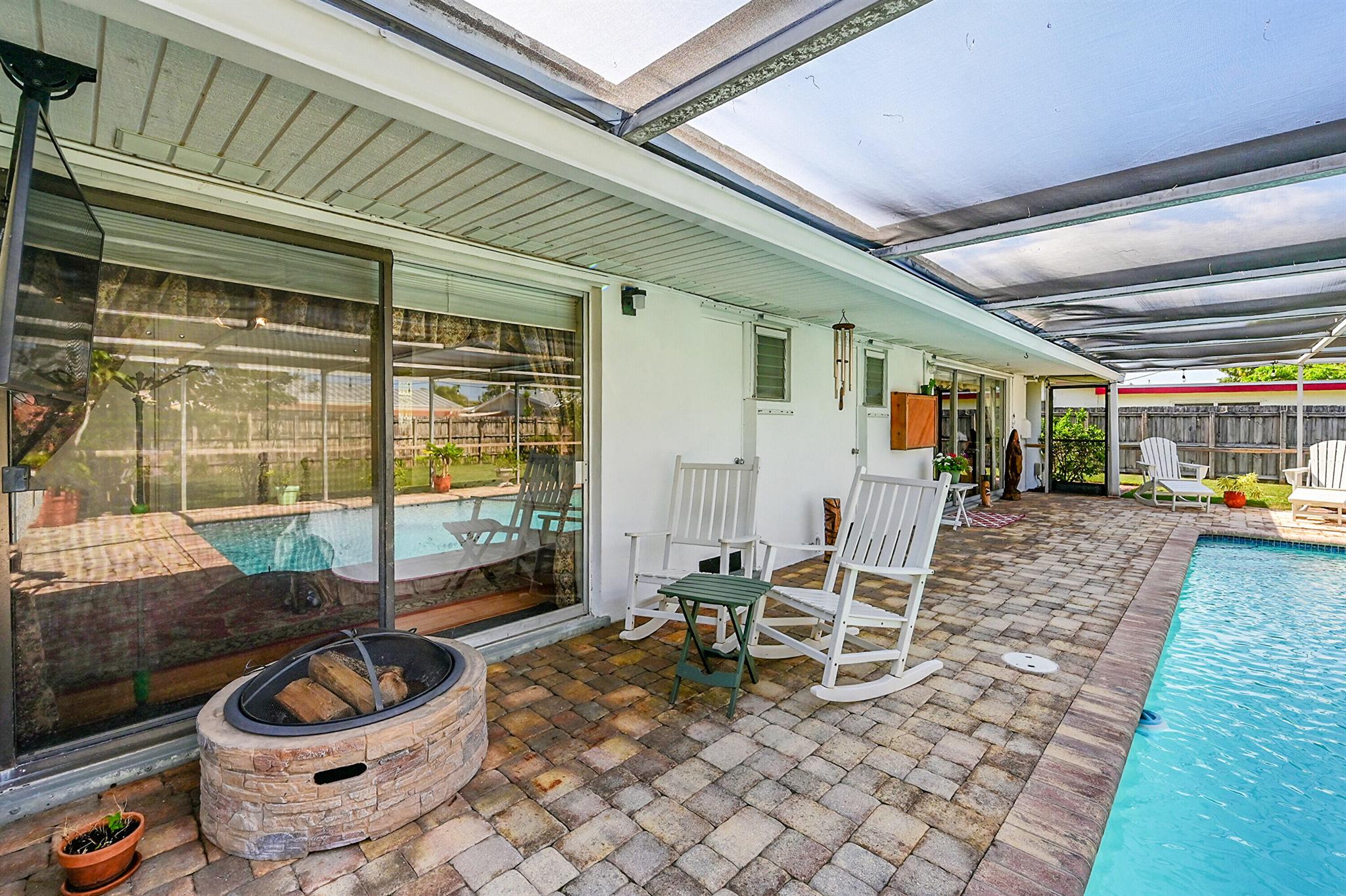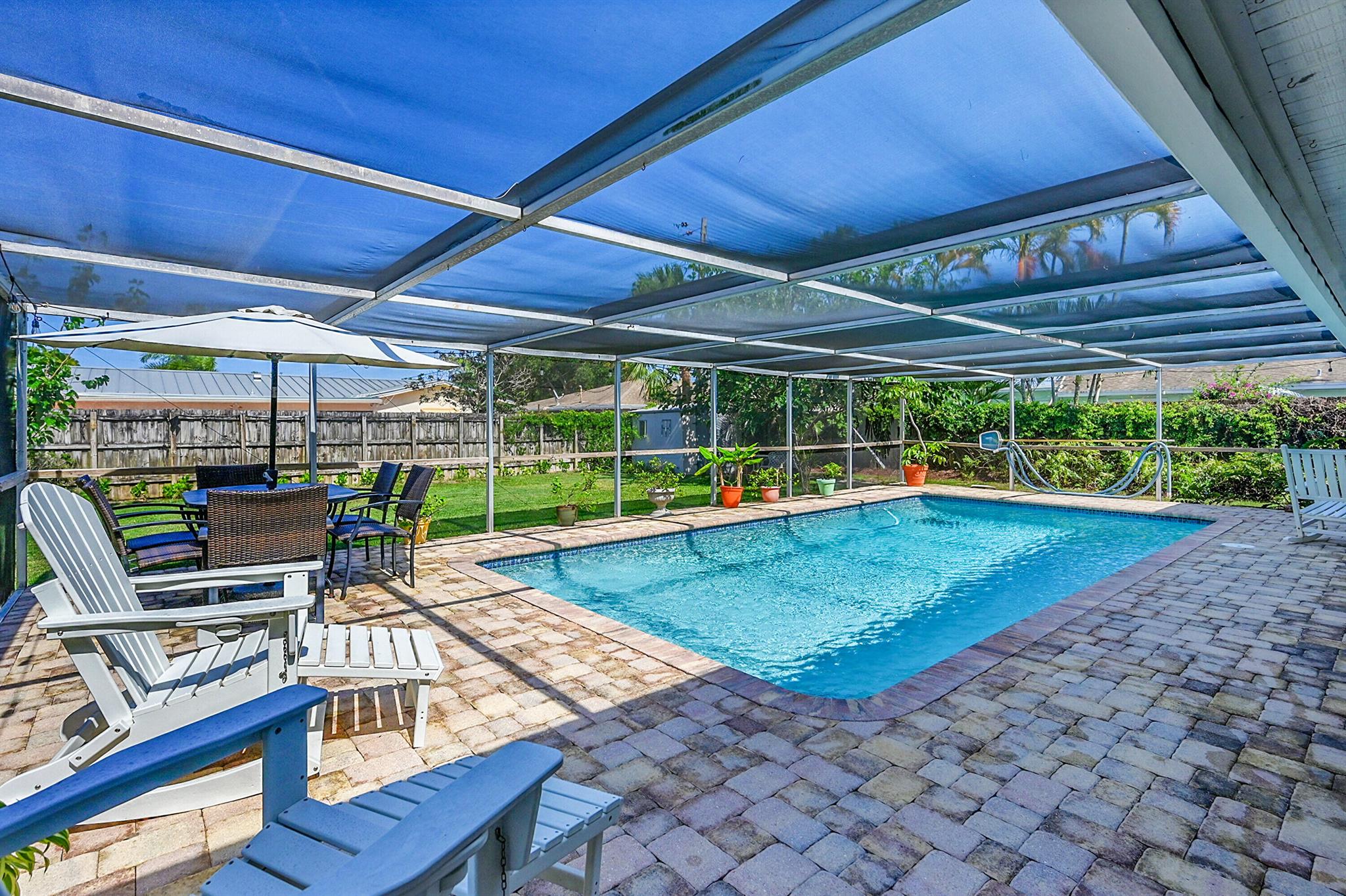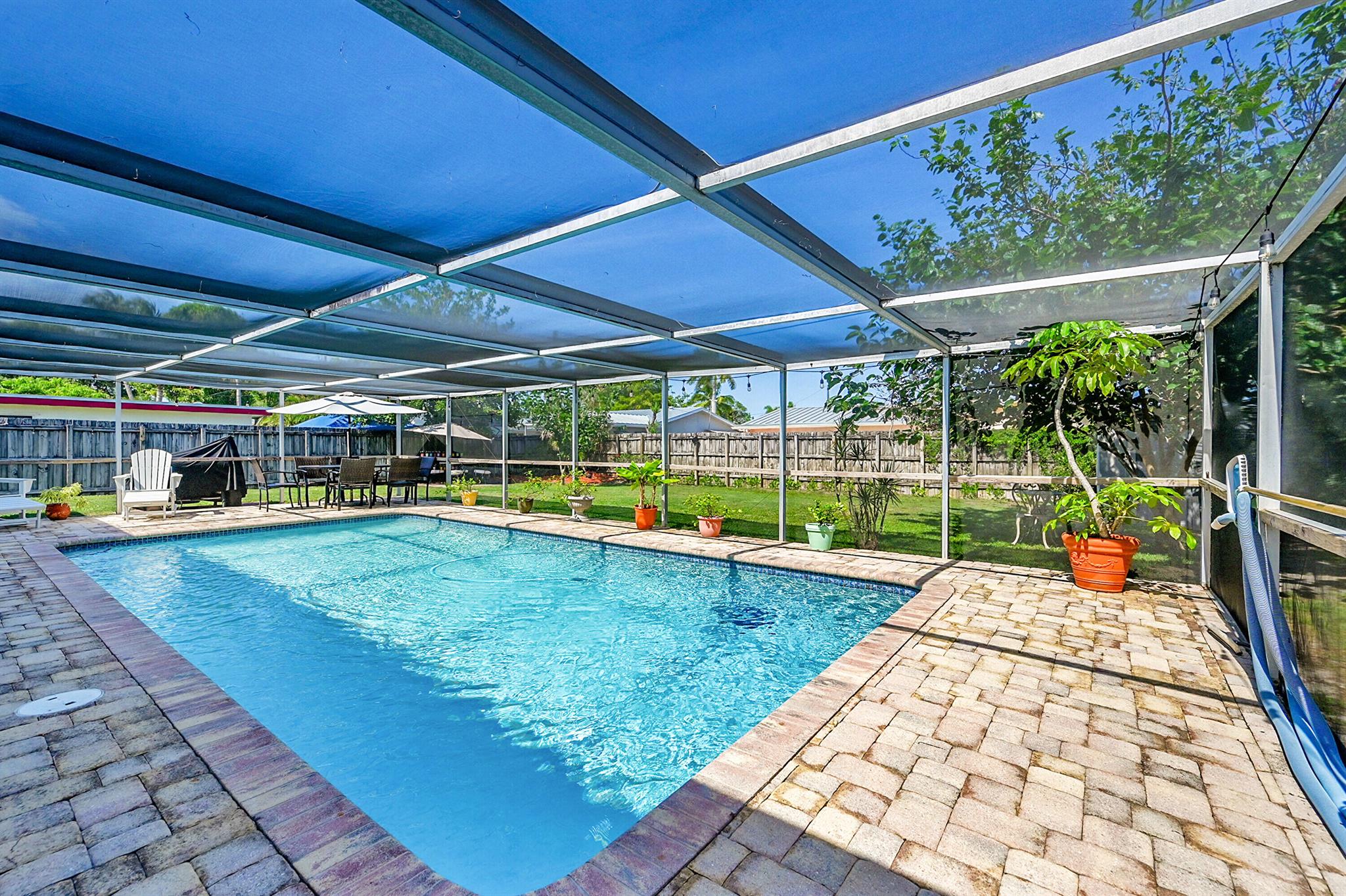 Discover this charming 3 bedroom 2 bathroom home in the sought-after East Deerfield neighborhood. Also, an additional music room which can be used as an office or additional sleeping quarters. This move-in-ready well maintained residence showcases numerous upgrades, including hard surface flooring throughout, kitchen w/gas cooking, updated bathrooms with steam shower and footed tub. Enjoy your morning coffee on the white picket fenced front porch that will also welcome your friends and family to your home. Enjoy peace of mind with full hurricane shutter protection, concrete roof and Plaster walls. The home features a heated screened pool with paver patio and an over-sized backyard. Conveniently located just minutes to the beach, restaurants & shopping. No HOA or Rental Restrictions