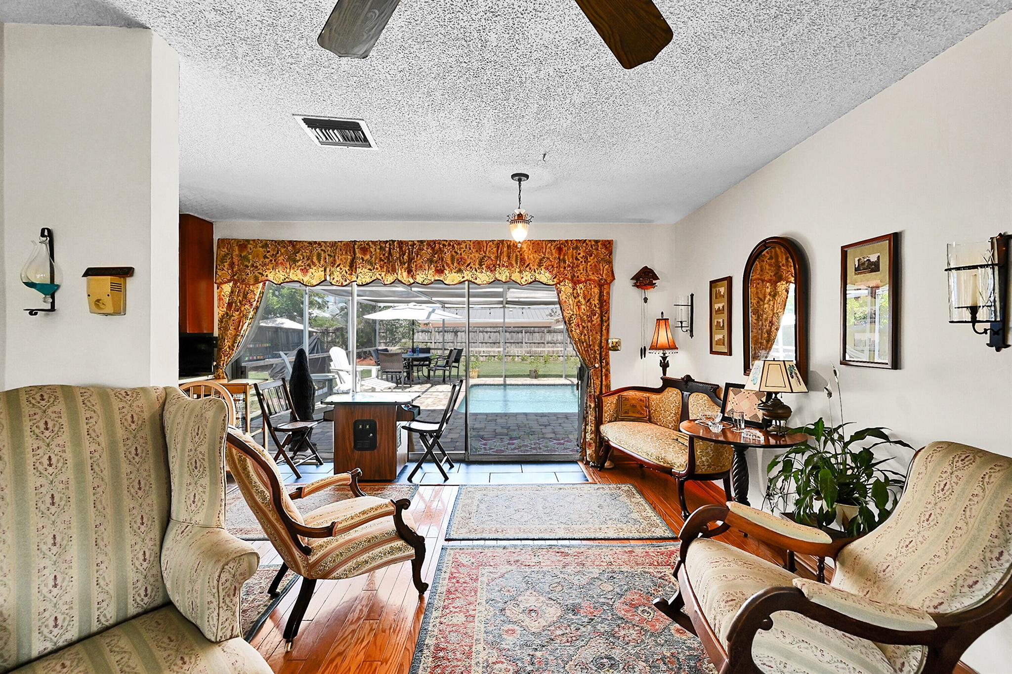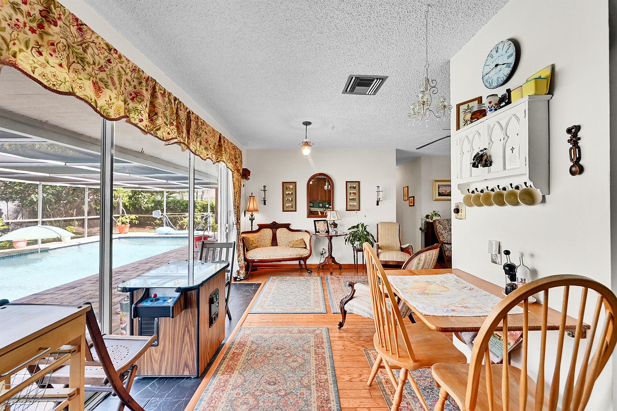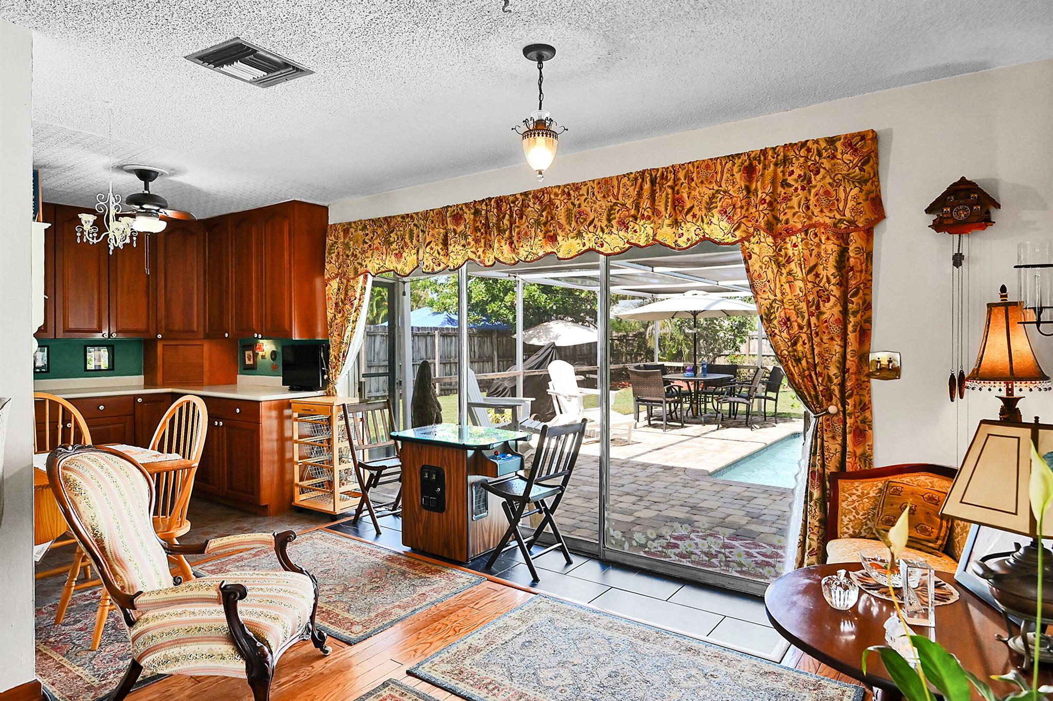 Discover this charming 3 bedroom 2 bathroom home in the sought-after East Deerfield neighborhood. Also, an additional music room which can be used as an office or additional sleeping quarters. This move-in-ready well maintained residence showcases numerous upgrades, including hard surface flooring throughout, kitchen w/gas cooking, updated bathrooms with steam shower and footed tub. Enjoy your morning coffee on the white picket fenced front porch that will also welcome your friends and family to your home. Enjoy peace of mind with full hurricane shutter protection, concrete roof and Plaster walls. The home features a heated screened pool with paver patio and an over-sized backyard. Conveniently located just minutes to the beach, restaurants & shopping. No HOA or Rental Restrictions