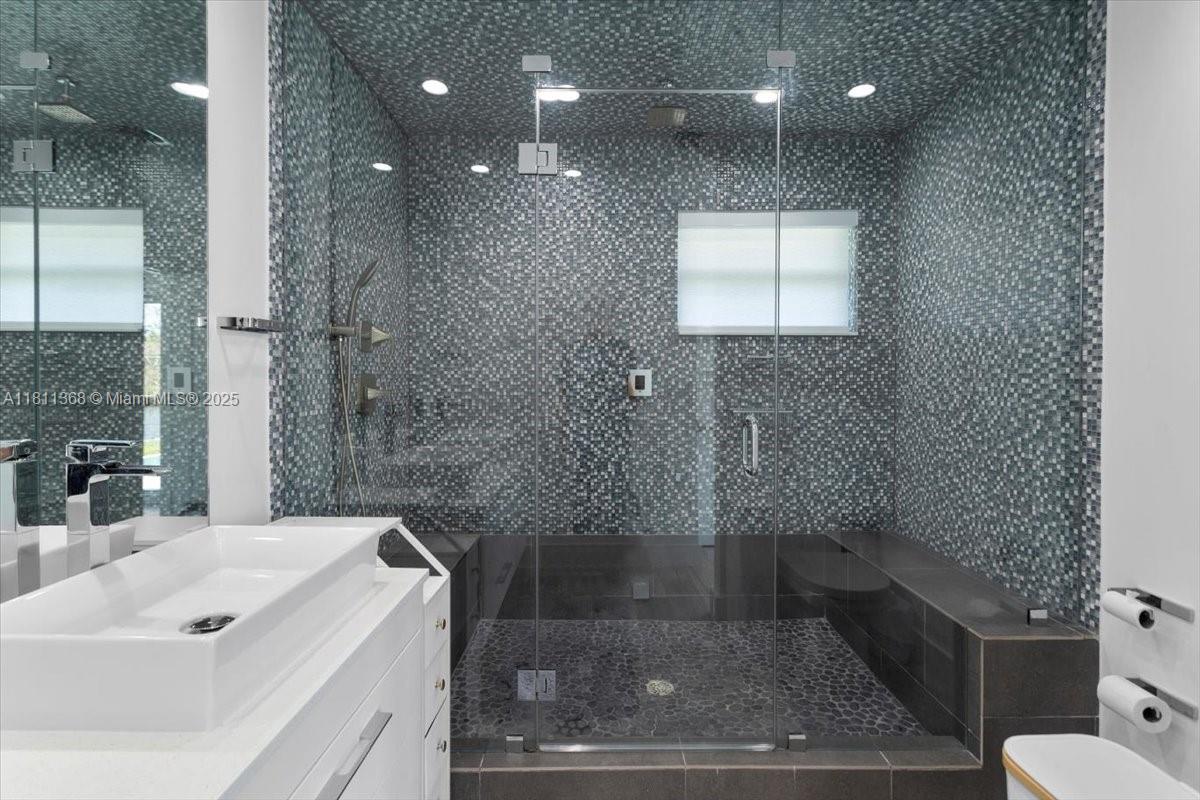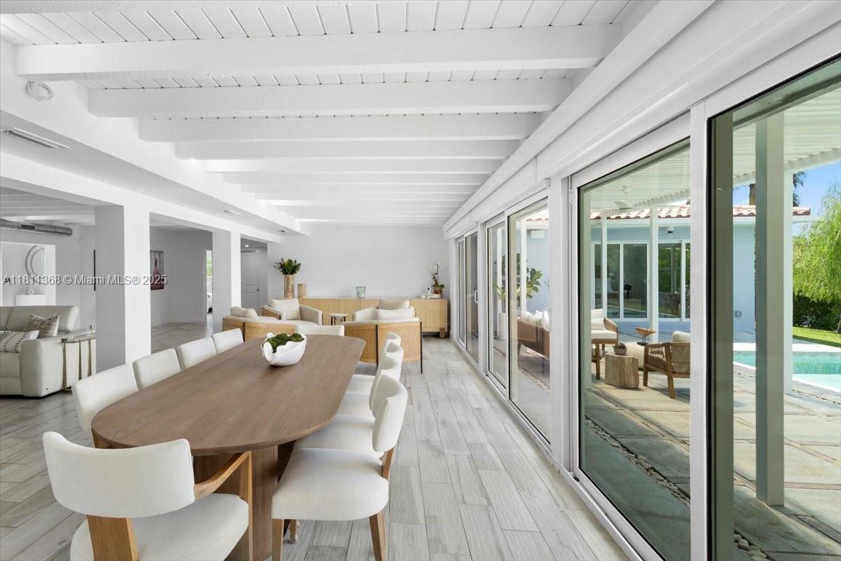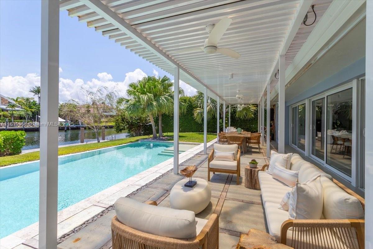 Dream waterfront home in Gables by the Sea, nestled within a secure, guard-gated community. This prime lot is perfectly situated on a wide T-style section of the waterway, offering direct ocean access with no bridges to the bay. With an impressive 100 feet of water frontage this home is perfect for outdoor living. Open floor plan is designed for entertaining and family gatherings, featuring high, open beam ceilings that frame breathtaking views from the kitchen, living room, dining area, family room, and master suite. The spacious master suite boasts a beautifully remodeled bathroom and stunning views of the pool. This home includes three bedrooms with four full bathrooms and a den/office, providing plenty of space for work and relaxation.