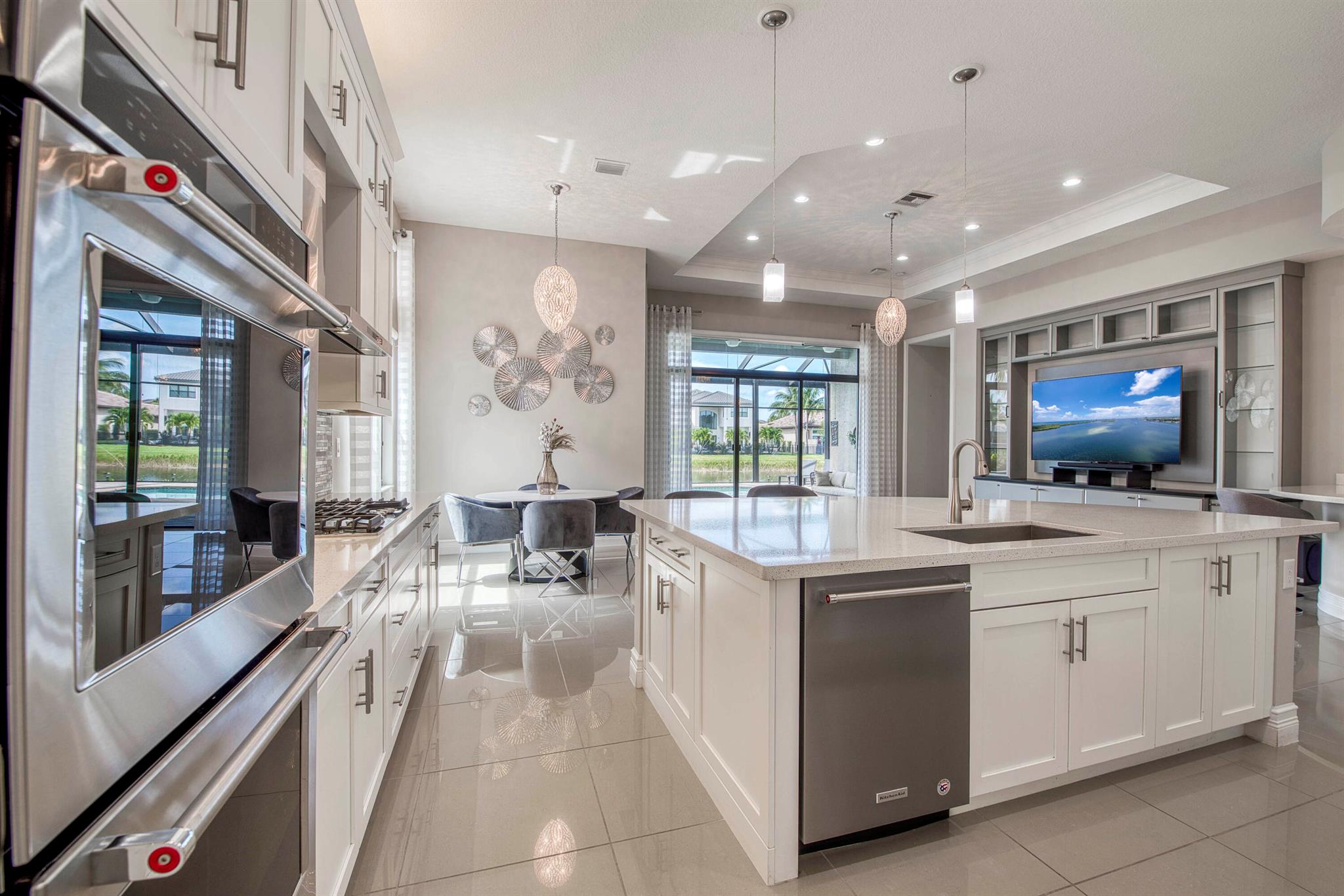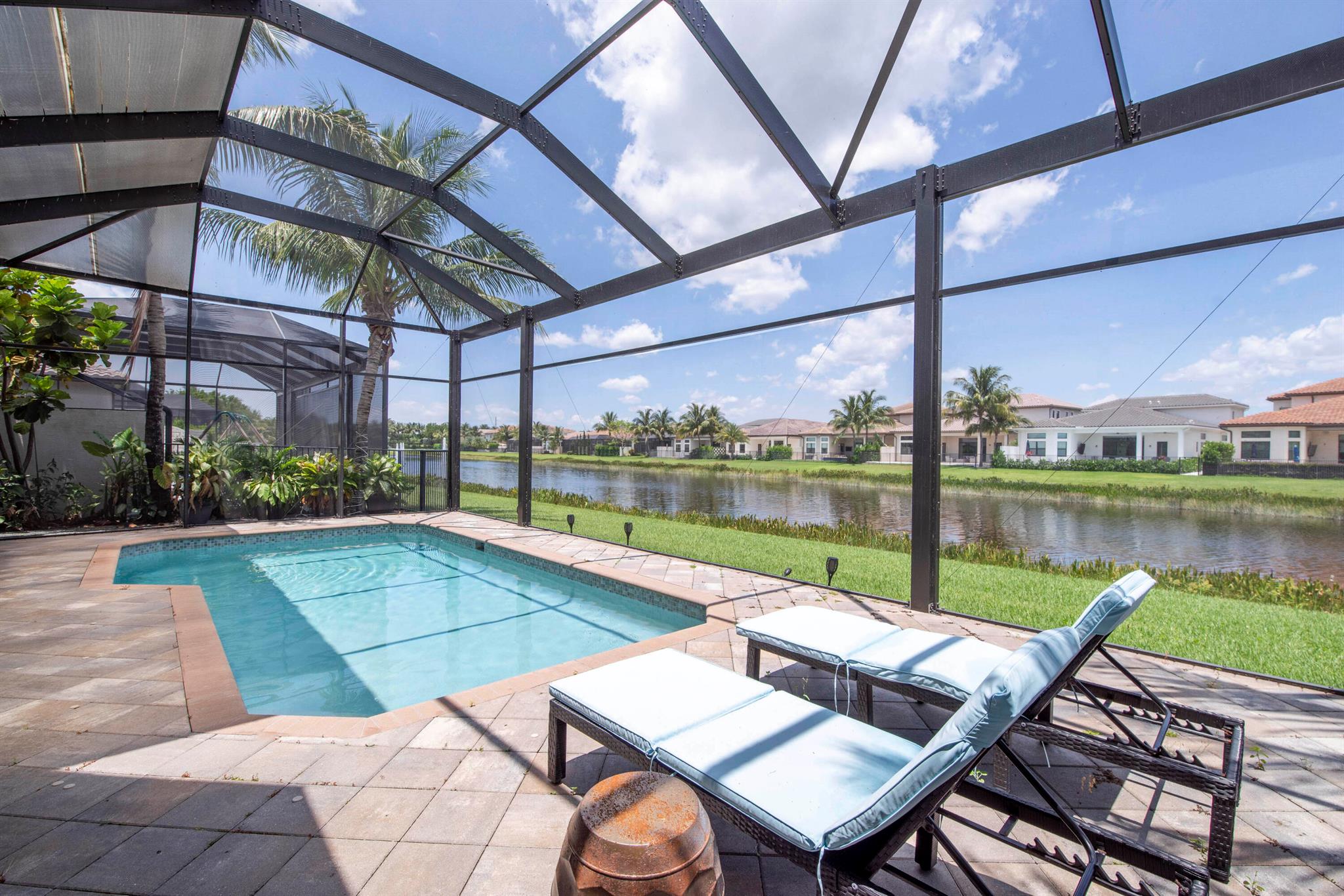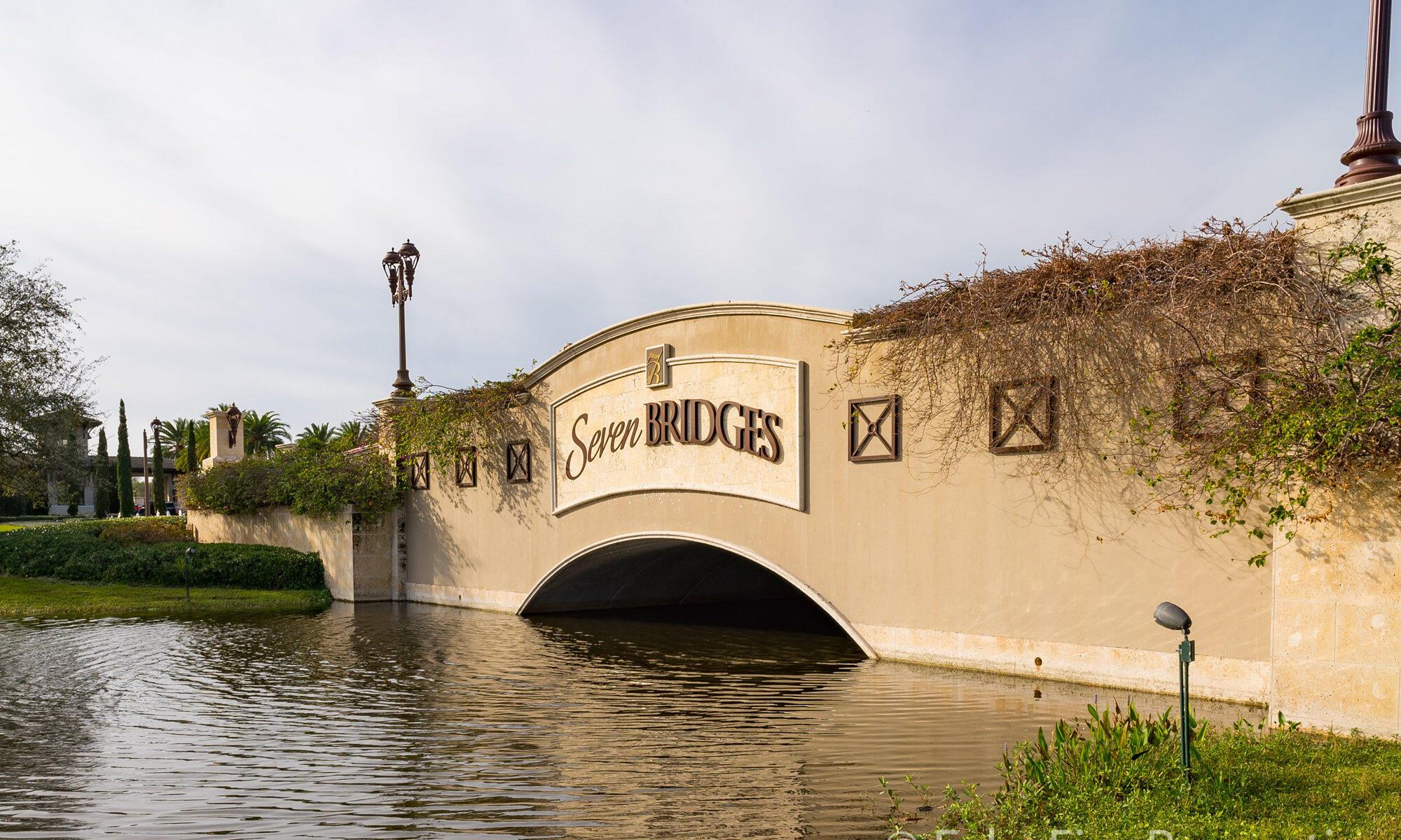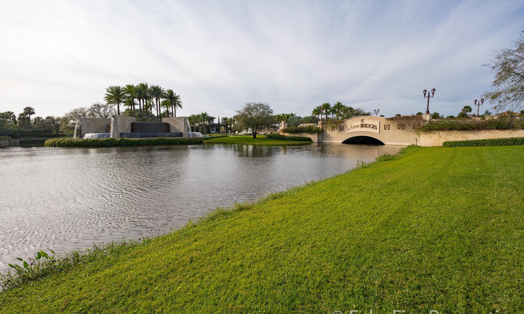 Beautiful and alluring lake views from this upgraded single-story home featuring 4 bedrooms and 3.5 bathrooms, with impact glass throughout. Highlights include coffered ceilings, crown moldings, a custom media center, built-in closets, a full home generator, and whole-house water filtration and purification. The chef's kitchen boasts quartz countertops, a gas range, and premium appliances. The primary suite has custom closets, European-style drapes, and a spa-like bathroom with dual vanities, a large shower, and a bidet. Relax by the heated pool or enjoy the summer kitchen and upgraded picture window screen enclosure. Marble-look tile, an EV car wall charger, and a 3-car garage complete the property. Seven Bridges offers an unparalleled lifestyle with its 30,000 sq ft clubhouse, modern