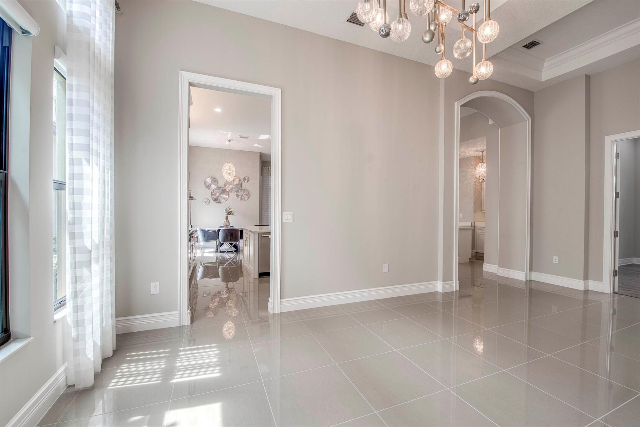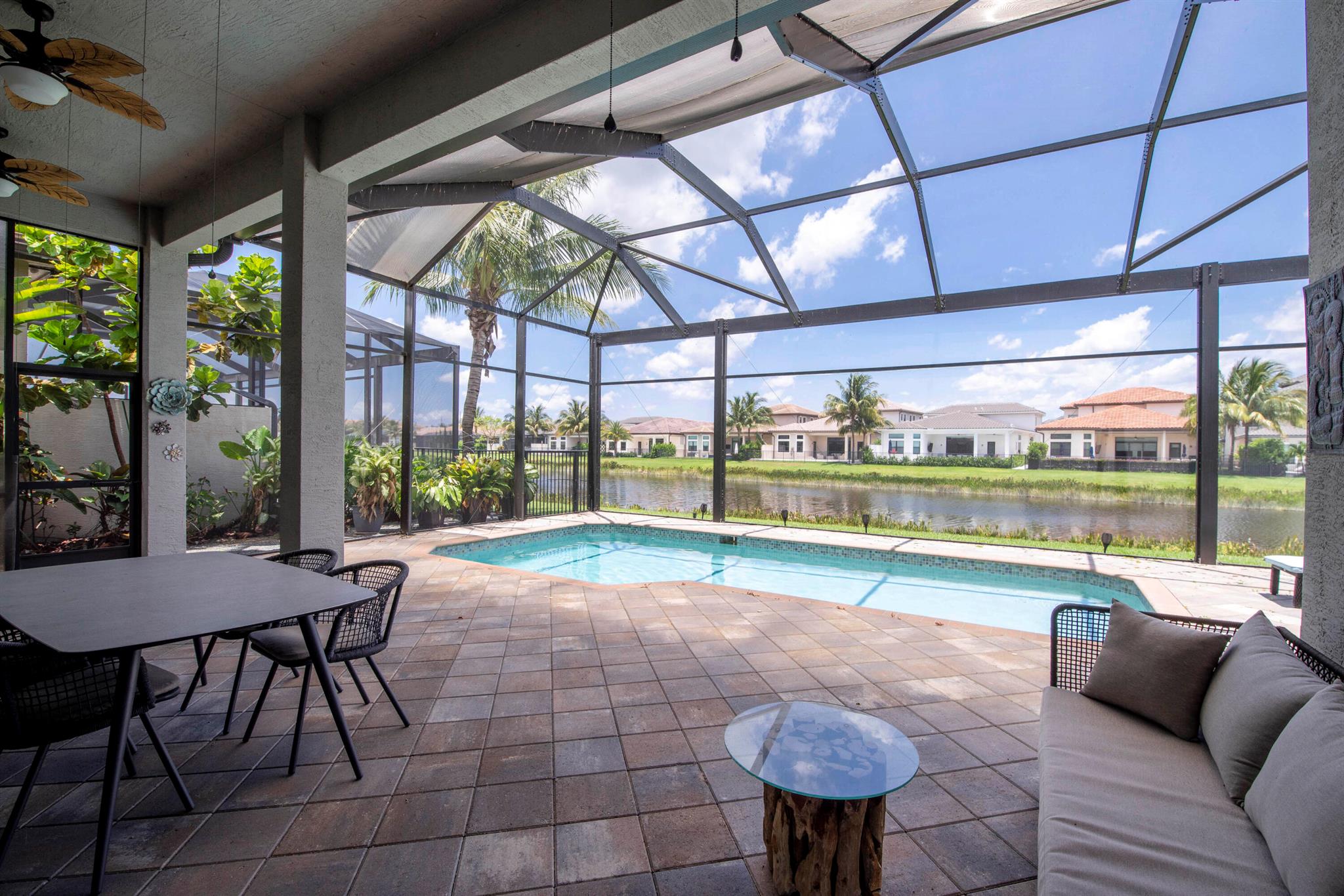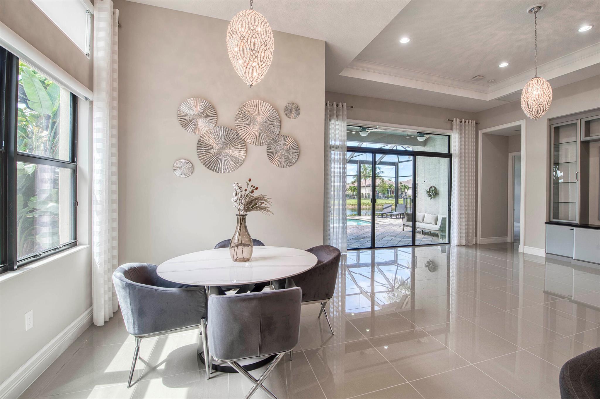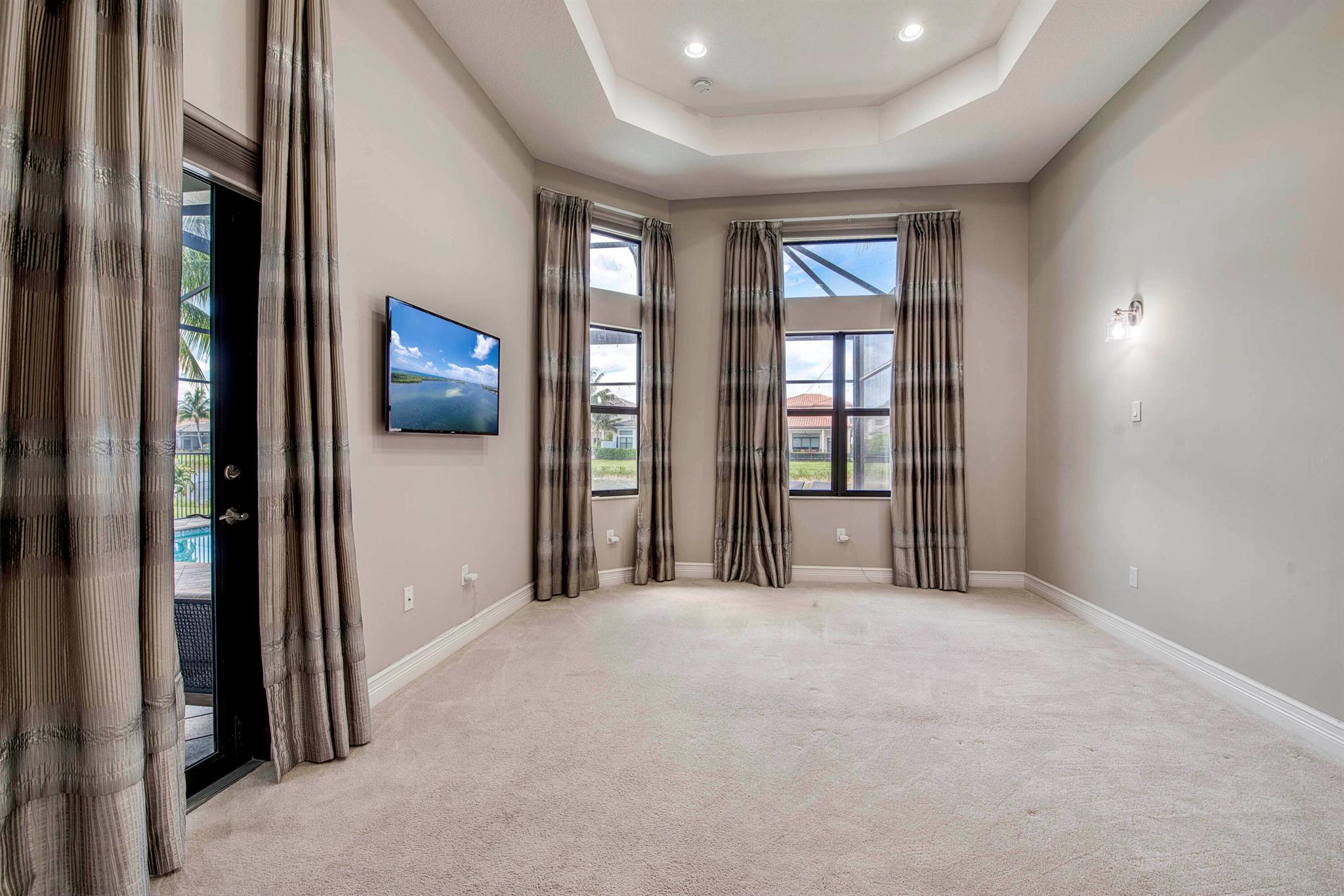 Beautiful and alluring lake views from this upgraded single-story home featuring 4 bedrooms and 3.5 bathrooms, with impact glass throughout. Highlights include coffered ceilings, crown moldings, a custom media center, built-in closets, a full home generator, and whole-house water filtration and purification. The chef's kitchen boasts quartz countertops, a gas range, and premium appliances. The primary suite has custom closets, European-style drapes, and a spa-like bathroom with dual vanities, a large shower, and a bidet. Relax by the heated pool or enjoy the summer kitchen and upgraded picture window screen enclosure. Marble-look tile, an EV car wall charger, and a 3-car garage complete the property. Seven Bridges offers an unparalleled lifestyle with its 30,000 sq ft clubhouse, modern