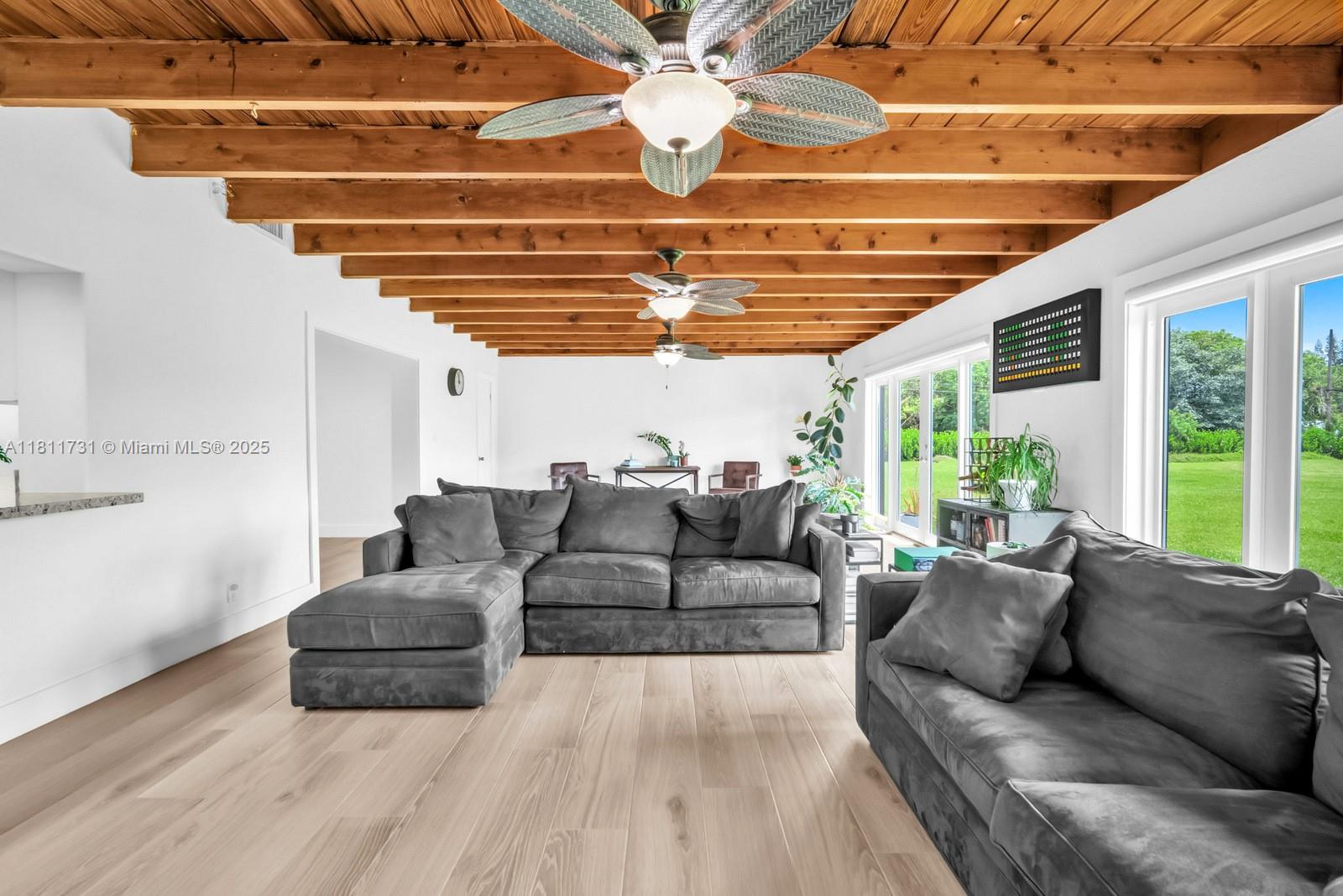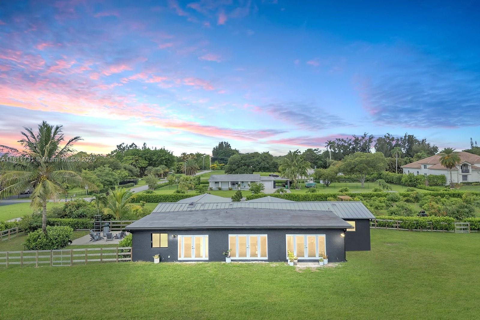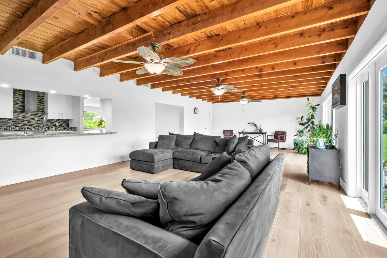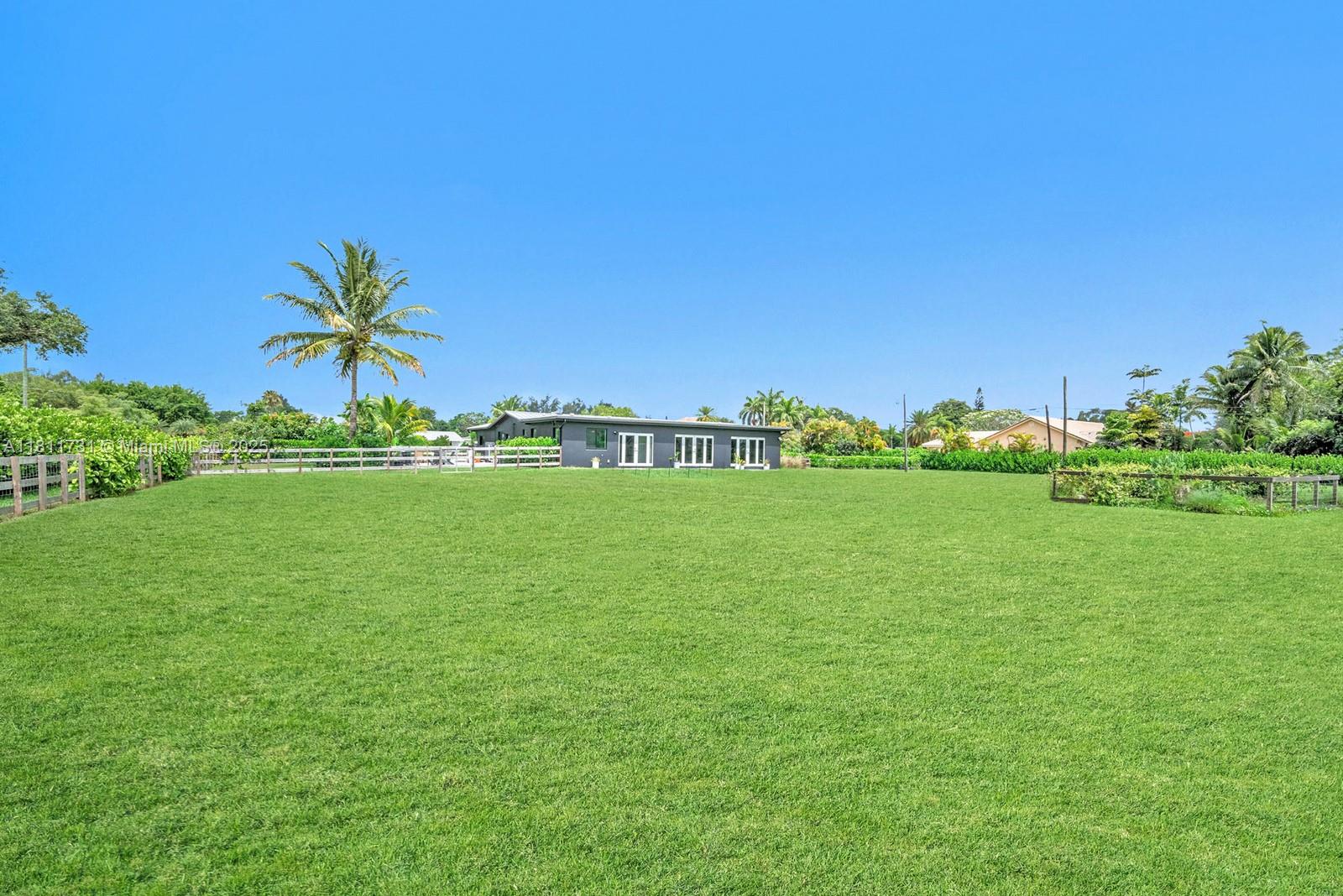 Gorgeous 4 bed 2.5 bath one-of-a-kind home nestled on spectacular 2 acre premium lot on charming street in the heart of equestrian friendly city of Davie. Tastefully updated home features new floors throughout. Kitchen has sleek cabinets w glass accent doors, stainless appliances & range hood. Spacious living room and family room that showcases a wood beam ceiling w 2 sets of french doors to an expansive fully fenced backyard. Triple split floor plan is desirable & versatile. Large primary bedroom w en-suite & view of the grounds. Freshly painted inside & stylish paint outside. Welcoming curb appeal, landscaping is so pretty, including private grove w a variety of fruit trees. Additional highlights: large laundry room, impact doors & windows, metal roof, new ac and water heater.