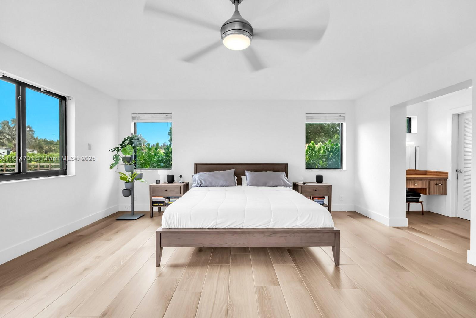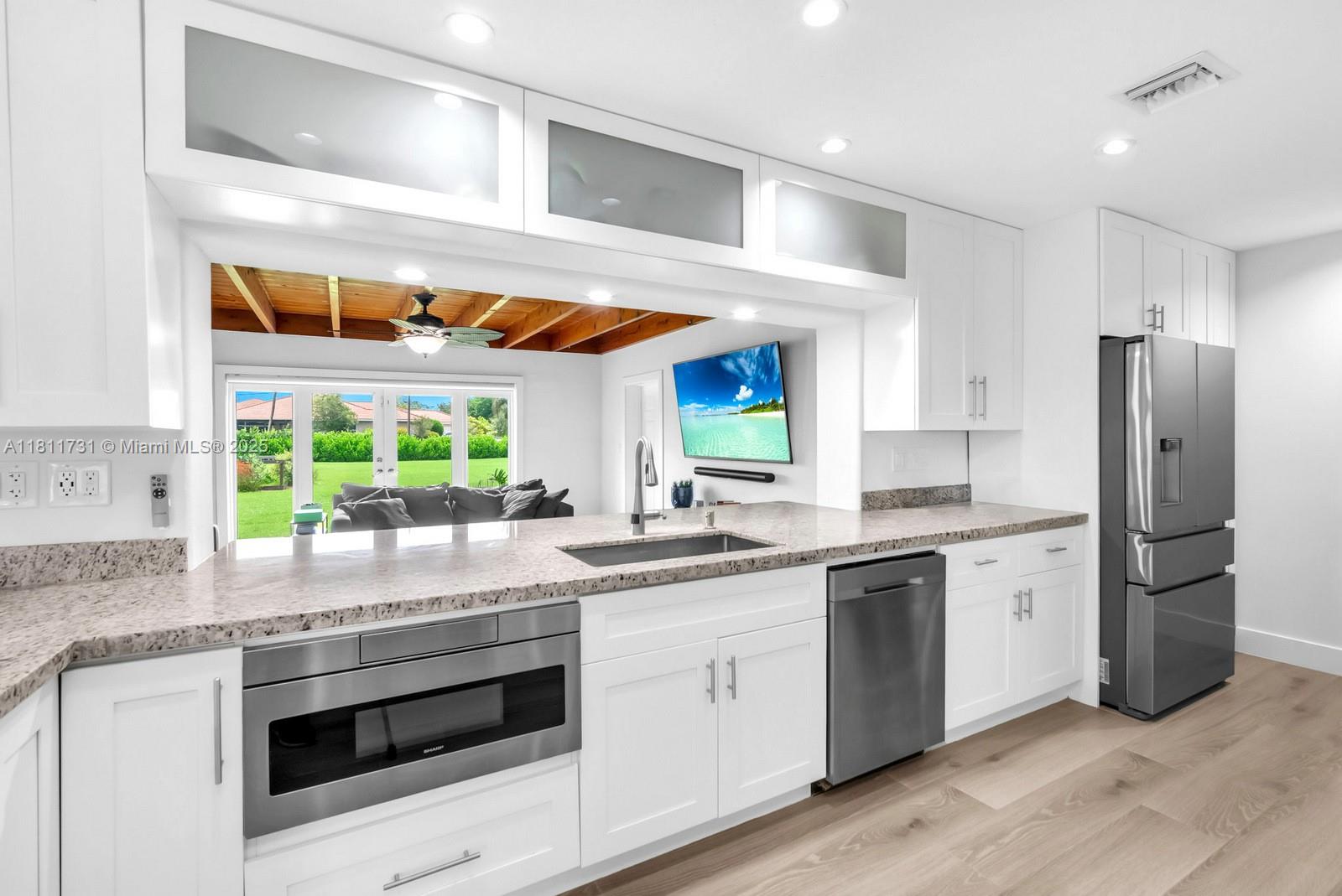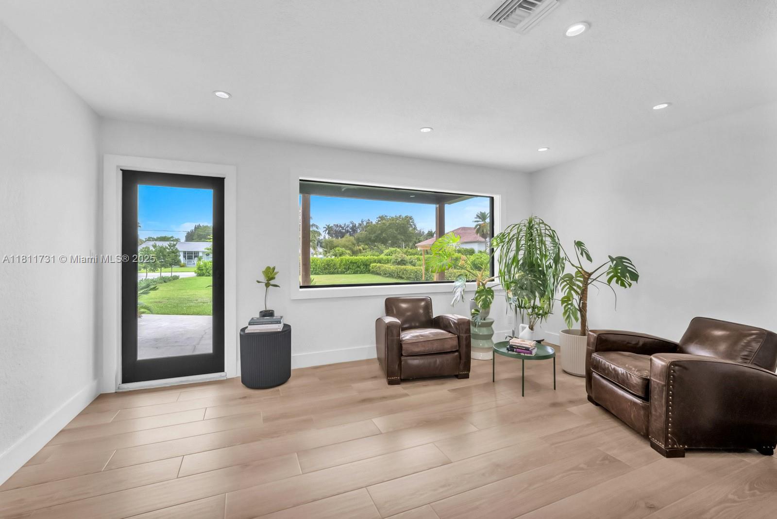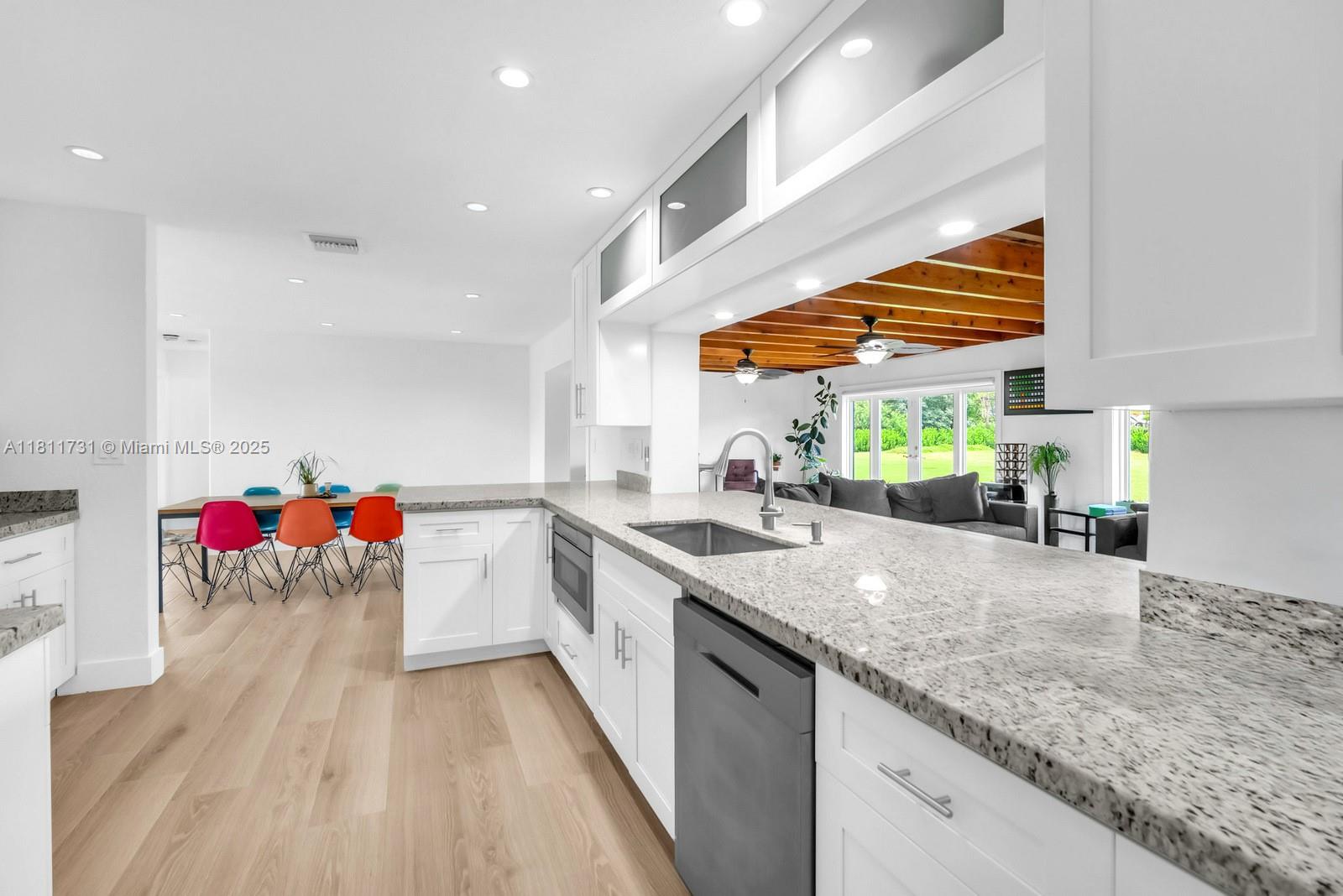 Gorgeous 4 bed 2.5 bath one-of-a-kind home nestled on spectacular 2 acre premium lot on charming street in the heart of equestrian friendly city of Davie. Tastefully updated home features new floors throughout. Kitchen has sleek cabinets w glass accent doors, stainless appliances & range hood. Spacious living room and family room that showcases a wood beam ceiling w 2 sets of french doors to an expansive fully fenced backyard. Triple split floor plan is desirable & versatile. Large primary bedroom w en-suite & view of the grounds. Freshly painted inside & stylish paint outside. Welcoming curb appeal, landscaping is so pretty, including private grove w a variety of fruit trees. Additional highlights: large laundry room, impact doors & windows, metal roof, new ac and water heater.