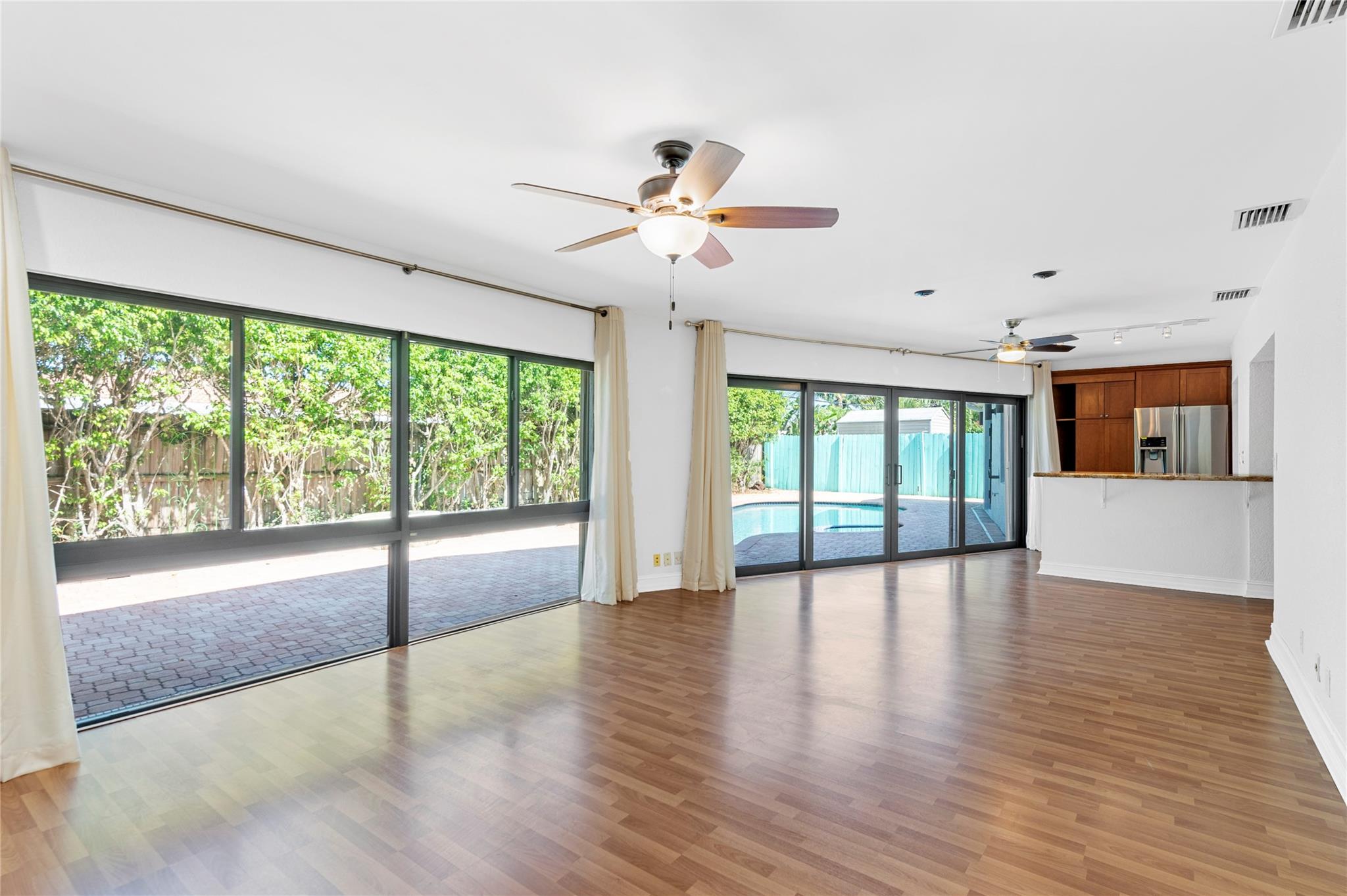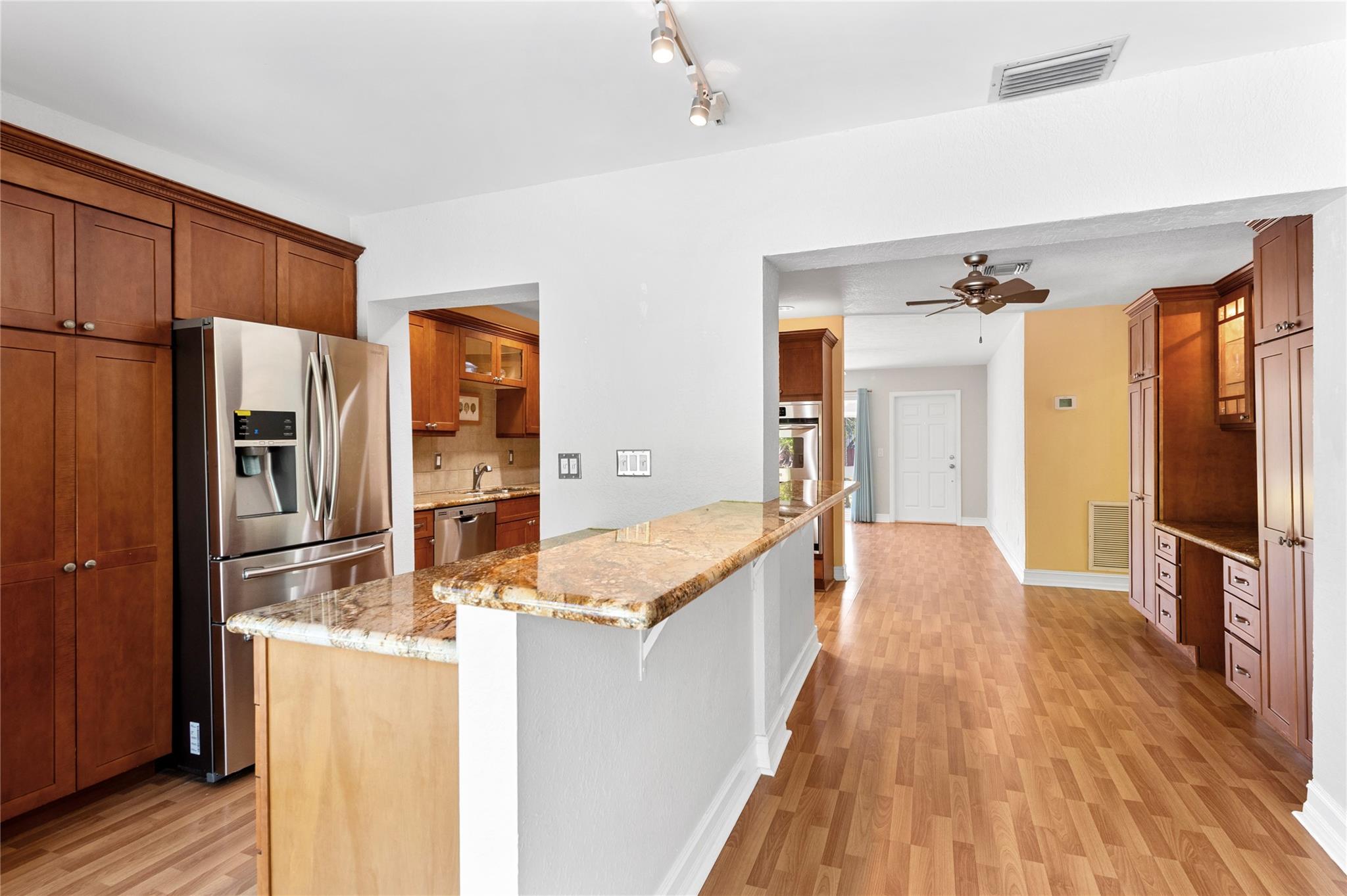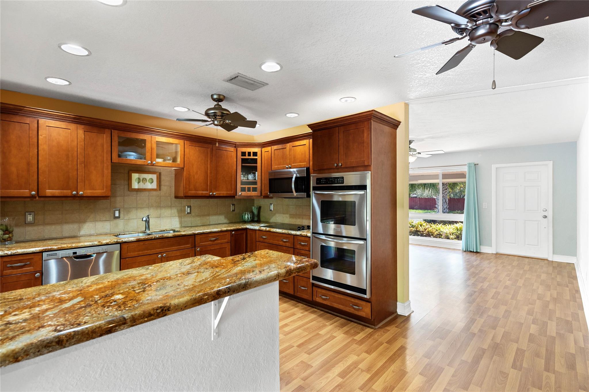 3 /2 home w/over 1900 sqft w/ a small garage, pool and oversized corner lot. Updated kitchen, all new stainless steel appliances, Samsung refrigerator, GE dishwasher & Frigidaire Double oven with wood cabinets, granite counter tops, large pantry. Large family room w/ a real fireplace, Floor to ceiling impact windows w/ pool access. Home has a fully fenced backyard to allow for animals so they cant get out. Kidney shaped Pool with firepit complete w/ stone pavers. Roof is in excellent shape with concrete barrel tiles with, 10 years of life left. A very spacious laundry room. 3rd bedroom can be used as an office or bedroom. Second bedroom in the corner with full bath with tub/shower across the hall, Master bathroom updated with dual sinks, standup shower w/ additional A/C