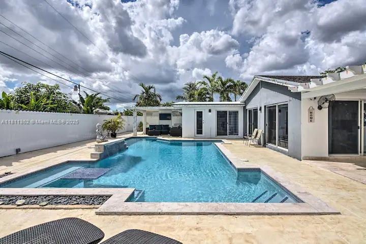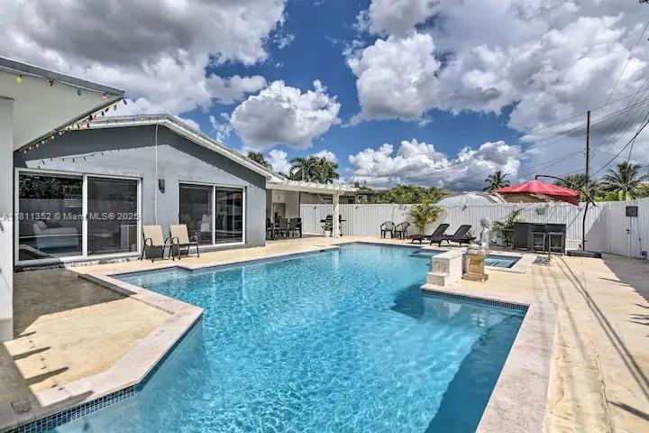 Located in a prime area of Hialeah, this impressive 6-bedroom, 4.5-bath home features a resort-style backyard. Enjoy a modern pool, outdoor summer kitchen, and covered patio-perfect for gatherings. The interior offers ceramic tile floor throughout, a renovated kitchen with stainless steel appliances, and spacious, light-filled living areas. A convenient exterior bathroom by the pool and a fully fenced yard provides plenty of space to relax or entertain. Move-in-ready!