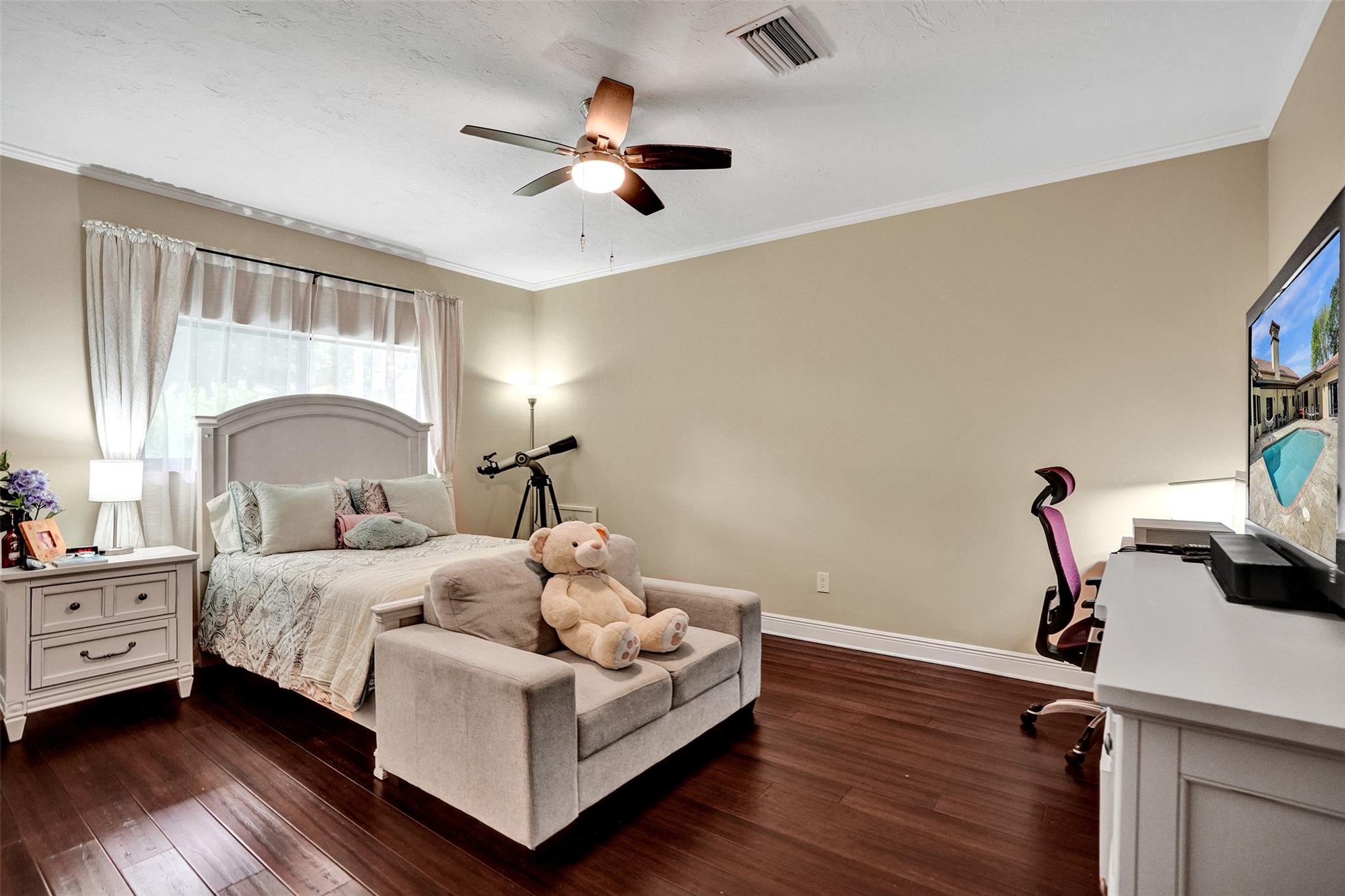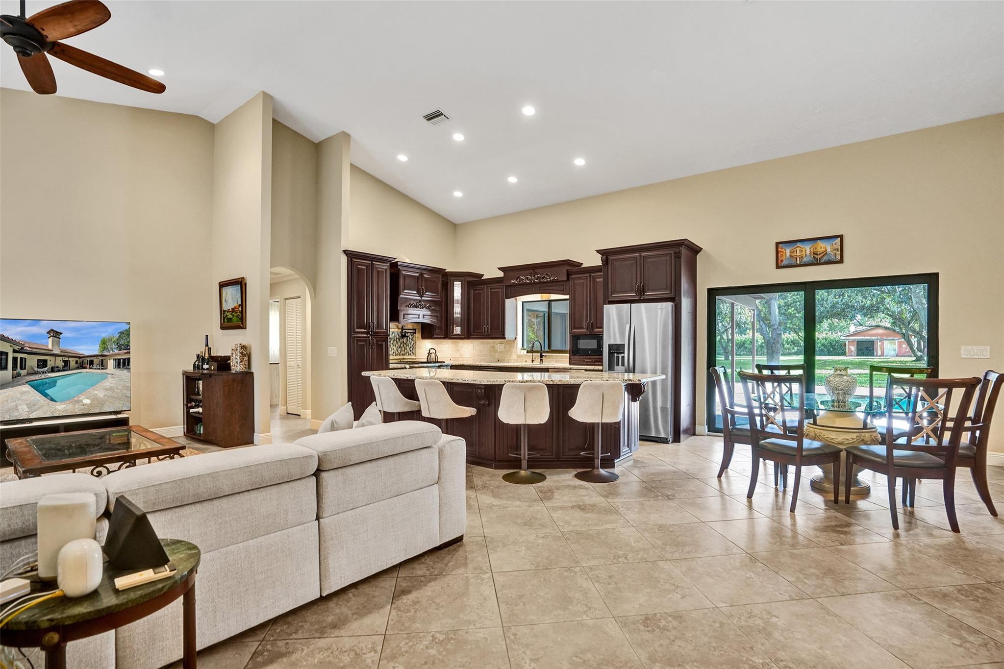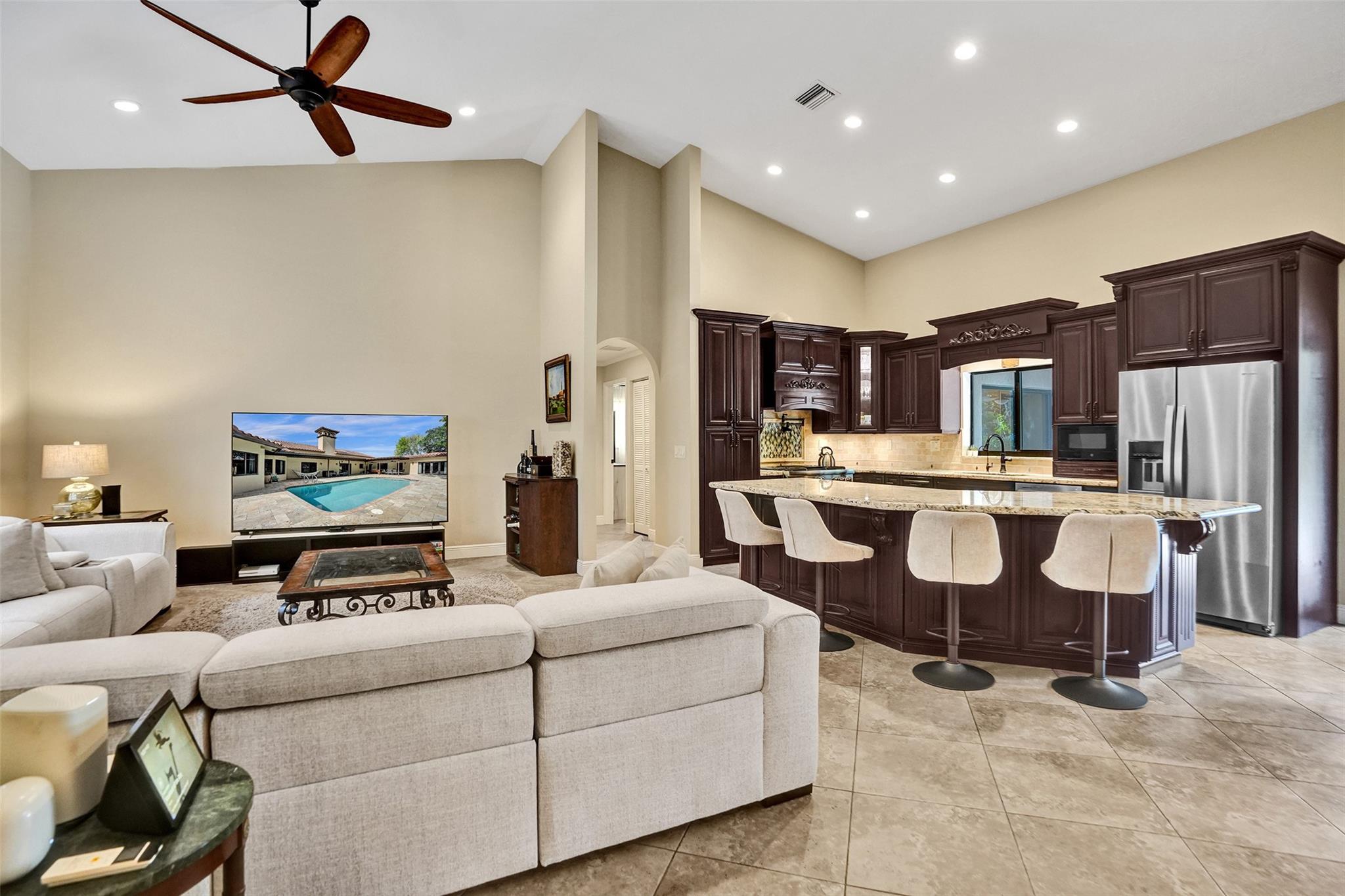 STUNNING CORAL GABLES-STYLE ESTATE ON 1.23 ACRES! This 6 bed/5 bath residence impresses with soaring 12–14 ft ceilings and a dramatic 20-ft tower entryway. Elegant travertine flooring in the front porch and the spacious poolside patio deck—perfect for entertaining. 2 luxurious master suites, one of which can function as a private guest suite with its own entrance. Impact windows and doors throughout offer peace of mind. Enjoy the bounty of nature with a variety of mature fruit trees, including 7 mango, 1 lychee, 1 avocado, and 6 coconut palms—9-zone sprinkler system sourced by a private well. Oversized 2-car garage with impact windows. Expansive paved driveway. 22KW generator. Fully fenced yard and a 10-ft clusia hedge for maximum privacy. NO HOA, in a quiet and desirable neighborhood