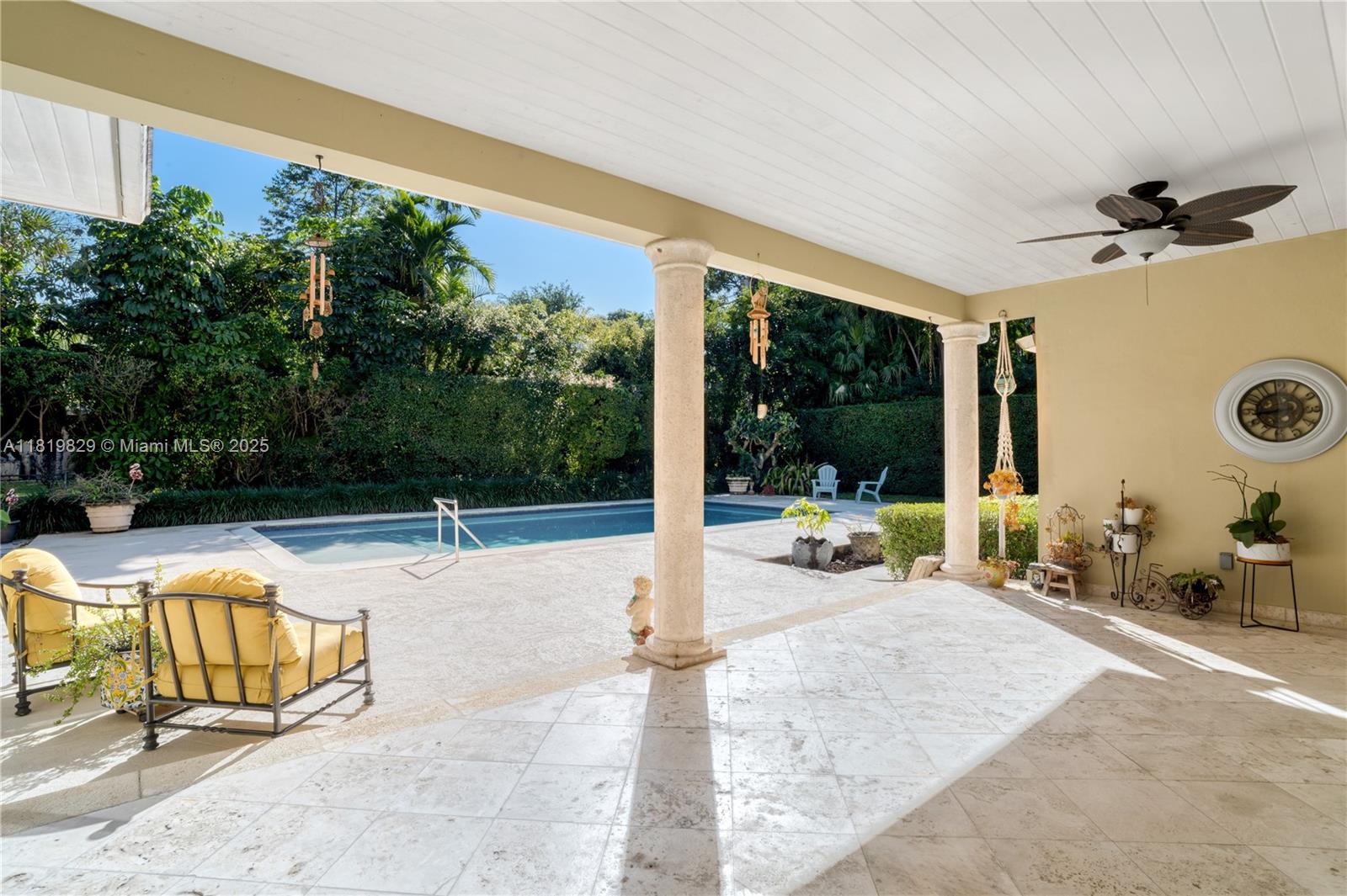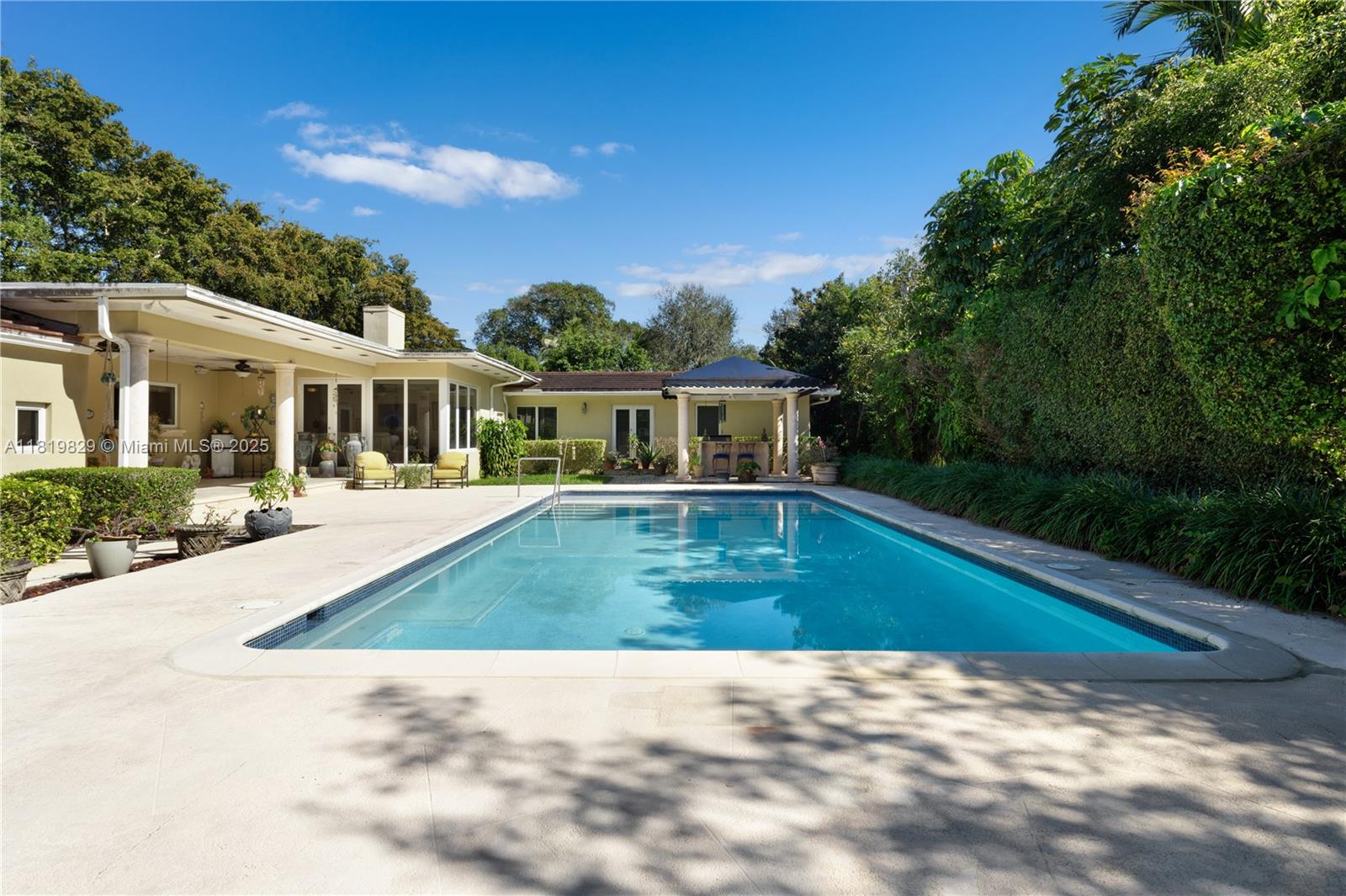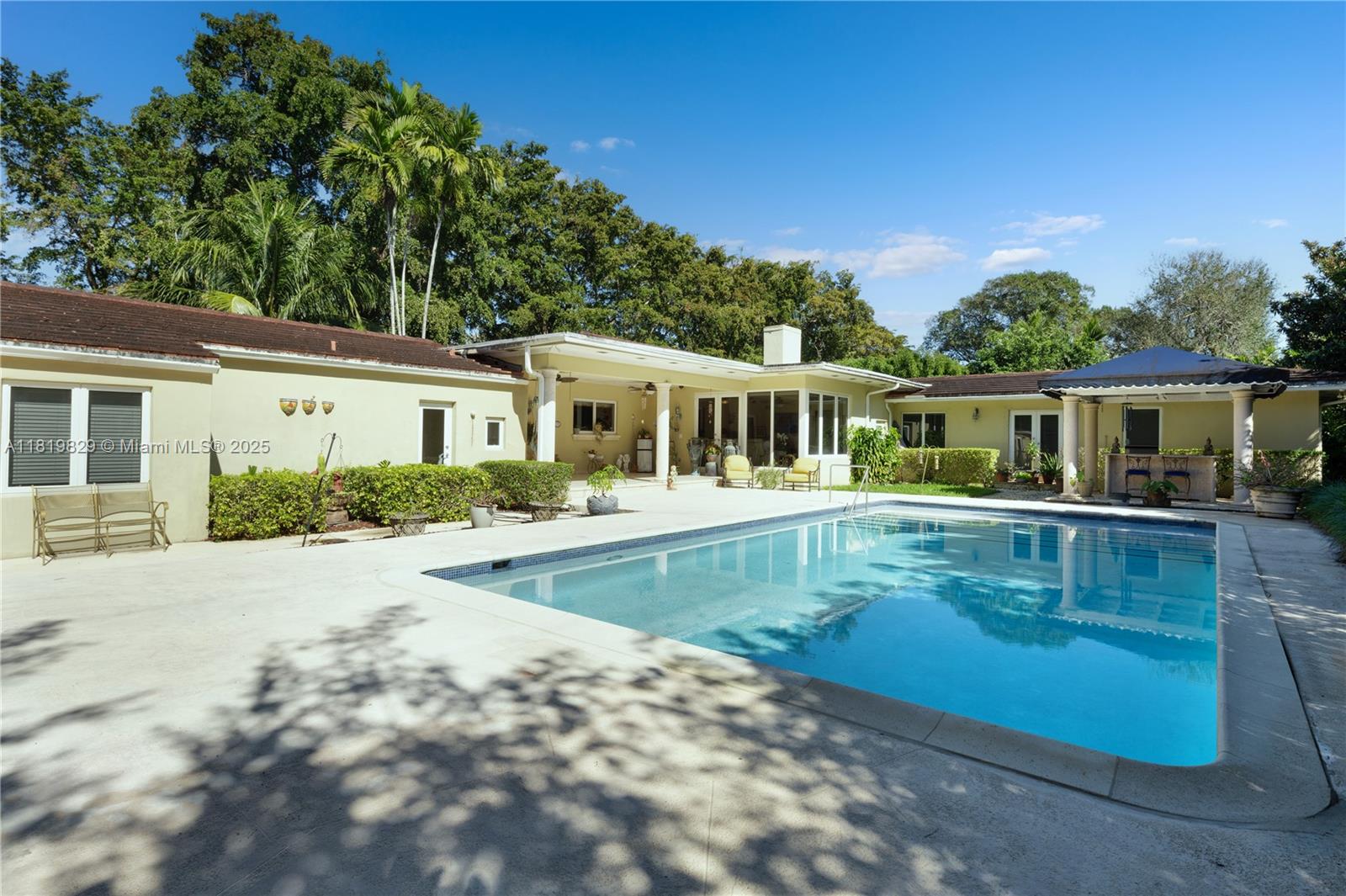 Situated on a double lot (18,000SF) across from the Biltmore Golf Course on Mariola Court, this exceptional home offers a blend of privacy and prime location on a peaceful street. Vaulted ceilings in the living room create an airy, open feel, while the expansive primary suite features a sitting area, two walk-in closets, double sinks, a soaking tub, and a spacious shower. Layout consists of the Primary Suite + 2 bedrooms, then 2 separate live-in quarters on service side of the home. Perfect for outdoor living, a private retreat with sparkling pool, a large covered terrace, and a detached gazebo with outdoor cooking. Impact windows and doors provide protection and efficiency, while a two-car garage adds convenience. A rare opportunity to enjoy Coral Gables living in a sought-after setting.