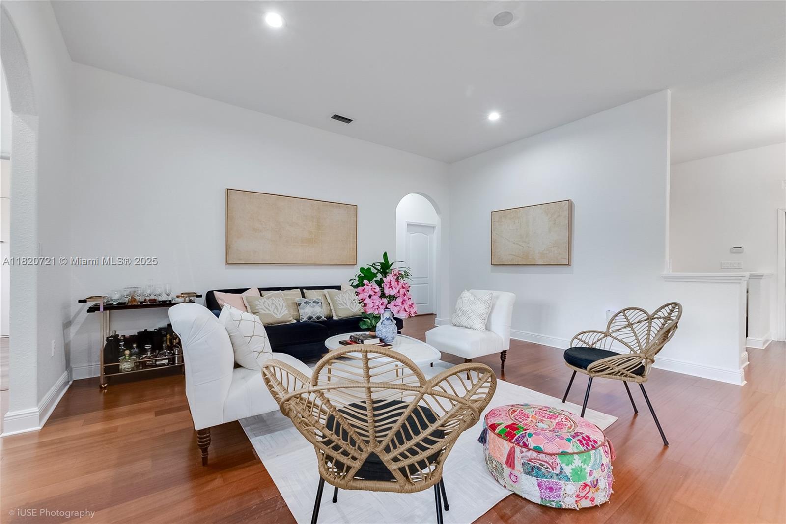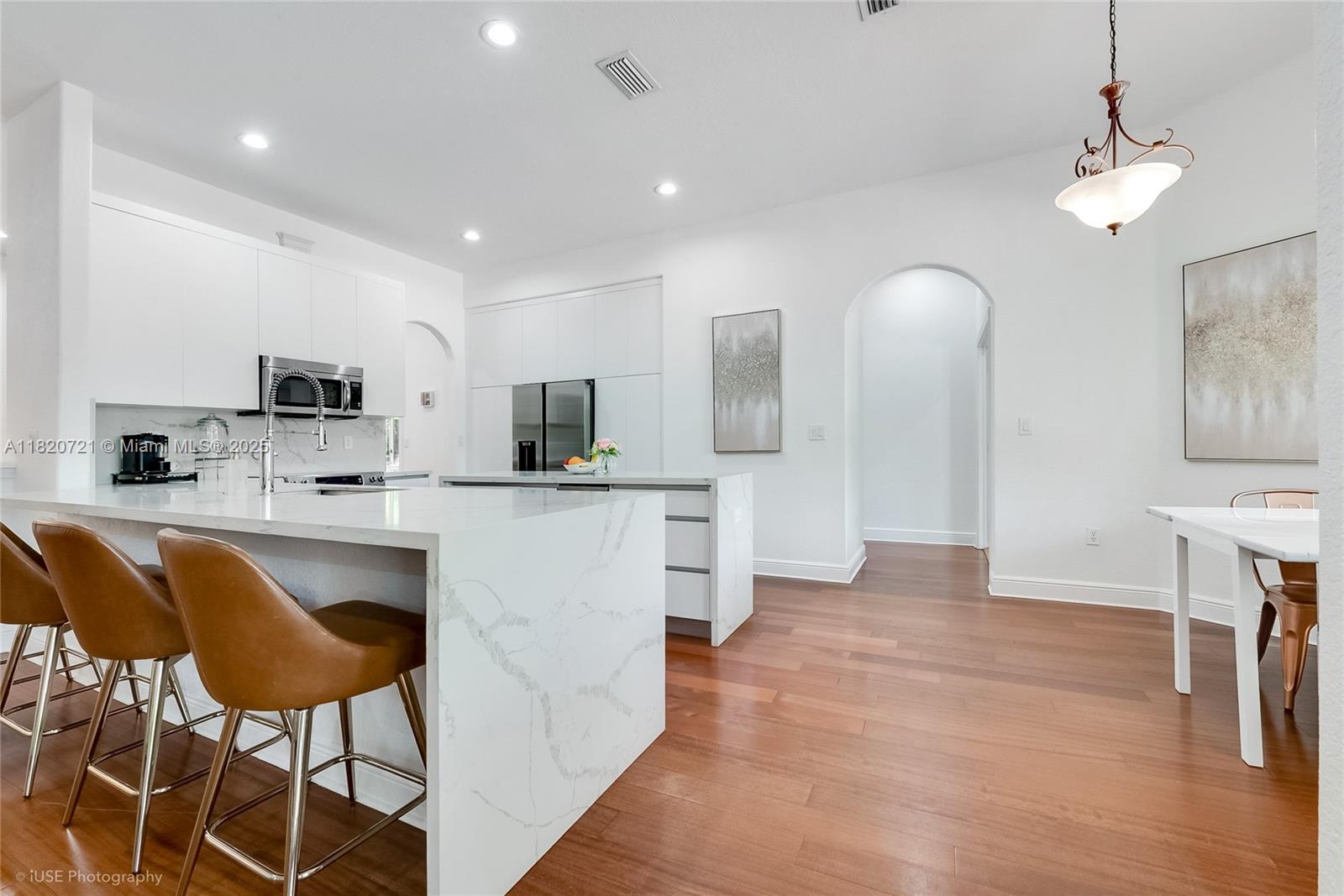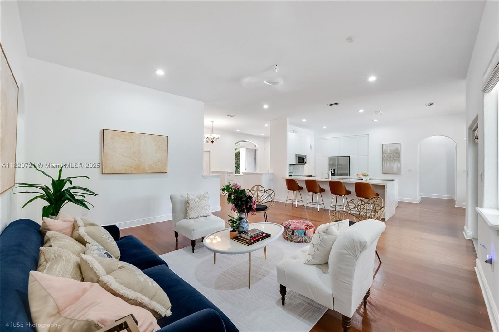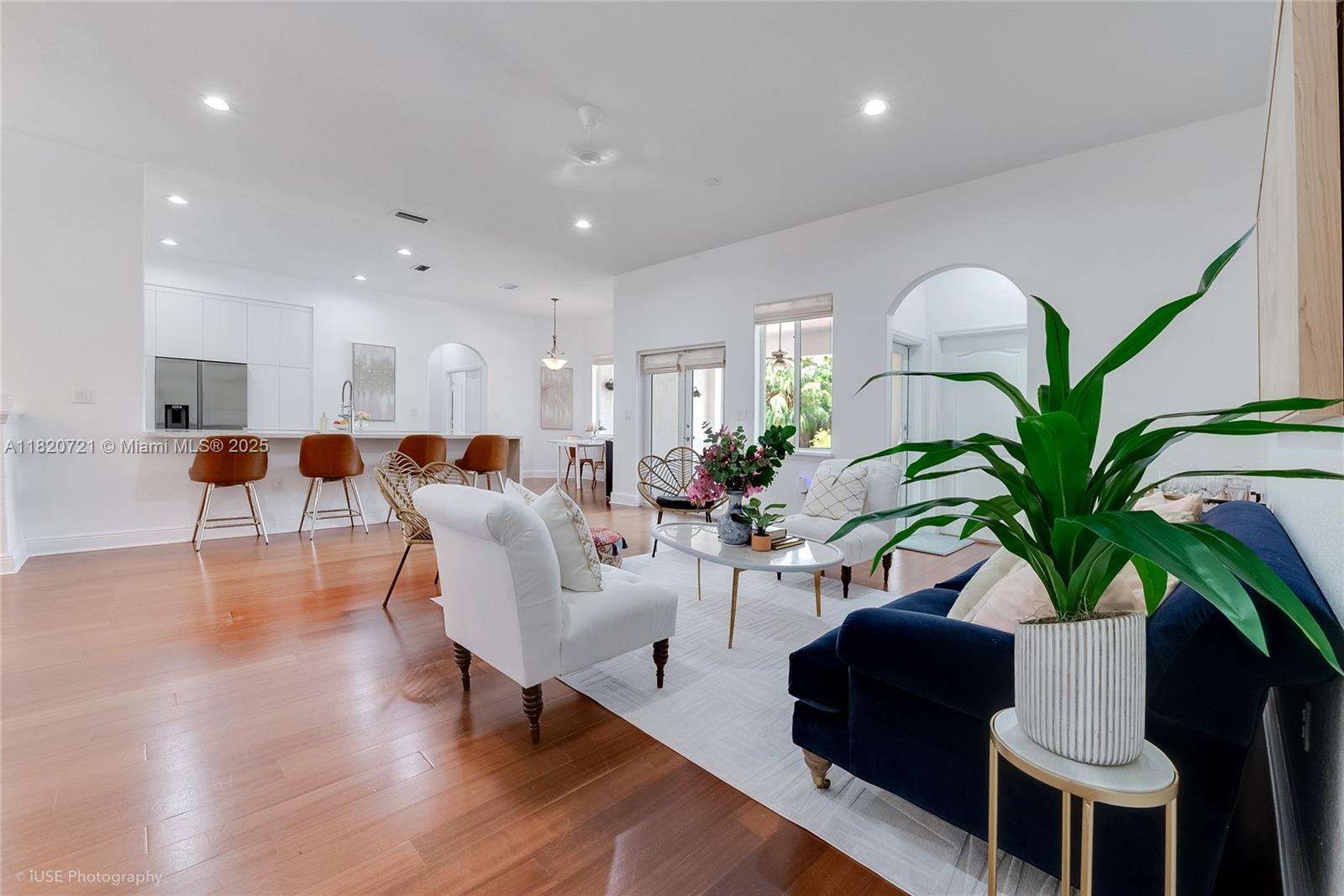 Welcome to your private oasis in the heart of Palmetto Bay! This bright, modern 4/3 home features soaring ceilings, warm wood floors, & a stunning open layout. The sleek kitchen boasts quartz waterfall counters & a spacious island - perfect for entertaining (wine fridge & cigar humidor included). A separate family or play room offers space AC'd square footage or can be easily used as a garage, while the spa-like primary suite stuns with a soaking tub & double vanity. Step outside to a lush, tropical backyard with a heated, salt water pool & covered patio—ideal for relaxing or hosting under the Florida sun.