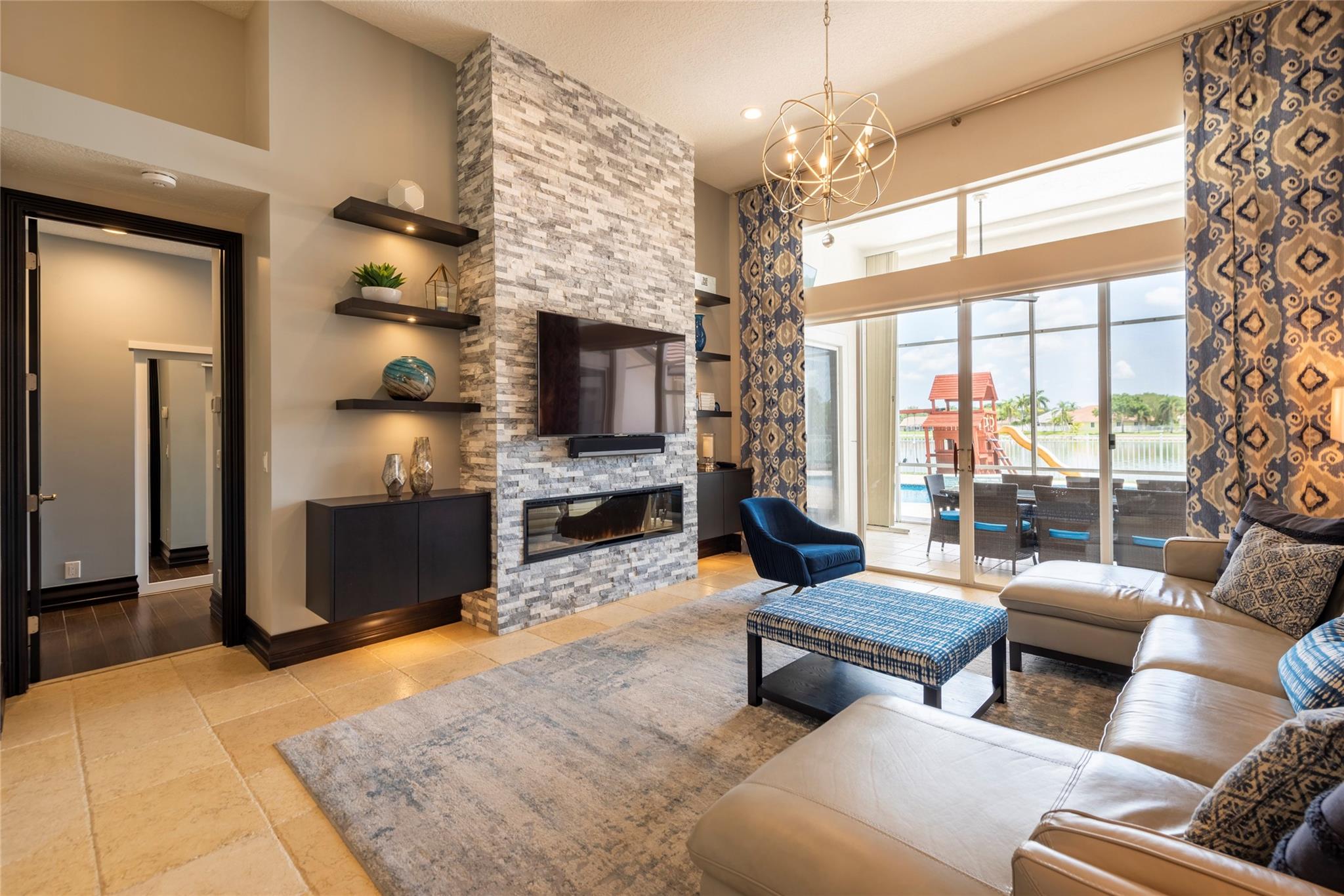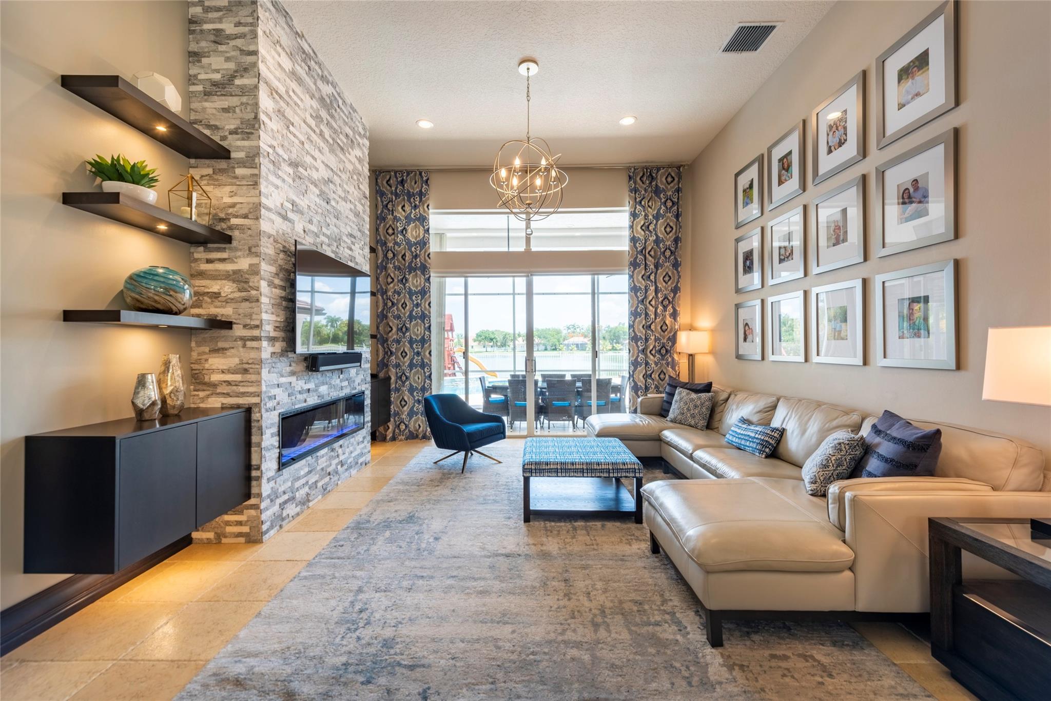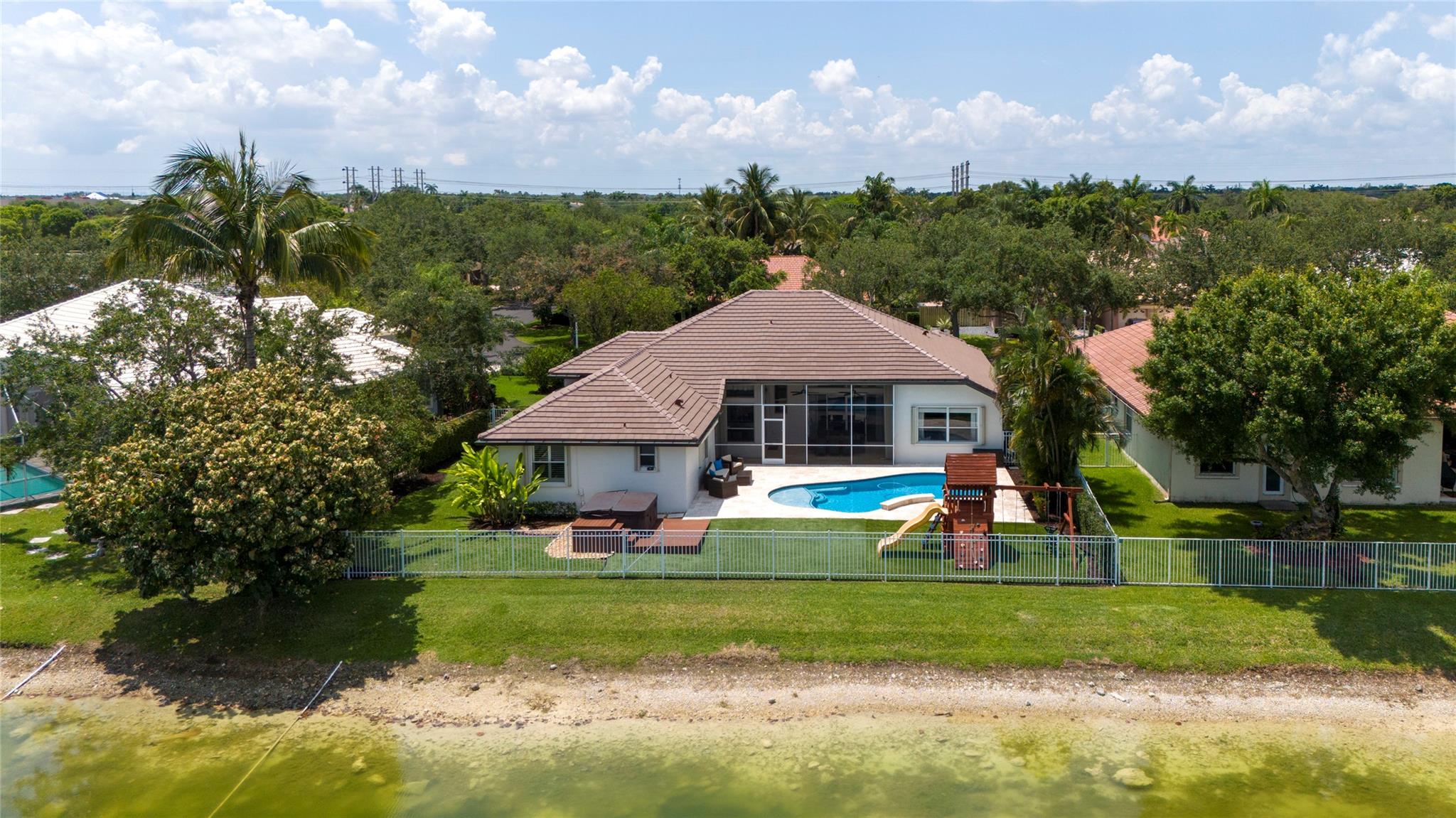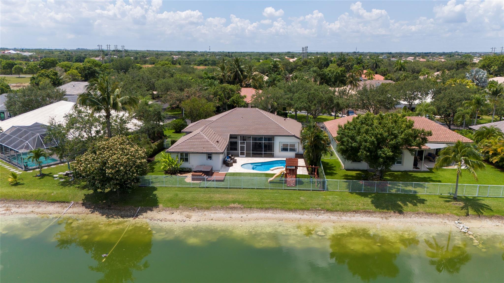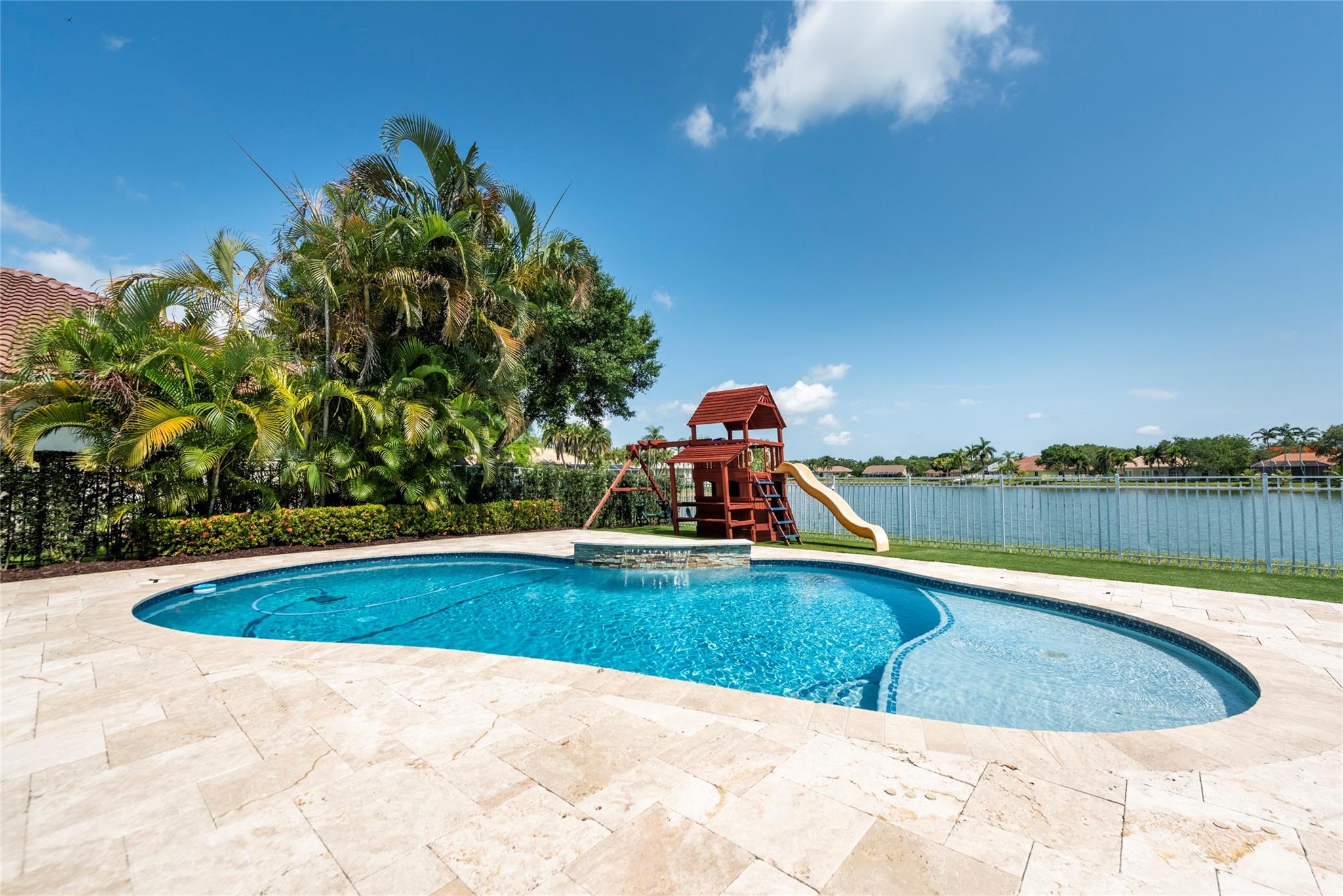 Stunning 5BR/3BA waterfront estate home in premium gated community. A new flat tile roof & front impact windows & doors highlight the substantial upgrades. The interior features a spacious open layout, soaring ceilings, renovated bedrooms & bathrooms, & amazing water views. The gourmet kitchen offers an over-sized island, granite countertops, stainless steel appliances, & custom cabinetry. The separate living & family rooms feature custom TV walls & an electronic fireplace, perfect for upscale entertaining or everyday family comforts. The private primary suite offers dual walk-in closets w/organizers, a luxurious ensuite bath & serene lake/pool views. Enjoy true resort-style, waterfront living w/renovated pool/waterfall & lush landscaping. Fenced yard. Newly paved streets, A-rated schools.