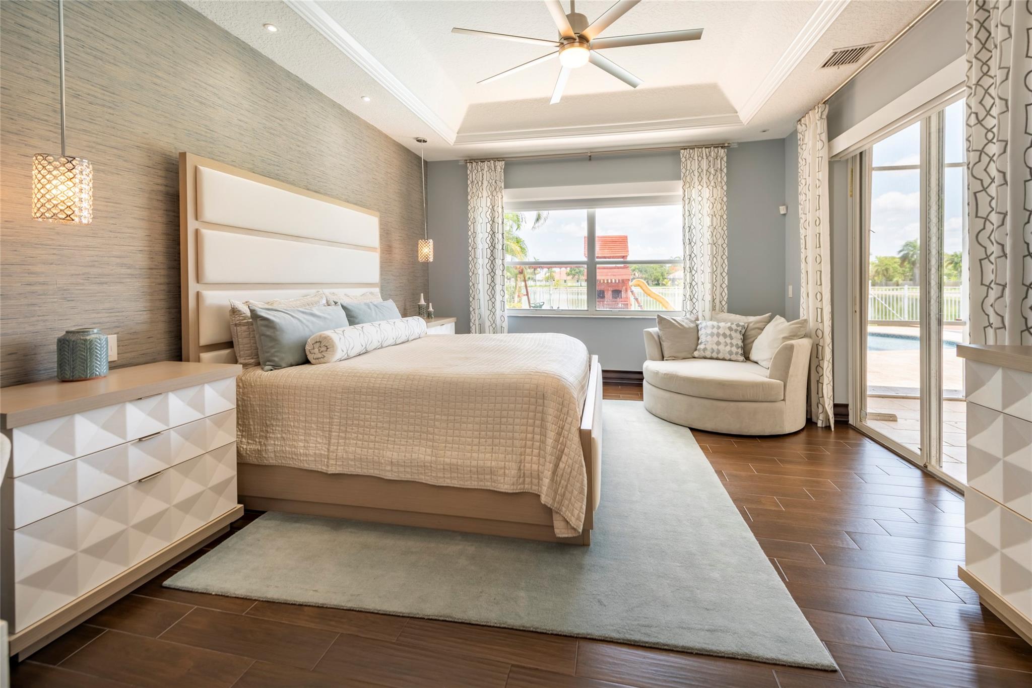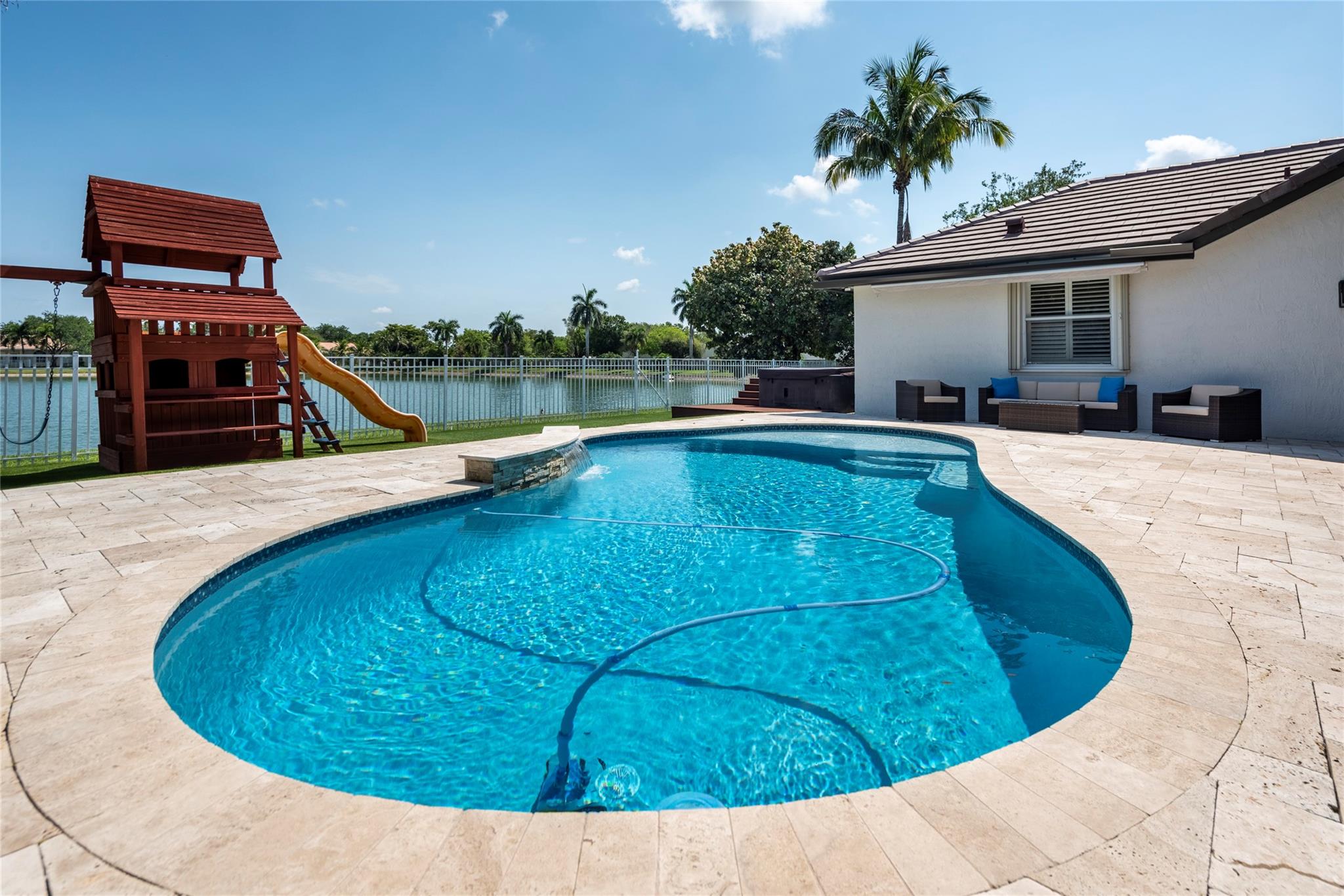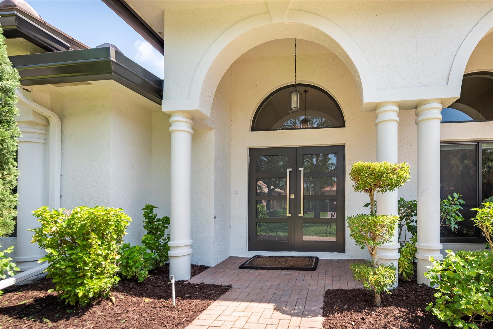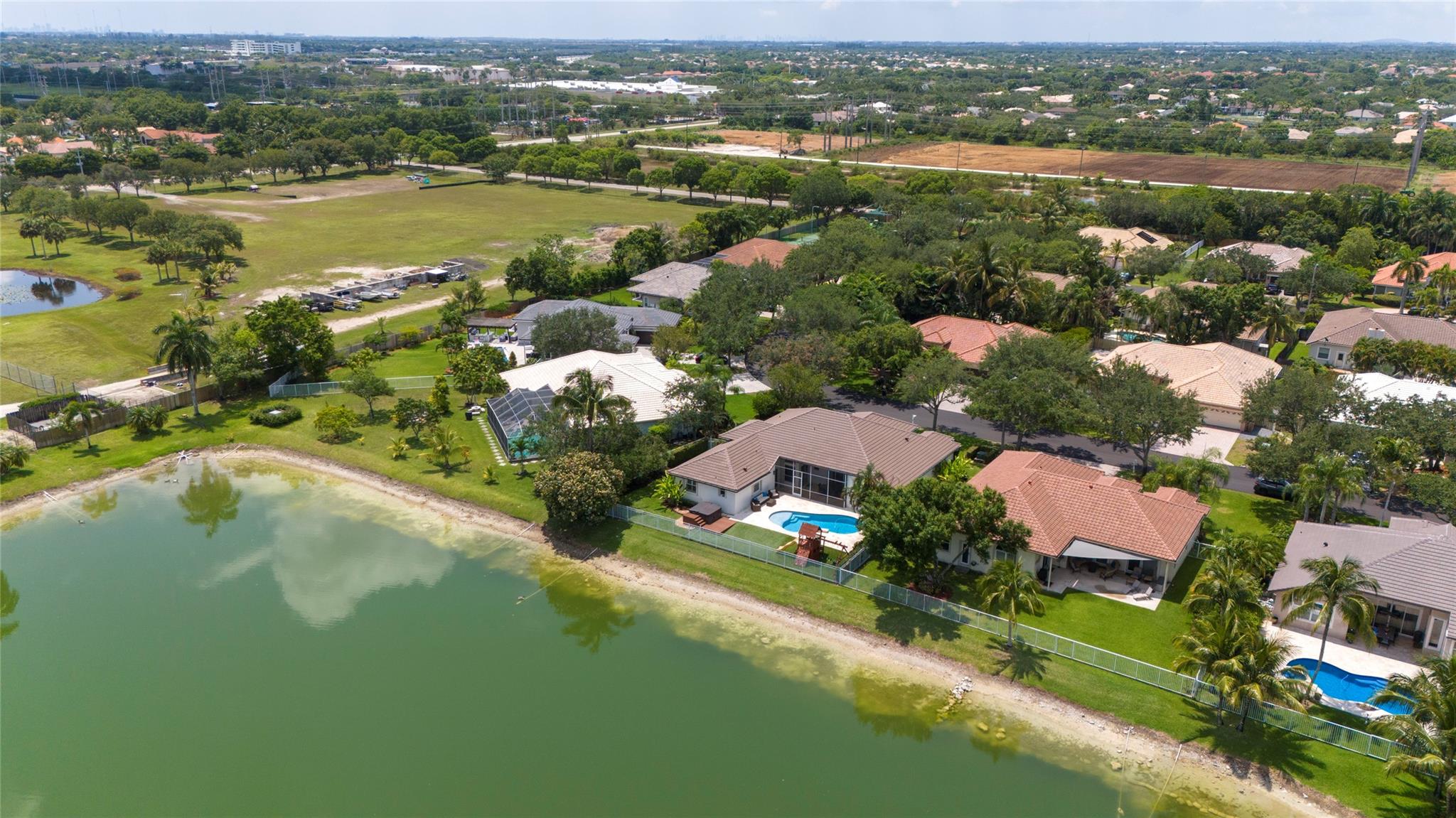Stunning 5BR/3BA waterfront estate home in premium gated community. A new flat tile roof & front impact windows & doors highlight the substantial upgrades. The interior features a spacious open layout, soaring ceilings, renovated bedrooms & bathrooms, & amazing water views. The gourmet kitchen offers an over-sized island, granite countertops, stainless steel appliances, & custom cabinetry. The separate living & family rooms feature custom TV walls & an electronic fireplace, perfect for upscale entertaining or everyday family comforts. The private primary suite offers dual walk-in closets w/organizers, a luxurious ensuite bath & serene lake/pool views. Enjoy true resort-style, waterfront living w/renovated pool/waterfall & lush landscaping. Fenced yard. Newly paved streets, A-rated schools.