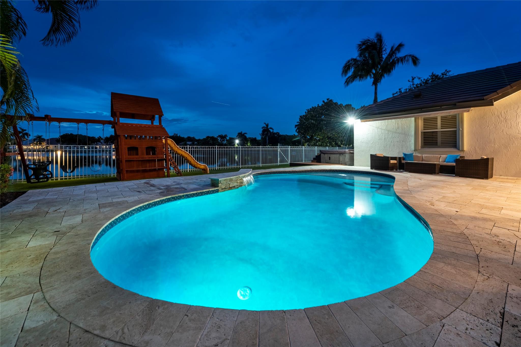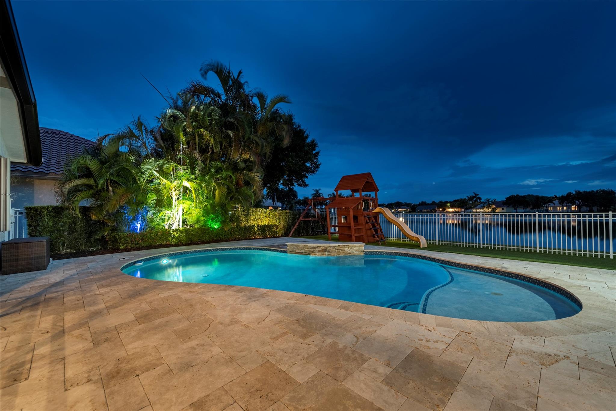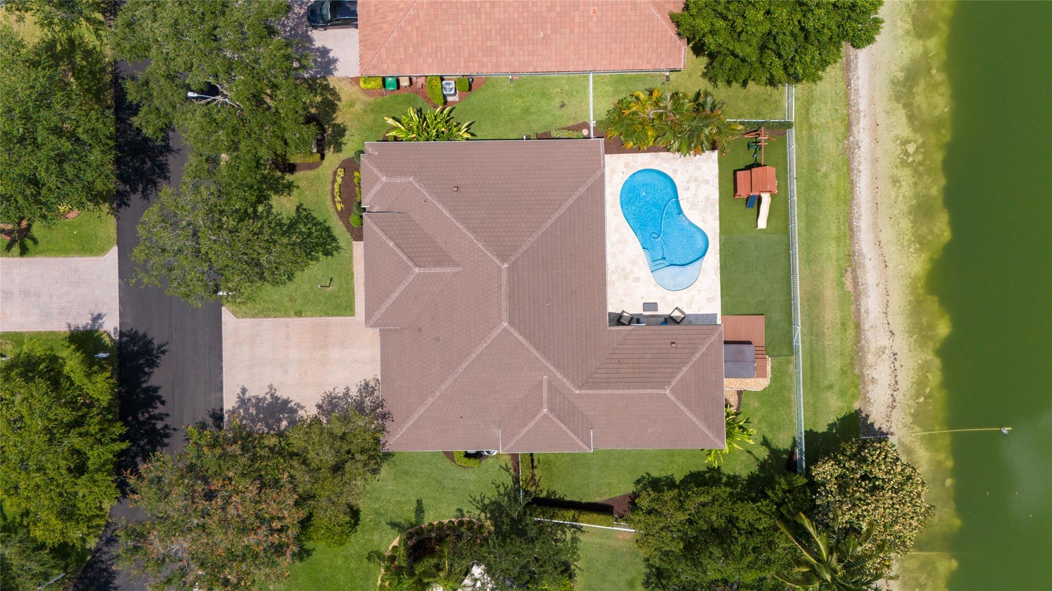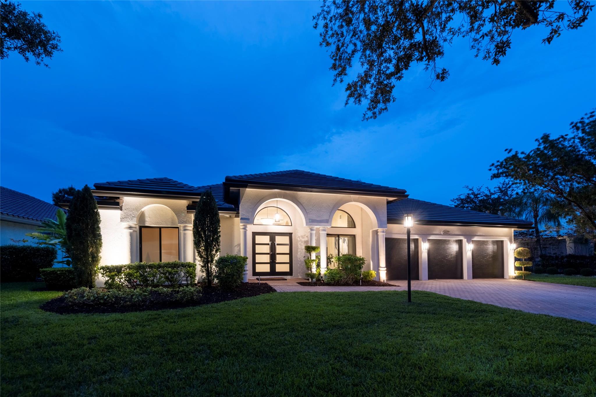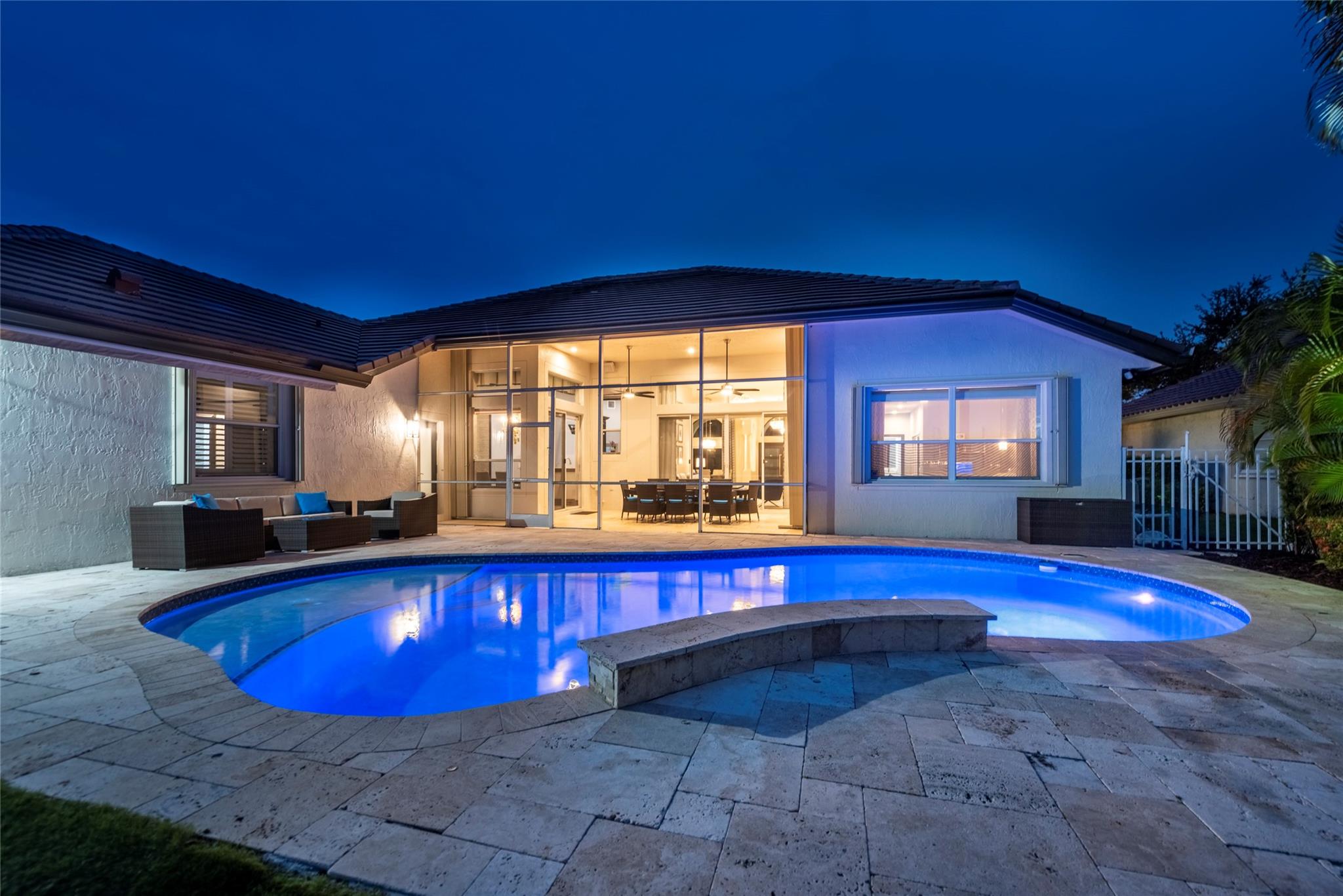 Stunning 5BR/3BA waterfront estate home in premium gated community. A new flat tile roof & front impact windows & doors highlight the substantial upgrades. The interior features a spacious open layout, soaring ceilings, renovated bedrooms & bathrooms, & amazing water views. The gourmet kitchen offers an over-sized island, granite countertops, stainless steel appliances, & custom cabinetry. The separate living & family rooms feature custom TV walls & an electronic fireplace, perfect for upscale entertaining or everyday family comforts. The private primary suite offers dual walk-in closets w/organizers, a luxurious ensuite bath & serene lake/pool views. Enjoy true resort-style, waterfront living w/renovated pool/waterfall & lush landscaping. Fenced yard. Newly paved streets, A-rated schools.