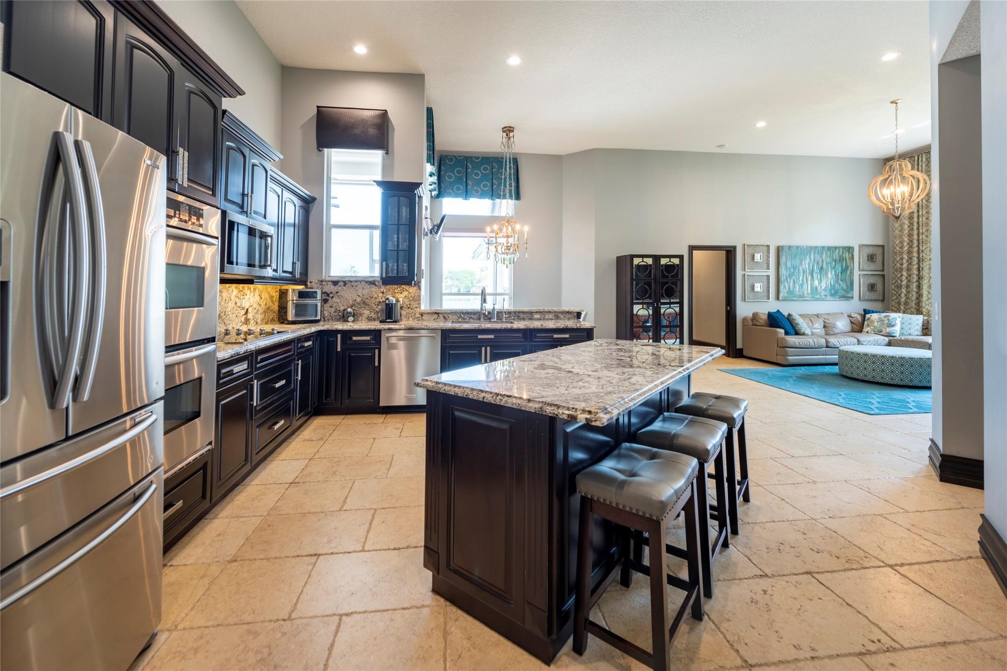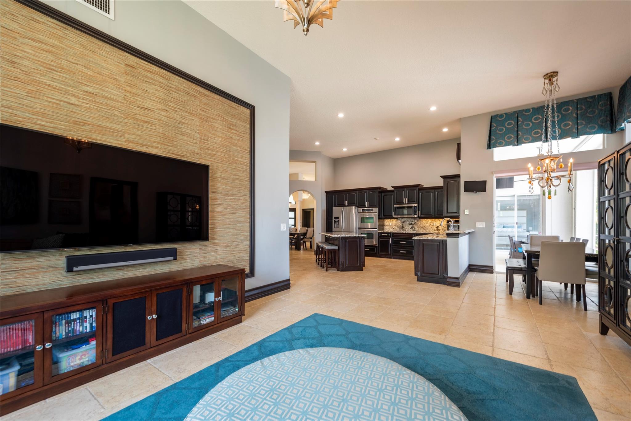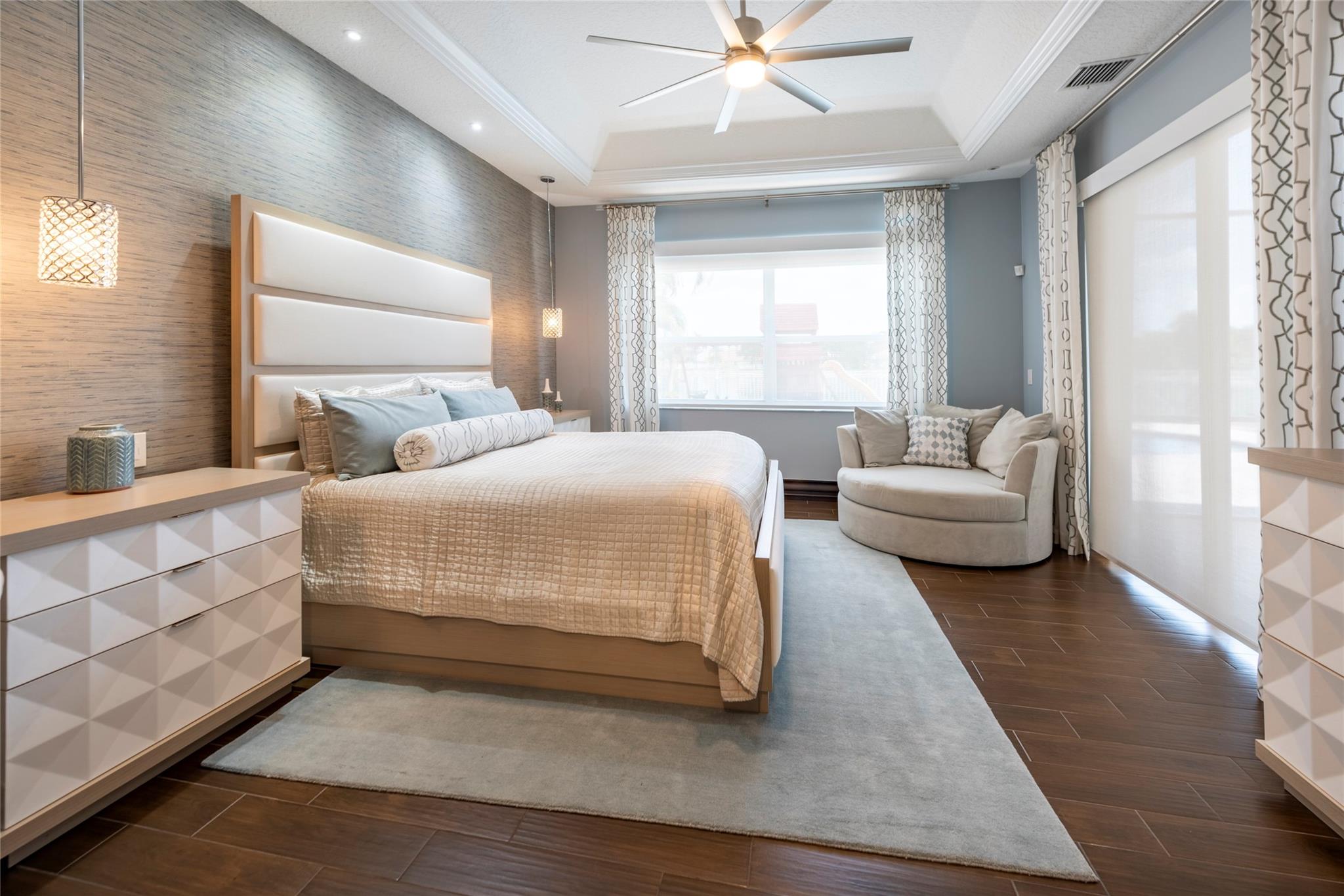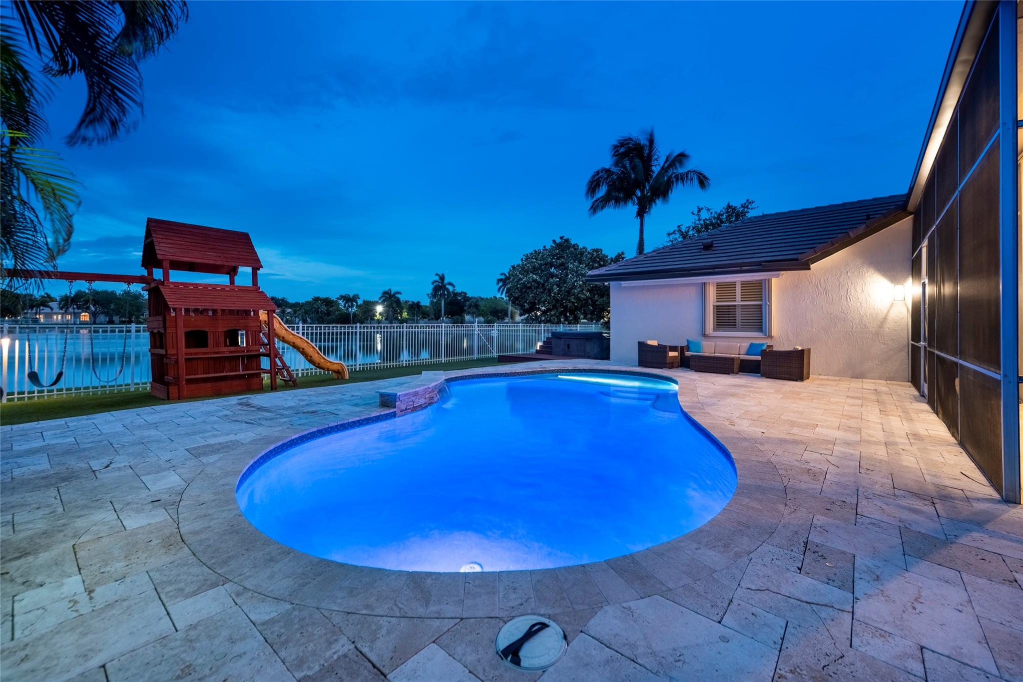 Stunning 5BR/3BA waterfront estate home in premium gated community. A new flat tile roof & front impact windows & doors highlight the substantial upgrades. The interior features a spacious open layout, soaring ceilings, renovated bedrooms & bathrooms, & amazing water views. The gourmet kitchen offers an over-sized island, granite countertops, stainless steel appliances, & custom cabinetry. The separate living & family rooms feature custom TV walls & an electronic fireplace, perfect for upscale entertaining or everyday family comforts. The private primary suite offers dual walk-in closets w/organizers, a luxurious ensuite bath & serene lake/pool views. Enjoy true resort-style, waterfront living w/renovated pool/waterfall & lush landscaping. Fenced yard. Newly paved streets, A-rated schools.
